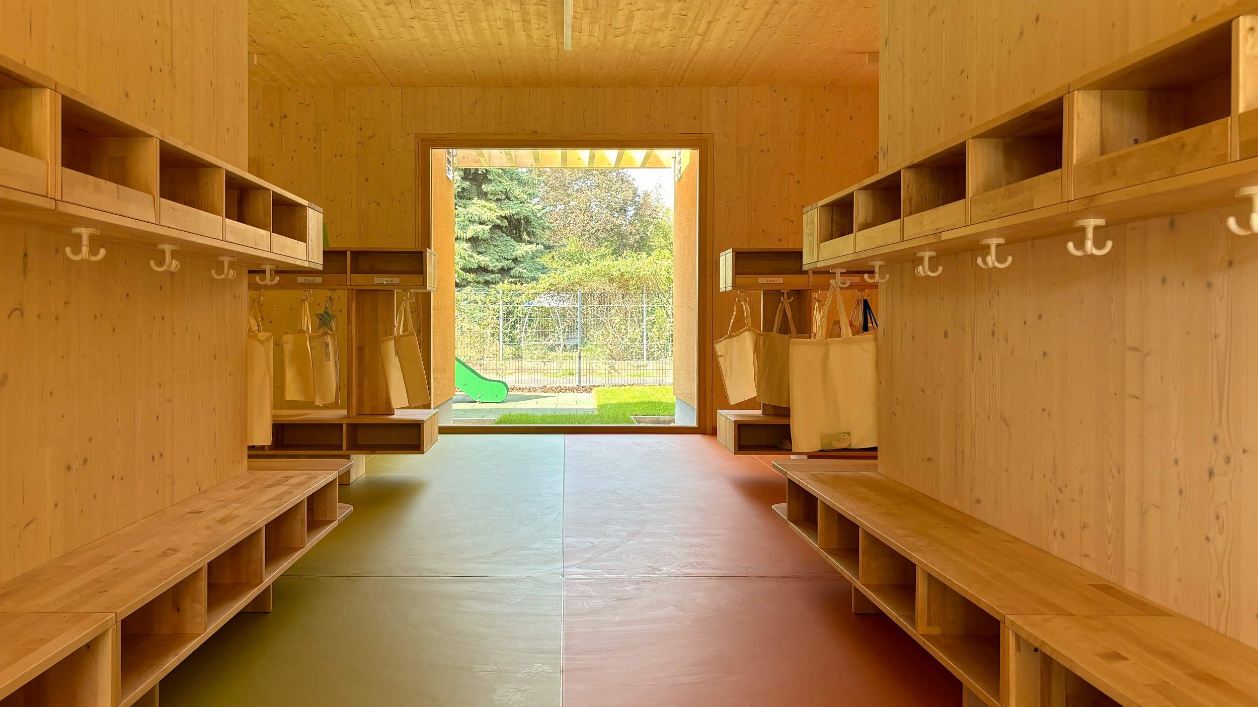 Der Kindergarten ist für vier Gruppen konzipiert und befindet sich auf einem ebenerdigen Grundstück. Die Erschließung erfolgt über einen zentral gelegenen Vorplatz, der durch einen Baum mit Sitzbank gestaltet ist. Das Gebäude wird in Massivholzbauweise errichtet, wobei die erdberührte Bodenplatte aus Beton besteht. Die Fassade ist mit einer Putzoberfläche über einer Holzfaserdämmung versehen. Der Baukörper ist sowohl in der Höhe als auch in der Tiefe gestaffelt. Trotz eines geringen Flächenverbrauchs bietet das Gebäude eine großzügige Raumwirkung. Für eine nachhaltige Energieversorgung sorgen eine Photovoltaikanlage, eine Tiefenbohrung mit Wärmepumpe sowie eine mechanische Lüftungsanlage.