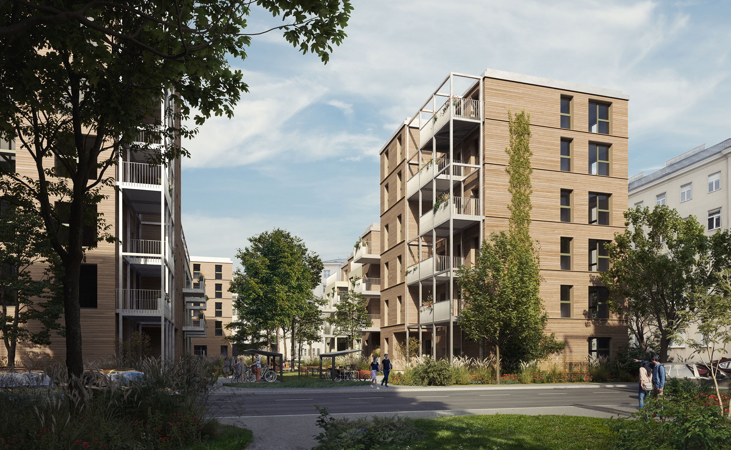 Die Quartiersentwicklung Baumstadt-Floridsdorf ist bemüht auf ressourcenschonende, nachhaltige und ökologische Baumaßnahmen zu setzen. So bleibt von dem Bestand mehr als 50 Prozent stehen und diese Gebäudeteile werden ressourcenschonend instandgesetzt. Um die thermischen Maßnahmen zu erreichen, werden die Bestandsgebäude gedämmt und erhalten neue Fenster mit Dreifachverglasung. Der Zubau bzw. die Aufstockung erfolgt in Holz-Hybridbauweise. So wird beim Zubau die Tragkonstruktion in Stahlbeton hergestellt, aber alle Außenwände als Holzriegelwände mit Mineralwolldämmung und einer sichtbaren Holzfassade hergestellt. Wie der Name dieser Quartiersentwicklung schon sagt, wird auf die Außenanlagen besonders viel Wert gelegt. So werden alle Dächer extensiv bzw. intensiv begrünt.