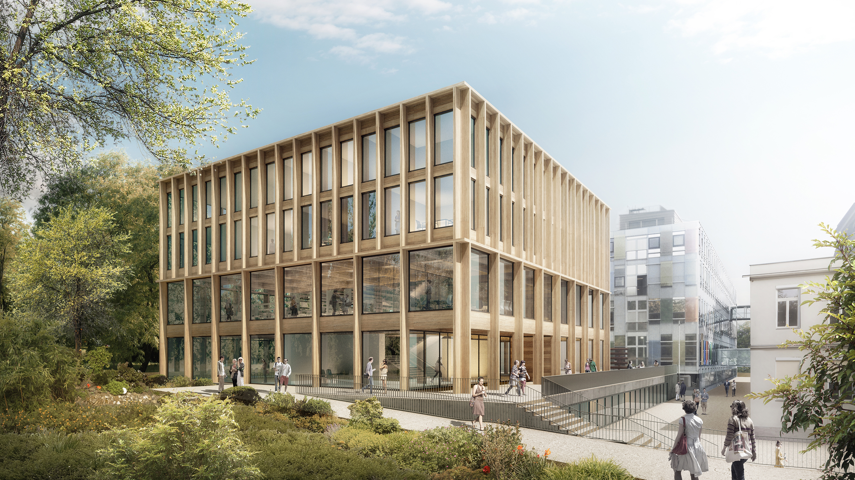 Im Sinne der Nachhaltigkeit wurde neben der Holzbauweise vor allem die Kompaktheit des Baukörpers hinsichtlich Energieeffizienz berücksichtigt. Das Erscheinungsbild ist geprägt von der Holzkonstruktion, die Fassadenoberflächen bleiben unbehandelt. Die Tragstruktur wird zum Gestaltungselement, über raumhohe Verglasungen wird ein Dialog zwischen Innenraum und Umgebung hergestellt. Durch das Öffnen einzelner Elemente kann je nach Jahreszeit auch der angehobene Platz als Terrasse, Marktplatz oder Treffpunkt für Studierende genutzt werden. Abgesehen vom zum Teil erdberührtem Sockel und dem Stiegenhaus (Brandschutz) ist das gesamte Gebäude aus vorgefertigten Holzelementen konstruiert. Neben allen ökologischen Vorteilen eines Holzbaues ist insbesondere die kurze Errichtungsdauer anzuführen.