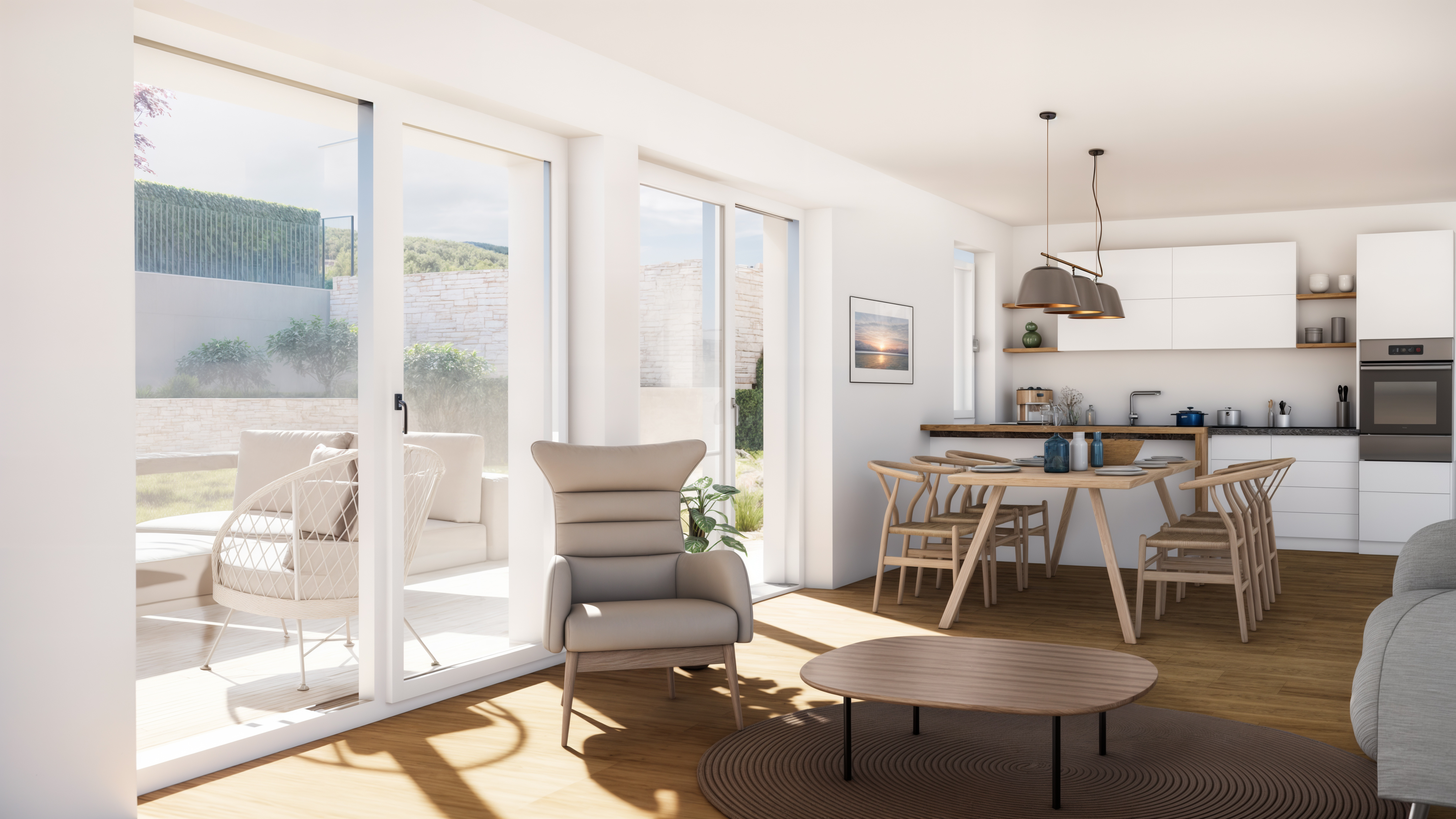 Am Hartlsteig – Hoher Nußbaumweg in 7000 Eisenstadt entsteht eine moderne Wohnanlage bestehend aus zwei Doppelhäusern mit insgesamt vier hochwertig ausgeführten Wohneinheiten. Die Gebäude überzeugen durch klare Architektur, funktionale Grundrisse sowie großzügige private Außenbereiche. Jede Einheit verfügt über zwei Stellplätze, teilweise mit Carports, und wird über einen überdachten Zugang erschlossen. Die Wohnbereiche öffnen sich zu einer Terrasse mit anschließend terrassierten Mietergärten, die aufgrund der Hanglage mittels Naturstein- und Stützmauern strukturiert werden. Die Objekte werden in energieeffizienter Massivbauweise errichtet und mit einer Wärmepumpe, Photovoltaikanlage und mechanischer Entlüftung ausgestattet.