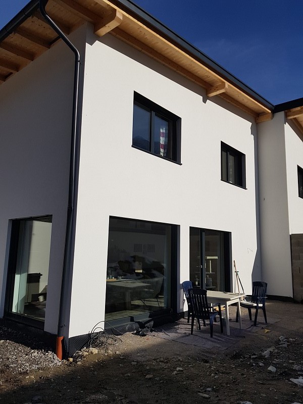 Einfamilienhaus nicht unterkellert, mit Garage. Luft-Wasser Wärmepumpe mit kontrollierter Wohnraumlüftung. Kunststoff-Alu-Fenster, Dreifachverglasung.