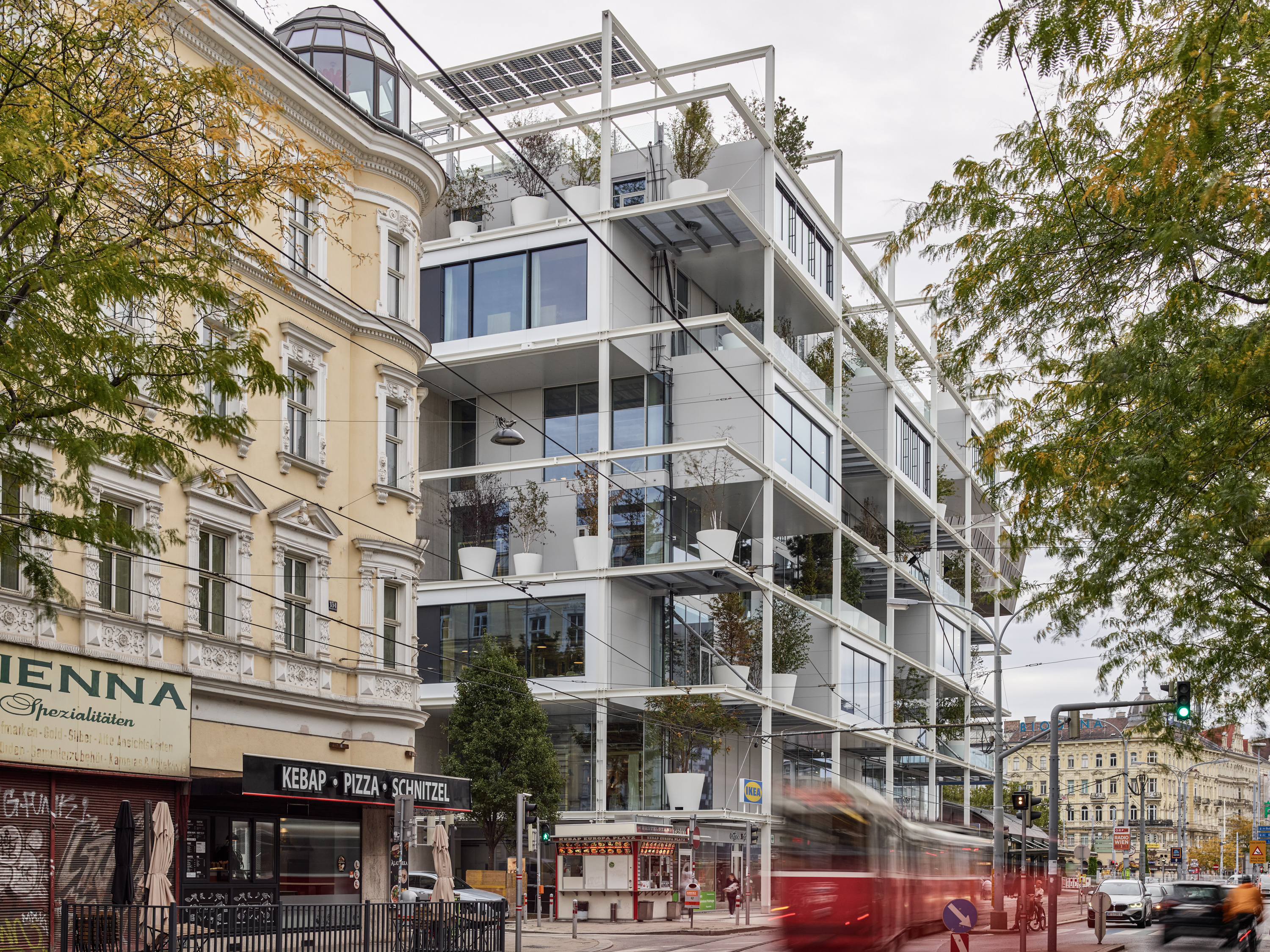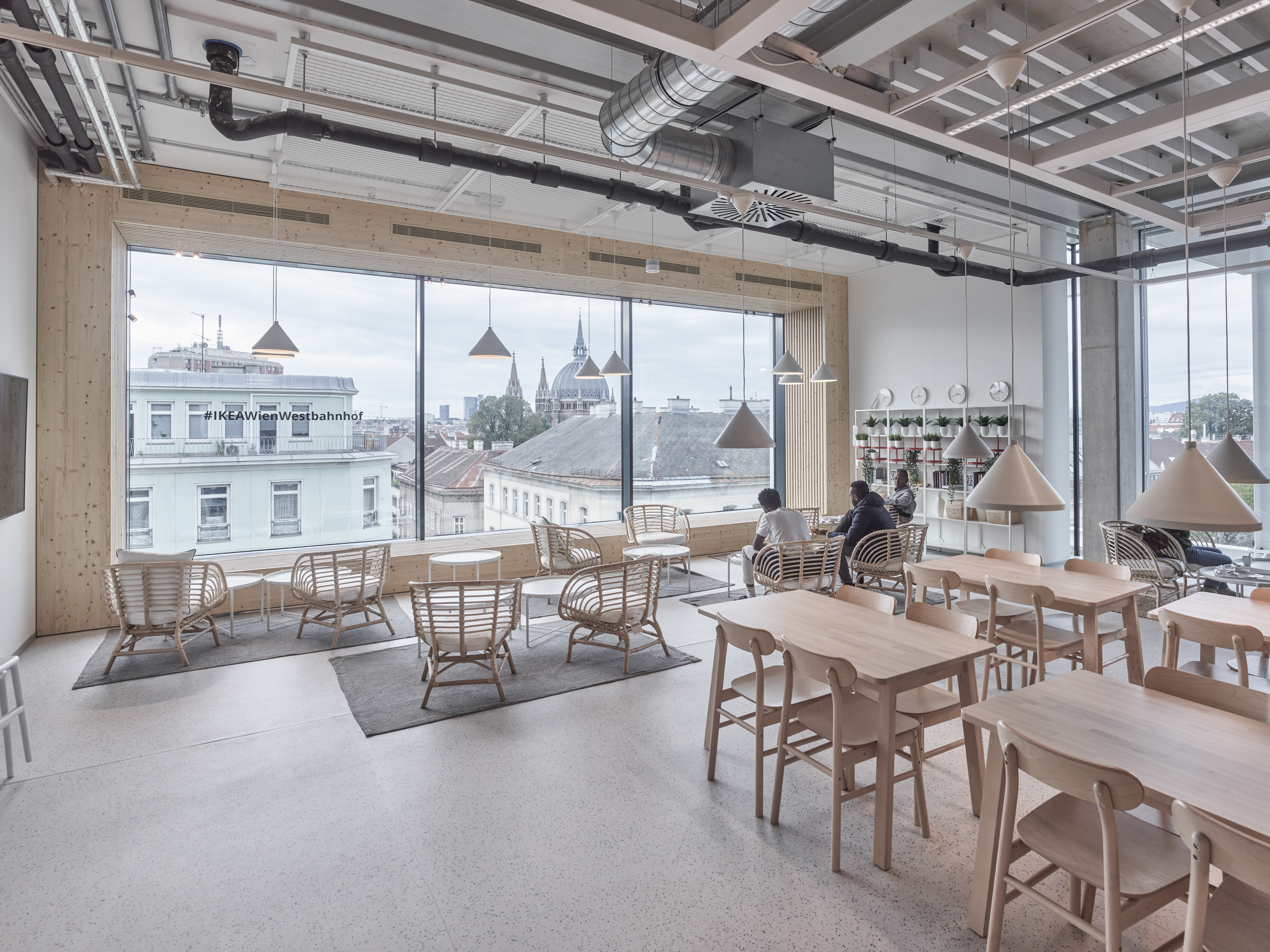 Im Gegensatz zur blauen Kiste am Stadtrand ist der neue City-Ikea am Westbahnhof ein offenes, durchgrüntes Haus voller Ein- und Ausblicke. Der Kern des Gebäudes ist von einem weißen Stahlgrid umhüllt, in dem immer wieder Erker und Pflanzenbalkone mit Laub- und Nadelbäumen zu finden sind. Dank Fernwärme, Bauteilaktivierung, großzügiger Versorgung mit Tageslicht, baulichen Verschattungsmaßnahmen und seiner einfachen, flexiblen Baustruktur, die zu einem späteren Zeitpunkt auch alternative Nutzungen zulässt, verbraucht das Gebäude weniger Ressourcen als vergleichbare Möbelhäuser. Zu den publikumswirksamsten Maßnahmen zählen die öffentlich begehbare Dachterrasse sowie die Begrünung mit insgesamt 160 Bäumen.