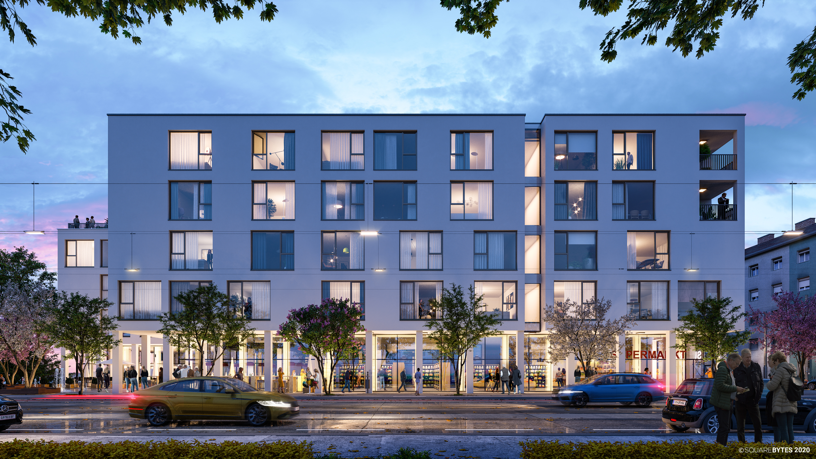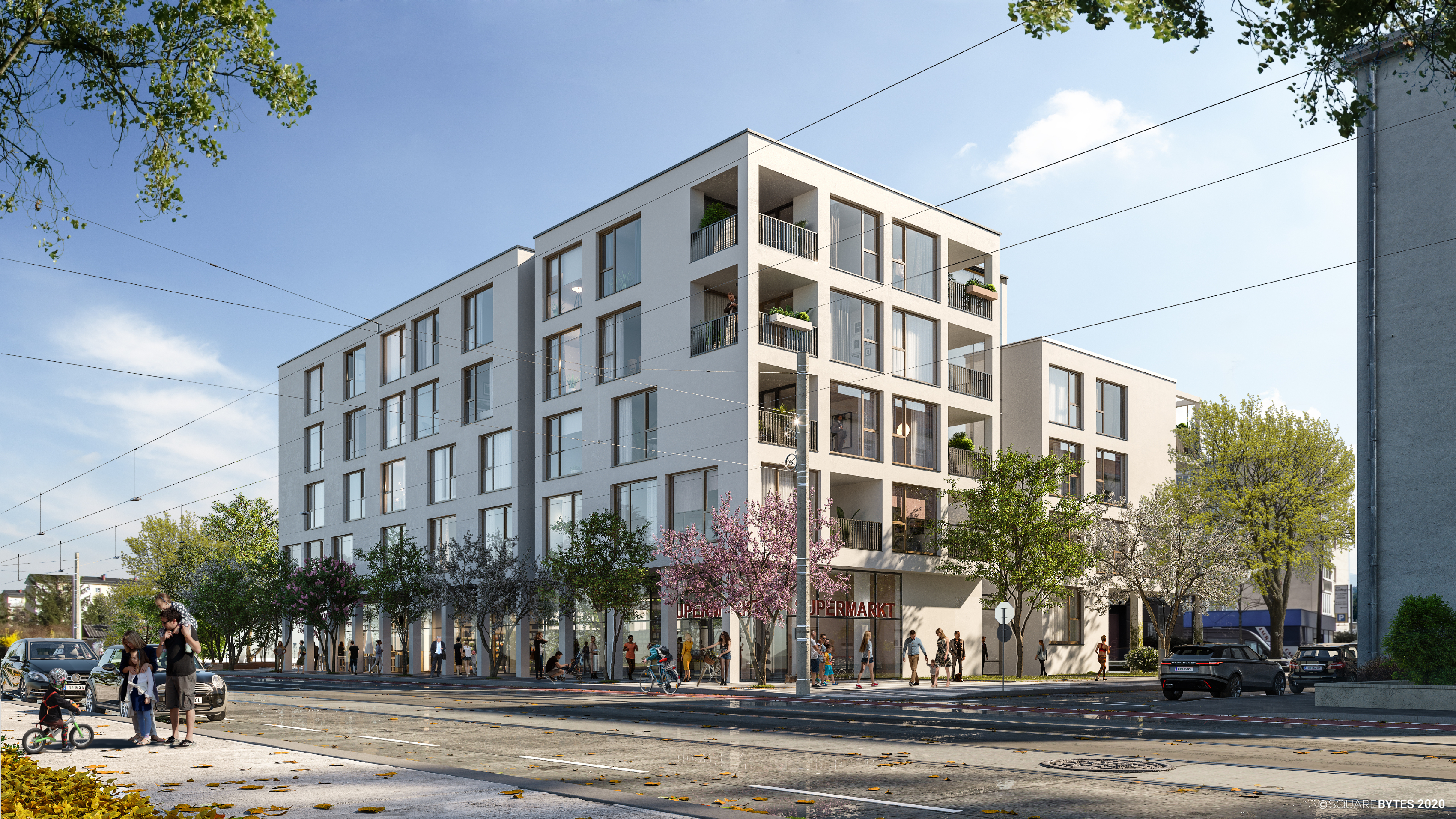 Der Neubau wird gemäß Vorgaben des räumlichen Leitbildes als Blockrandbebauung ausgeführt. Durch die Bebauung entlang der Straßen entsteht ein großzügiger Innenhof als grüner Erholungsraum für alle Bewohner:innen. Das Gebäude gliedert sich in 5 oberirdische Geschoße und eine Tiefgarage. Es weist eine gemischte Nutzung auf: Die Erdgeschoßzone bietet Platz für Büroräumlichkeiten, Geschäftslokale. Die darüberliegenden Wohngeschoße werden über zwei Treppenhäuser mit Lift erreicht. Die horizontale Erschließung der Wohnungen erfolgt über Mittelgangerschließungen und einen dem Innenhof zugewandten Laubengang.