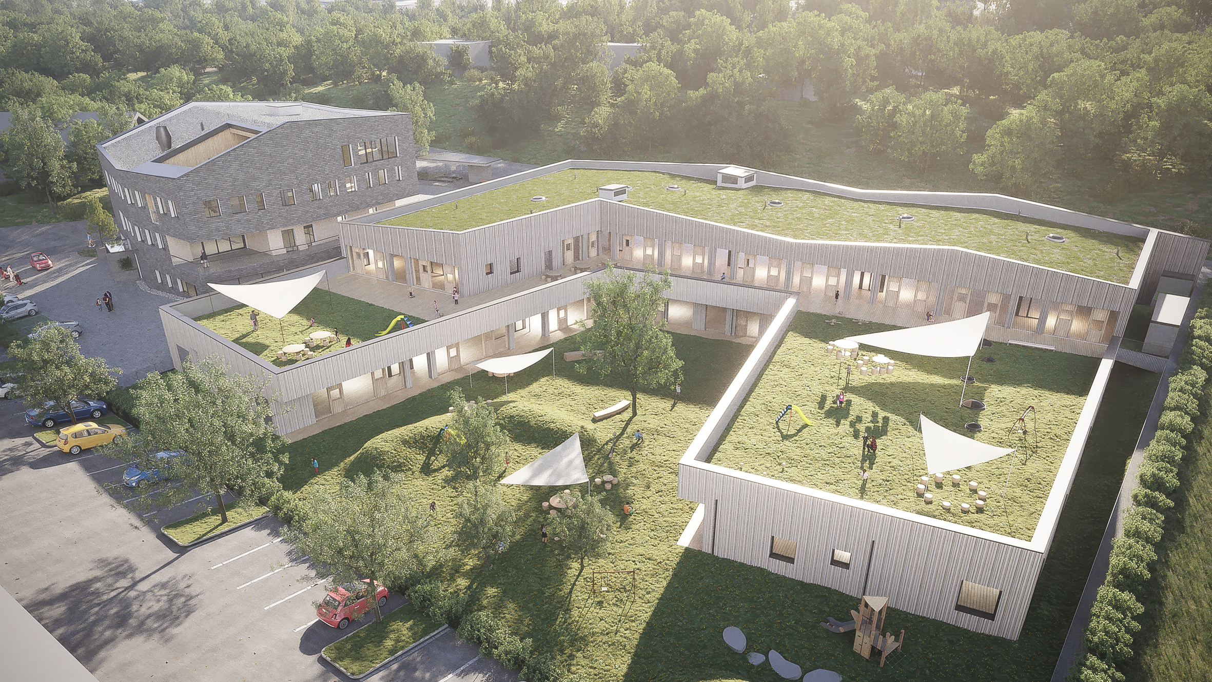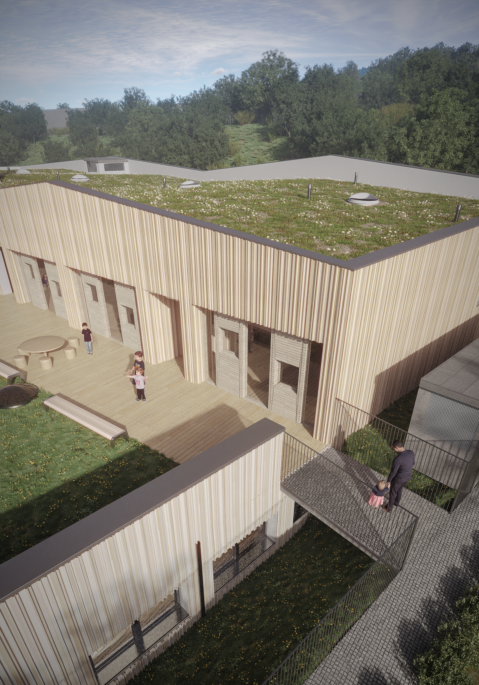 Der Kindergarten im Multifunktionszentrum St. Johann besteht aus einem U-förmigen Baukörper, der teilweise eingegraben auf einem leicht abschüssigen Grundstück nahe der Salzach errichtet wird. Die im Erdgeschoss und ersten Untergeschoss befindlichen Gruppen- und Aufenthaltsräume sind allesamt gartenseitig orientiert. Darunter befindet sich die Tiefgarage, die auch vom nahegelegenen Stadthaus genützt wird. Die tragende Konstruktion wurde hauptsächlich in massiver Holzbauweise ausgeführt, die Innenwände sind zum Teil mit Lehm verputzt. Ein Teil der Terrasse ist begrünt und dient als Spielplatz. Auf dem Dach befindet sich eine PV-Anlage.