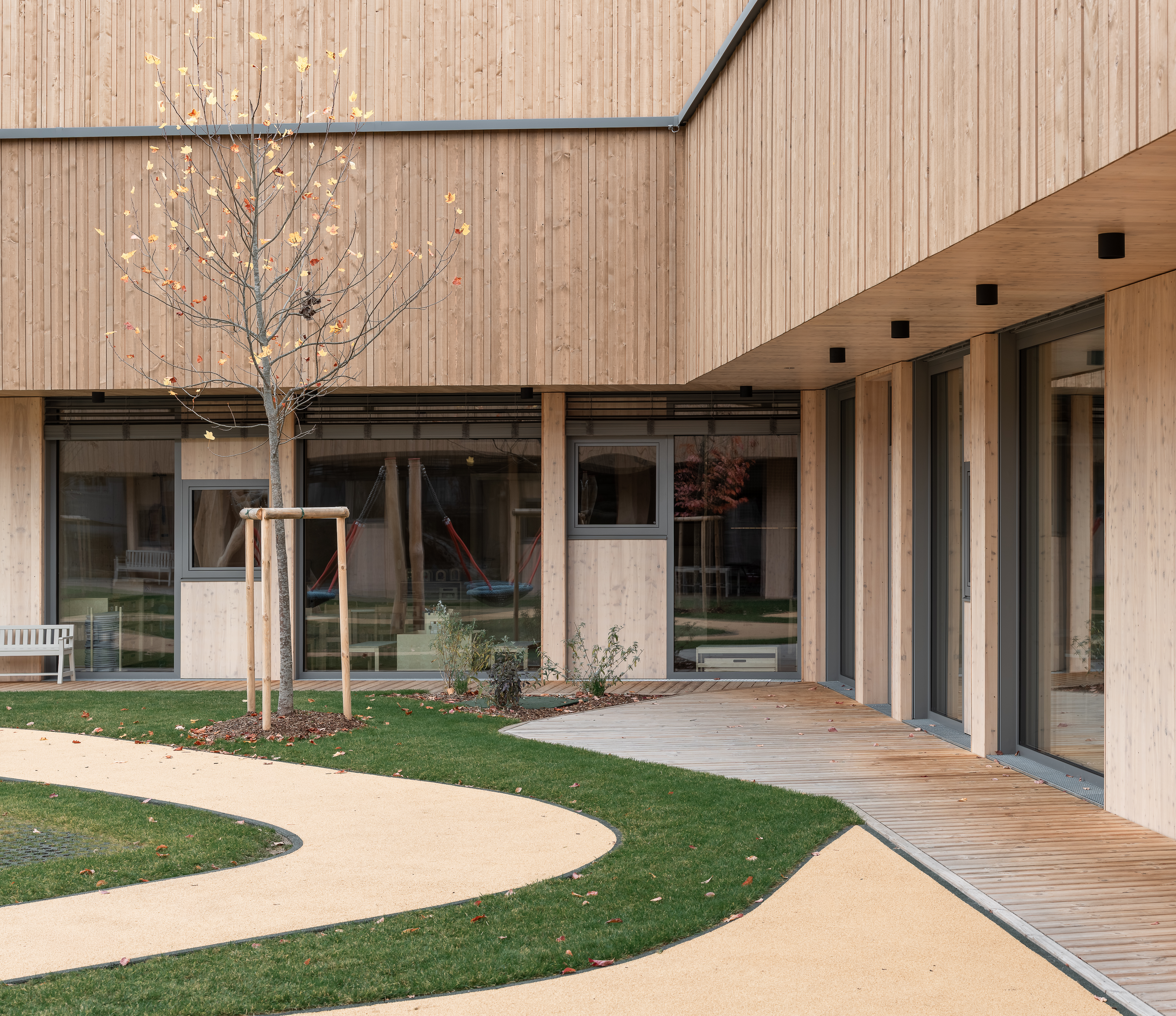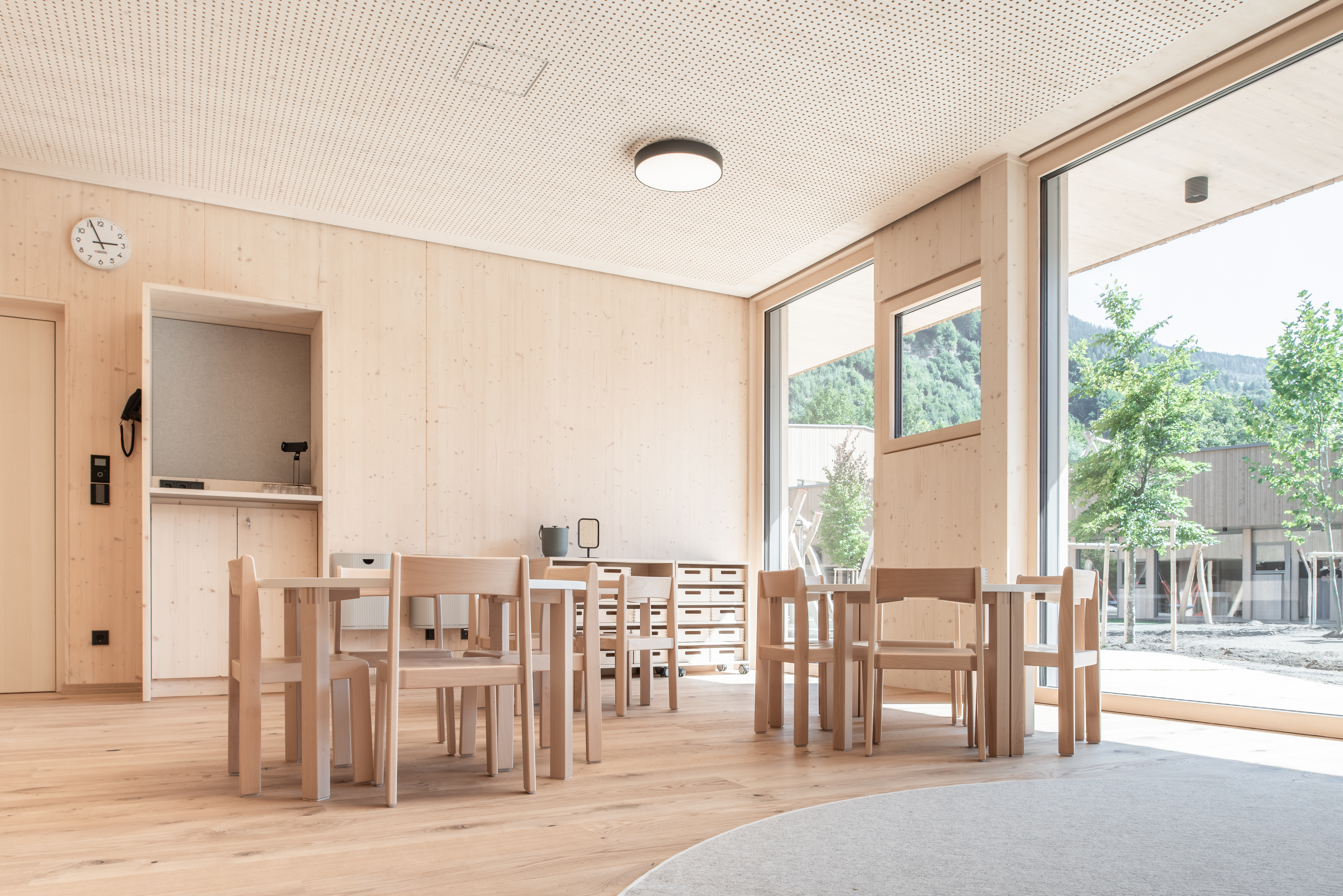 Der Kindergarten im Multifunktionszentrum St. Johann besteht aus einem U-förmigen Baukörper, der teilweise Eingegraben auf einem leicht abschüssigen Grundstück nahe der Salzach errichtet wurde. Die im Erdgeschoss und ersten Untergeschoss befindlichen Gruppen- und Aufenthaltsräume sind allesamt gartenseitig orientiert. Darunter befindet sich die Tiefgarage, die auch vom nahegelegenen Stadthaus genützt wird. Die tragende Konstruktion wurde hauptsächlich in massiver Holzbauweise ausgeführt, die Innenwände sind zum Teil mit Lehm verputzt. Ein Teil der Terrasse ist begrünt und dient als Spielplatz. Auf dem Dach befindet sich eine PV-Anlage.