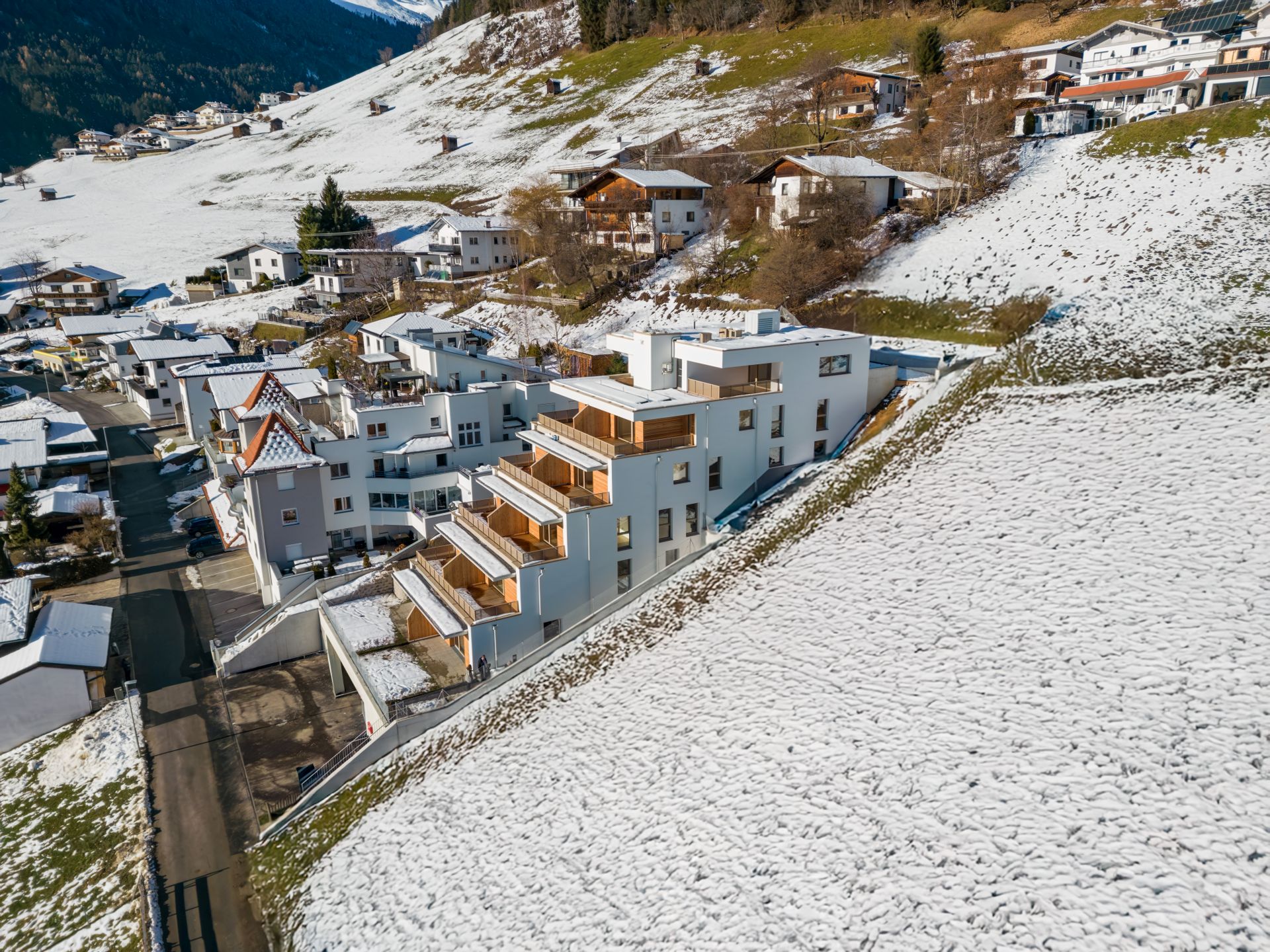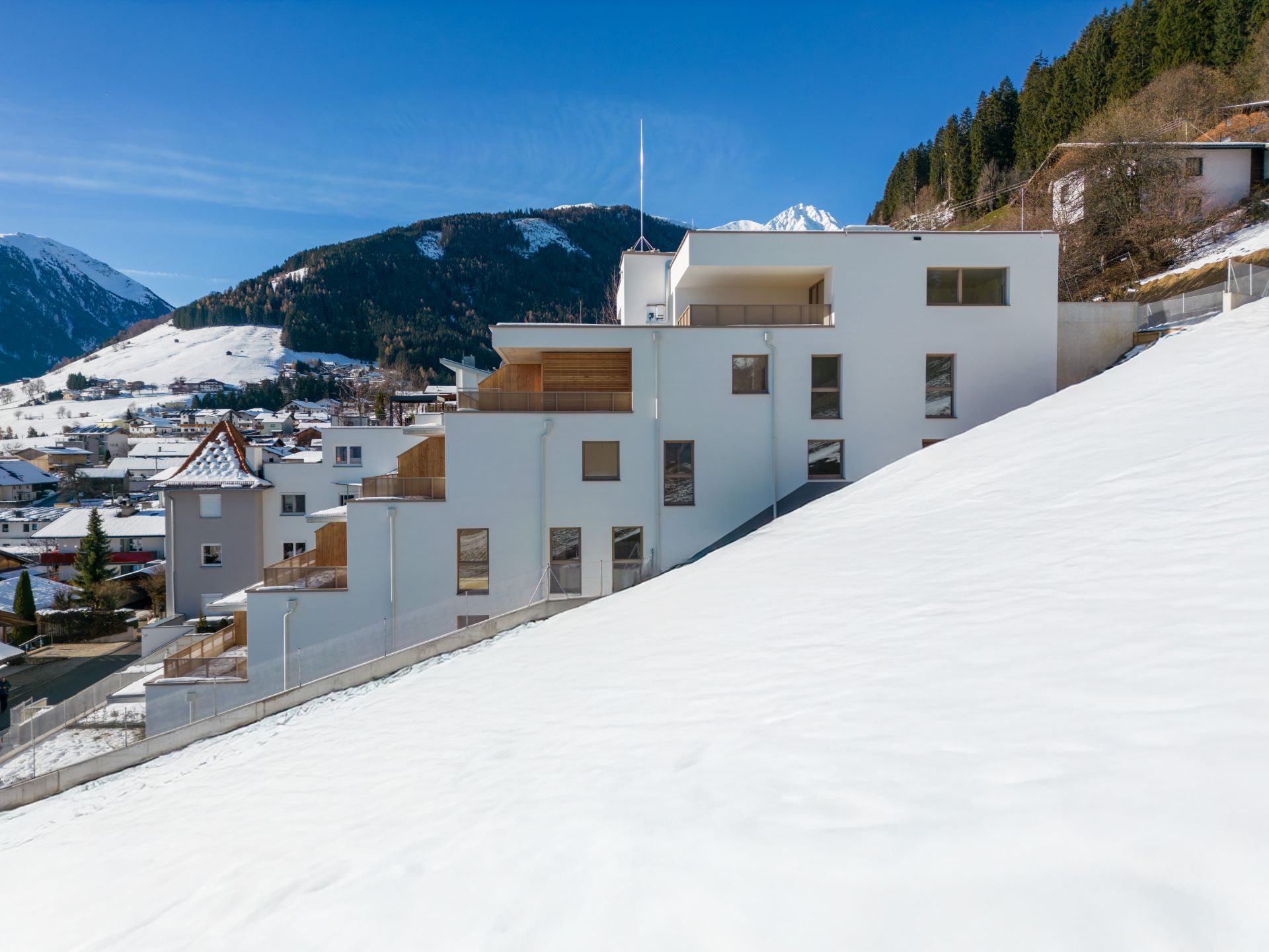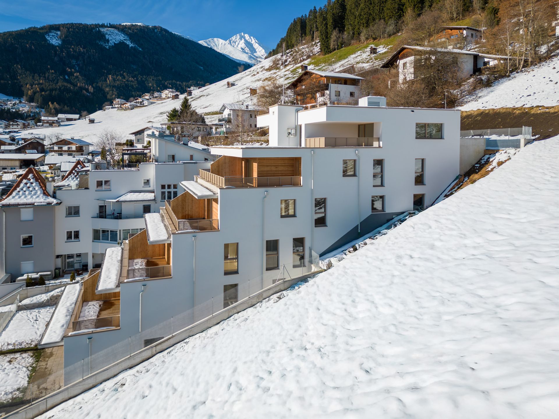 Auf einem, steil von Nord-West nach Süd-Ost abfallenden Grundstück wurde die Wohnanlage terrassenartig mit dem bestehenden Gelände mitlaufend eingefügt.