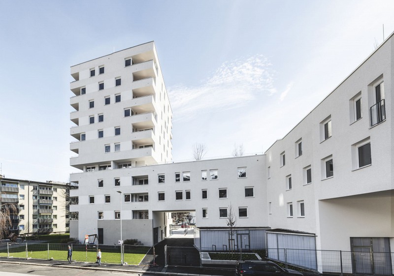 Neubau einer Wohnanlage in Passivhausbauweise mit 88 Mietwohnungen, einem Gemeinschaftsraum, einem Geschäftslokal und 106 Tiefgaragenplätzen. Im 4. OG des Hochhauses befinden sich Dachterrassen, die den Bewohnern Freiflächen und zugeordnete Flächen für urbanen Gartenbau zur Selbstbewirtschaftung bieten. Im 4. OG des Hochhauses wird auch ein Raum für eine gemeinschaftliche Nutzung errichtet.