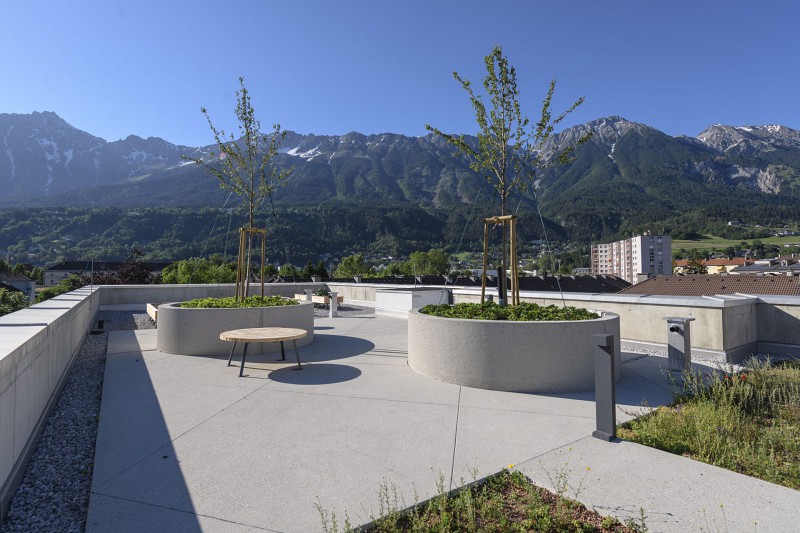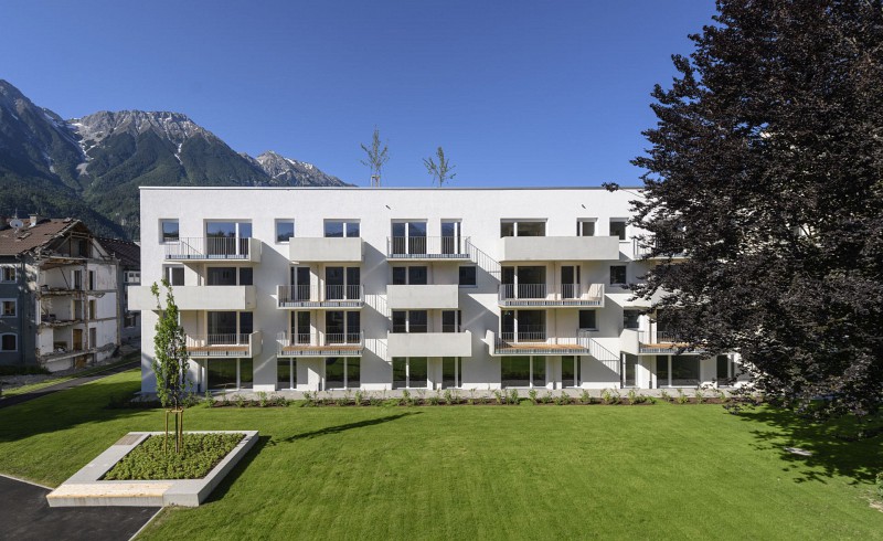 Neubau einer Wohnanlage in Passivhausbauweise mit 88 Mietwohnungen, einem Gemeinschaftsraum, einem Geschäftslokal und 106 Tiefgaragenplätzen. Auf dem Flachdach des Gebäudes befinden sich Dachterrassen, die den Bewohnern Freiflächen und zugeordnete Flächen für urbanen Gartenbau zur Selbstbewirtschaftung bieten.