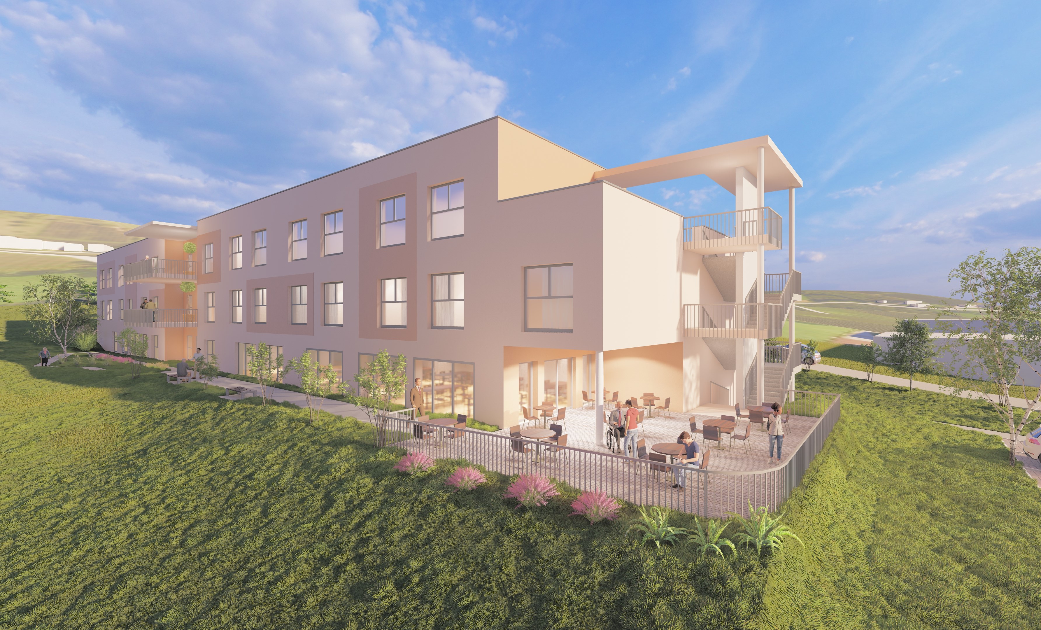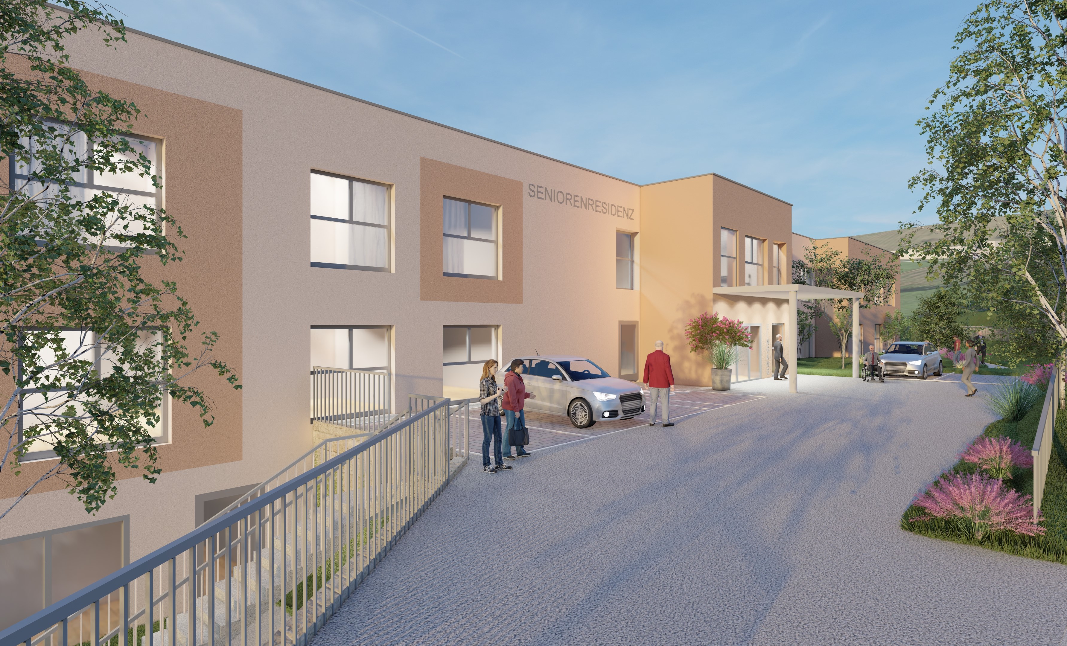 Dreigeschoßiges Altenpflegeheim mit 55 Betten (in 7 Doppel- und 41 Einzelzimmern) mit Flachdach und außenliegenden Fluchttreppen; Wärmepumpe und Photovoltaik mit 45 kWp