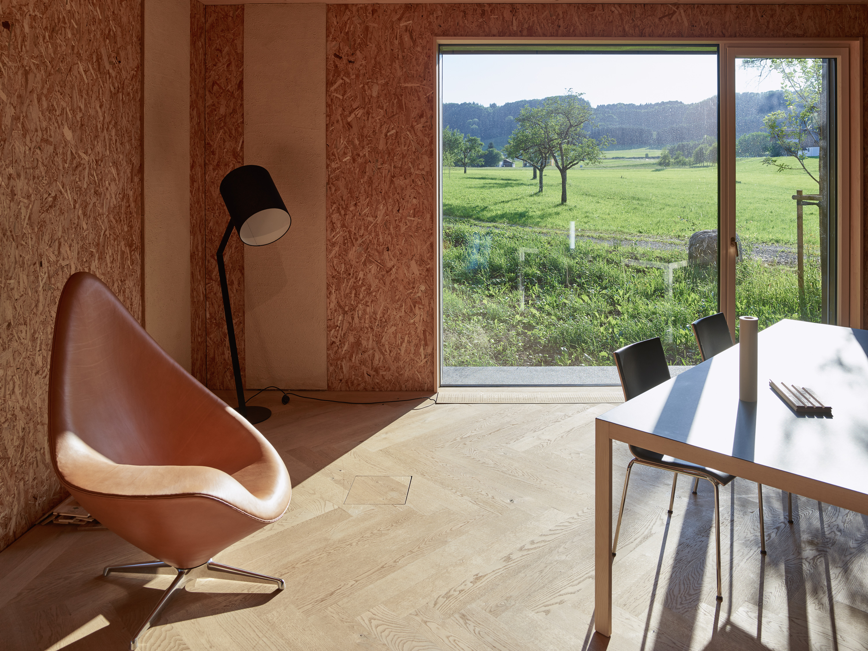 Die eigentliche Gebäudehülle besteht aus mit Zellulose gedämmten Holzriegelwänden, die mit Lärchenholzschindeln verschalt sind. Um den massiven Stampfbetonkern sind die Grundrisse offen und variabel. In Lehmputz integrierte Wandheizungselemente und eine hocheffiziente Lüftungsanlage mit Wärmerückgewinnung garantieren hohen Komfort. Rahmenlose, wärmebrückenfreie Fenster verbinden den Innenraum fließend mit dem Außen.
