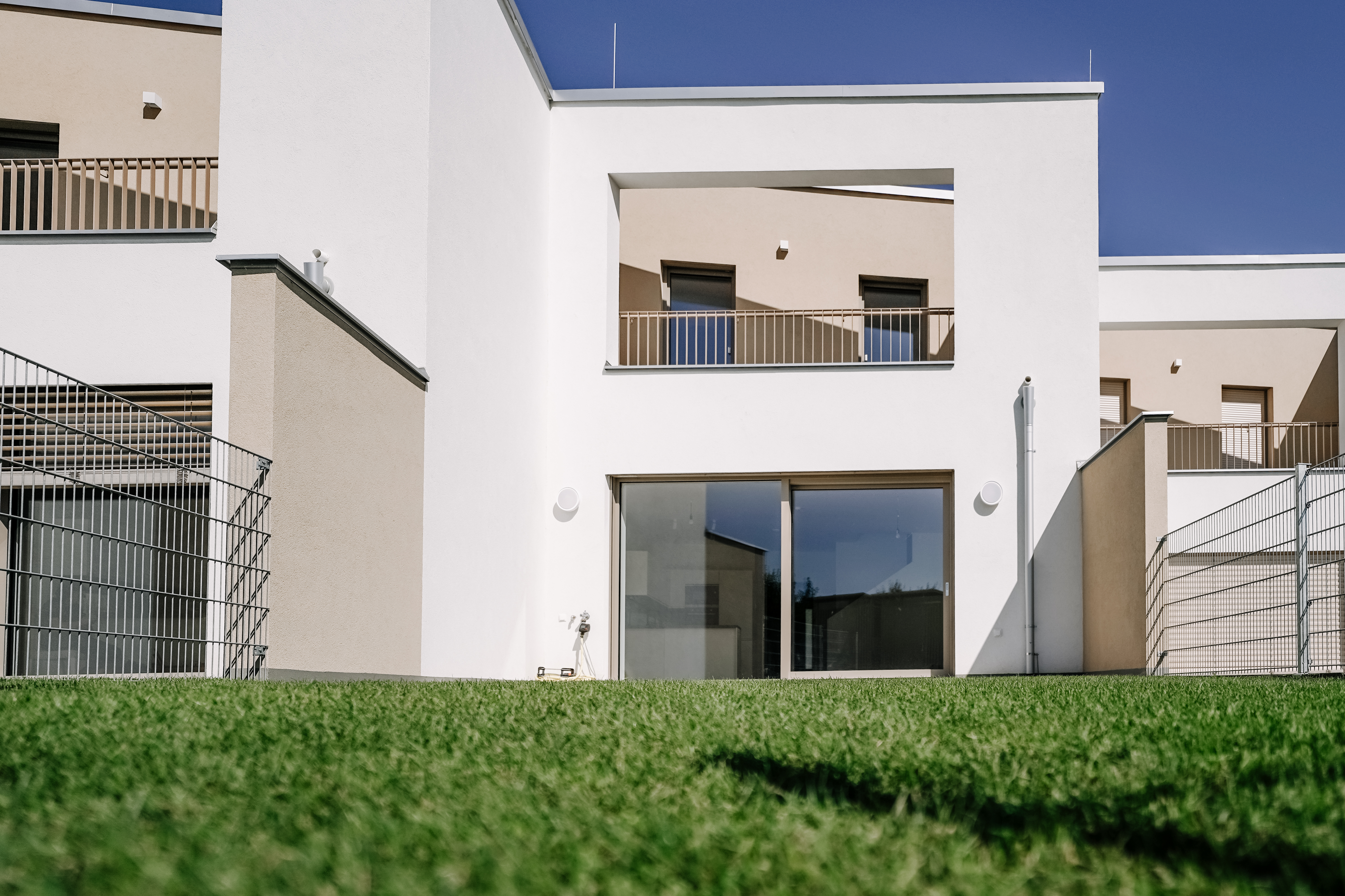 Wohnhausanlage bestehend aus 5 Reihenhausblöcken mit insgesamt 23 Wohneinheiten, Carports, Gartengerätehütten, Müllraum und Hausbetreuerraum.