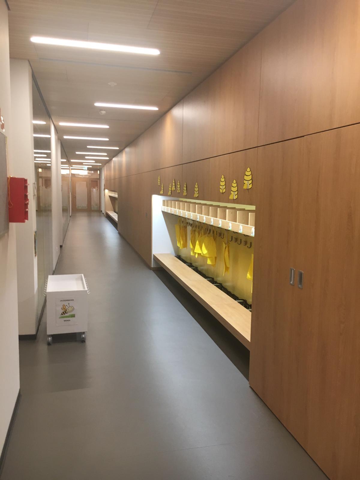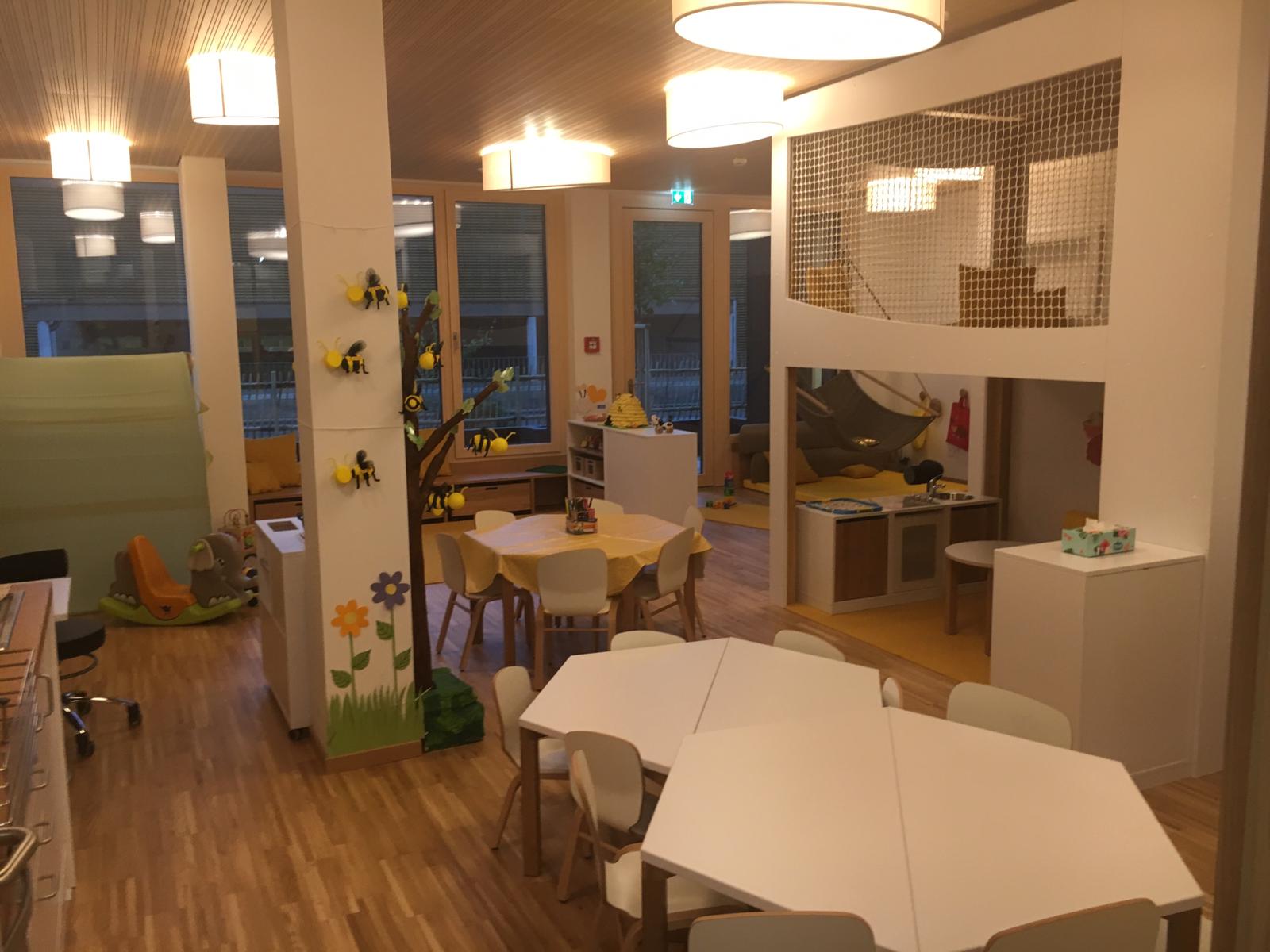 Der Kindergarten wird gemeinsam mit einem Wohngebäude mit 25 Wohneinheiten errichtet. Die Wohnungen sind über ein separates Treppenhaus vom Norden erschlossen. Der Kindergarten ist Ebenerdig von Süden erschlossen.