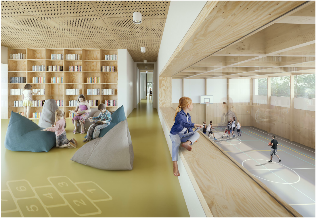Es handelt es sich um einen Holzbau, der auf einem STB-Massivbau aufsetzt und mittels STB-Wandscheiben und dem Aufzugschacht aus STB in oberirdischen Geschossen ausgesteift wird. Auch im Innenraum ist das Material Holz das bestimmende Element. Holzböden und -decken sowie teilweise Holzsichtwände generieren ein helles, freundliches und natürliches Erscheinungsbild mit hoher Aufenthaltsqualität. Großzügige Lufträume und Blickachsen über große Innen- und Außenverglasung erzeugen eine räumliche Vernetzung.