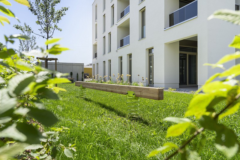 Die Wohnanlage ist unterkellert. Sie verfügt über ein Erdgeschoss und 3 bzw. 5 Obergeschosse, in Massivbauweise mit einem bekiesten Flachdach. Die den Wohnungen zugehörigen Loggien sind in die Gebäudekubatur integriert. Alle Wohnungen sind über das zentrale, geschlossene Stiegenhaus auf kurzem Weg zugänglich. Es ist eine Aufzugsanlage (Lift) vorhanden.