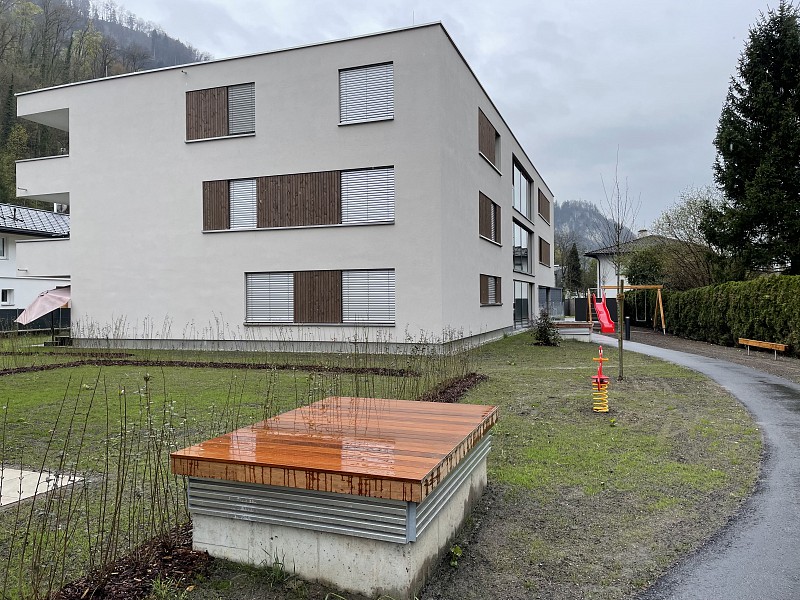 Die den Wohnungen zugehörigen Terrassen oder Balkone sind in die Kubatur integriert.