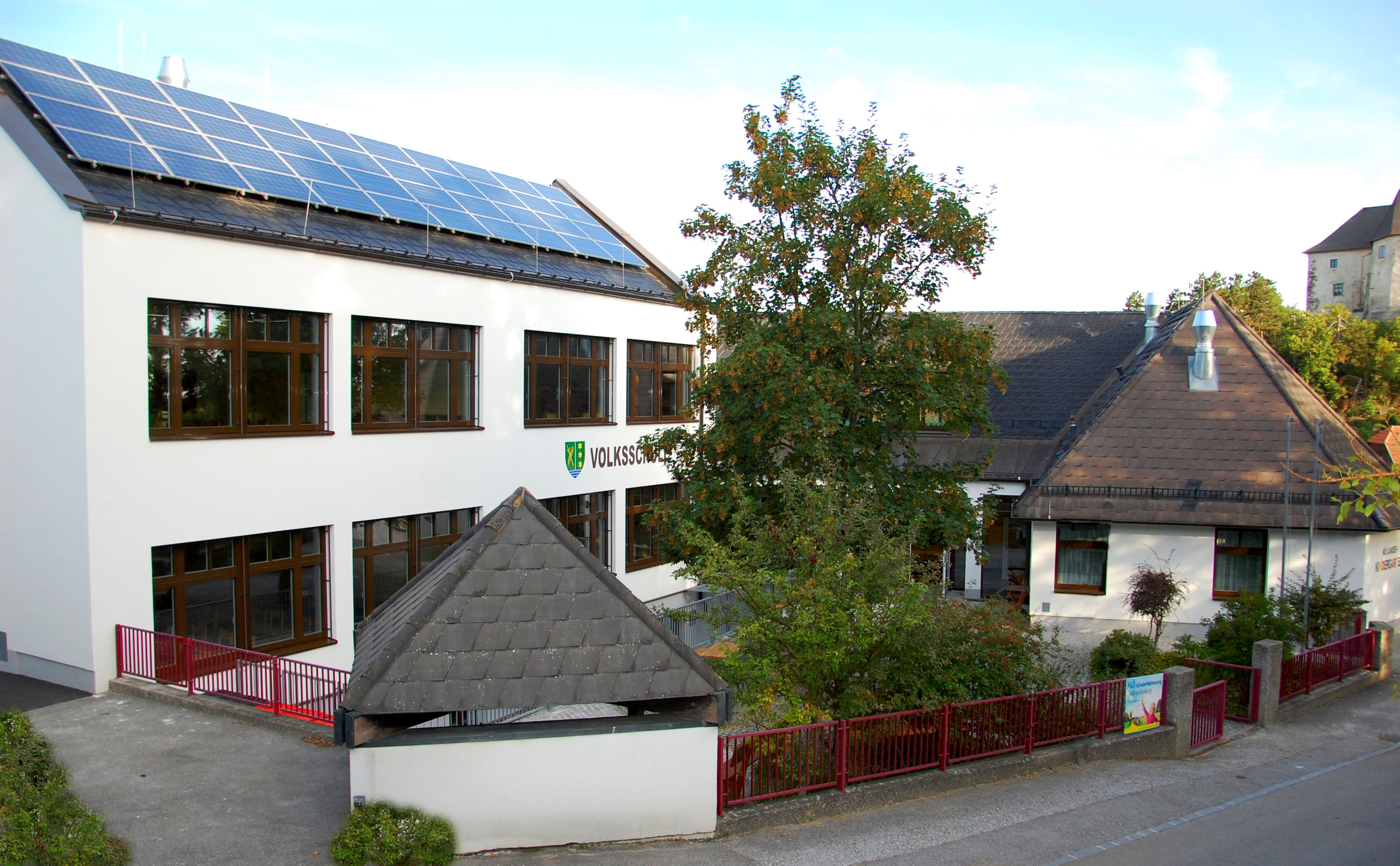 Das gegenständige Gebäude wurde im Jahr 1984 erbaut und wird als Volksschule und Kindergarten genutzt. Im Zuge der Mustersanierung wurden folgende Maßnahmen ergriffen: Dämmung der Fassade, Kellerdecke, Dachböden, Fußböden und Flachdächer sowie ein Tausch von Fenster und Türen. Desweiteren wurde die Ölheizung durch eine Pelletsheizung ersetzt. Auch die Regelung der Heizung wurde erneuert. Eine neue Lüftungsanlage mit WRG versorgt den Turnsaal, die Klassenräume und den Kindergarten mit Frischluft. Für den Sonnenschutz wurden an den Fenstern elektrisch betriebene Raffstores angebracht. Auf dem West- und Ostdach des Gebäudes wurde eine Photovoltaikanlage mit einer Gesamtleistung von 30 kWp errichtet, die einen Großteil des Strombedarfs deckt. Es werden überwiegend Dämmstoffe mit dem Österreichischen Umweltzeichen eingesetzt. Außerdem wird bei der kompletten Elektroinstallation auf PVC-Freiheit geachtet.