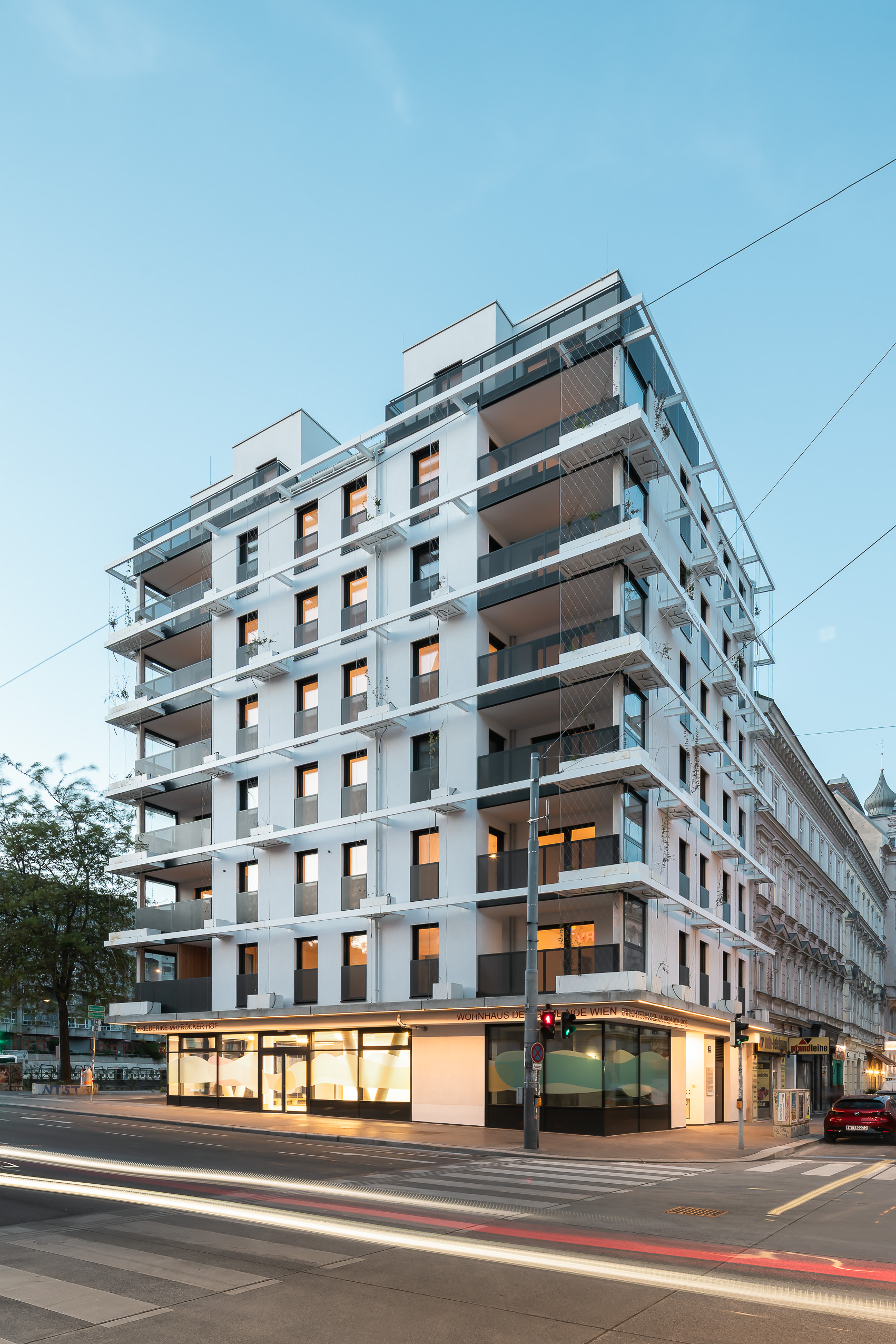 An der Ecke Reinprechtsdorfer Straße / Schönbrunner Straße entsteht ein neuer Wohnbau für Wiener Wohnen. Das schmale Grundstück ist Nord-Süd orientiert und schließt im Osten an die bestehende Bebauung an. Auf 8 oberirdischen Geschossen entstehen 15 neue Gemeindewohnungen.