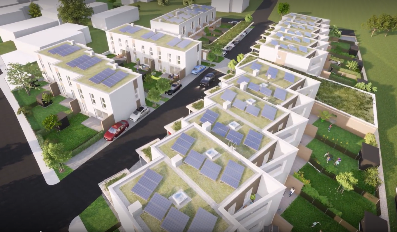 Wohnhausanlage bestehend aus 5 Reihenhausblöcken mit insgesamt 23 Wohneinheiten, Carports, Gartengerätehütten, Müllraum und Hausbetreuerraum.