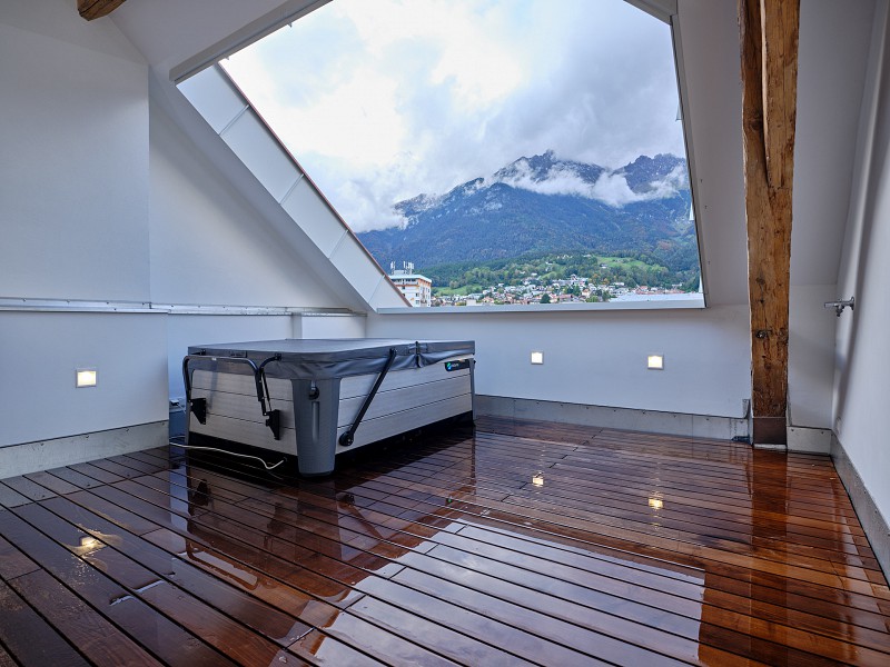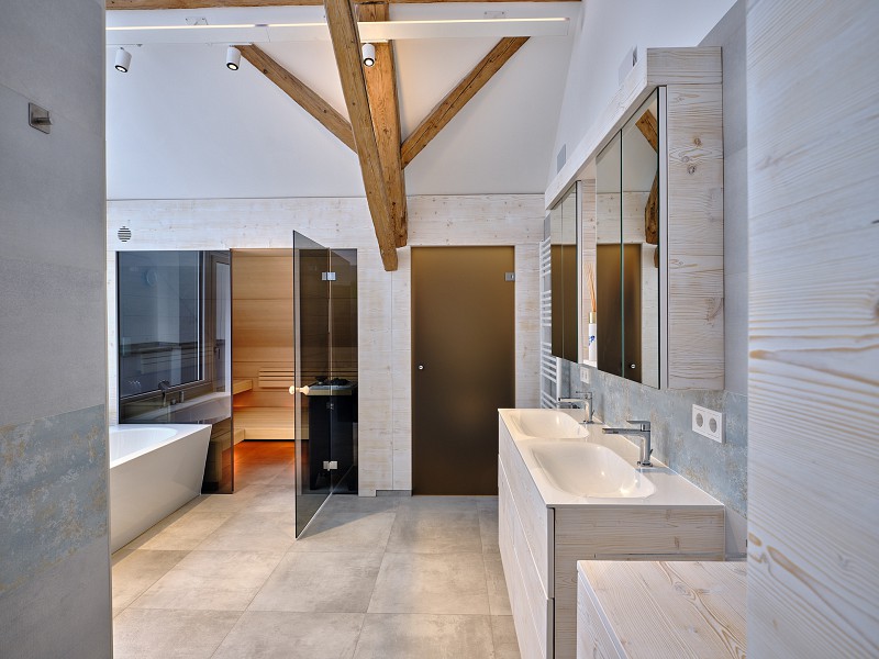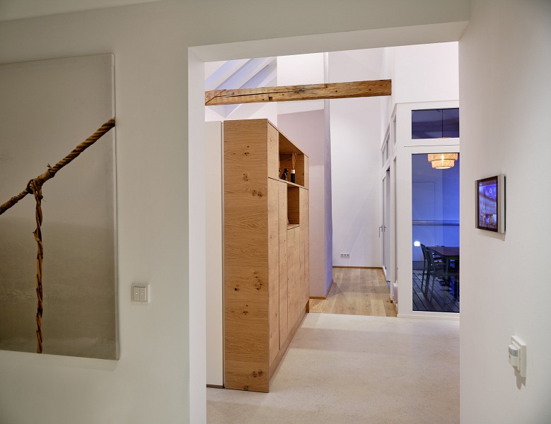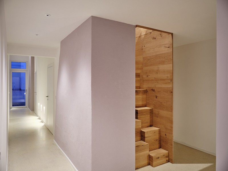 Bei diesem Projekt wurde auf ökologische und nachhaltige Baustoffe geachtet. Die Aussenwände im Bereich der Terrassen sind als Holzriegel ausgeführt, wobei die Zwischenräume mit Holzfaser-Einblasdämmung ausgedämmt wurden. Als Putzträgerplatten kamen Holzfaserdämmplatten zum Einsatz. Im Dachbereich wurde ebenfalls eine Holzfaser-Einblasdämmung verwendet. Die Aussenfassade solltenach Vorgabe der Stadtplanung unverändert bleiben und wurde innenseitig mit Steinwolle gedämmt. Die Fußböden aus Massivholzparkett und geschliffener Estrich aus Weißzement vom Attersee in Gängen und Küche prägen das Erscheinungsbild, die Nassbereiche sind mit Feinsteinzeug ausgestattet. Auch beim Innenausbau wurde als Material Holz von den Auftraggebern präferiert. Die Kamine wurden mit Sumpfkalk verputzt.
