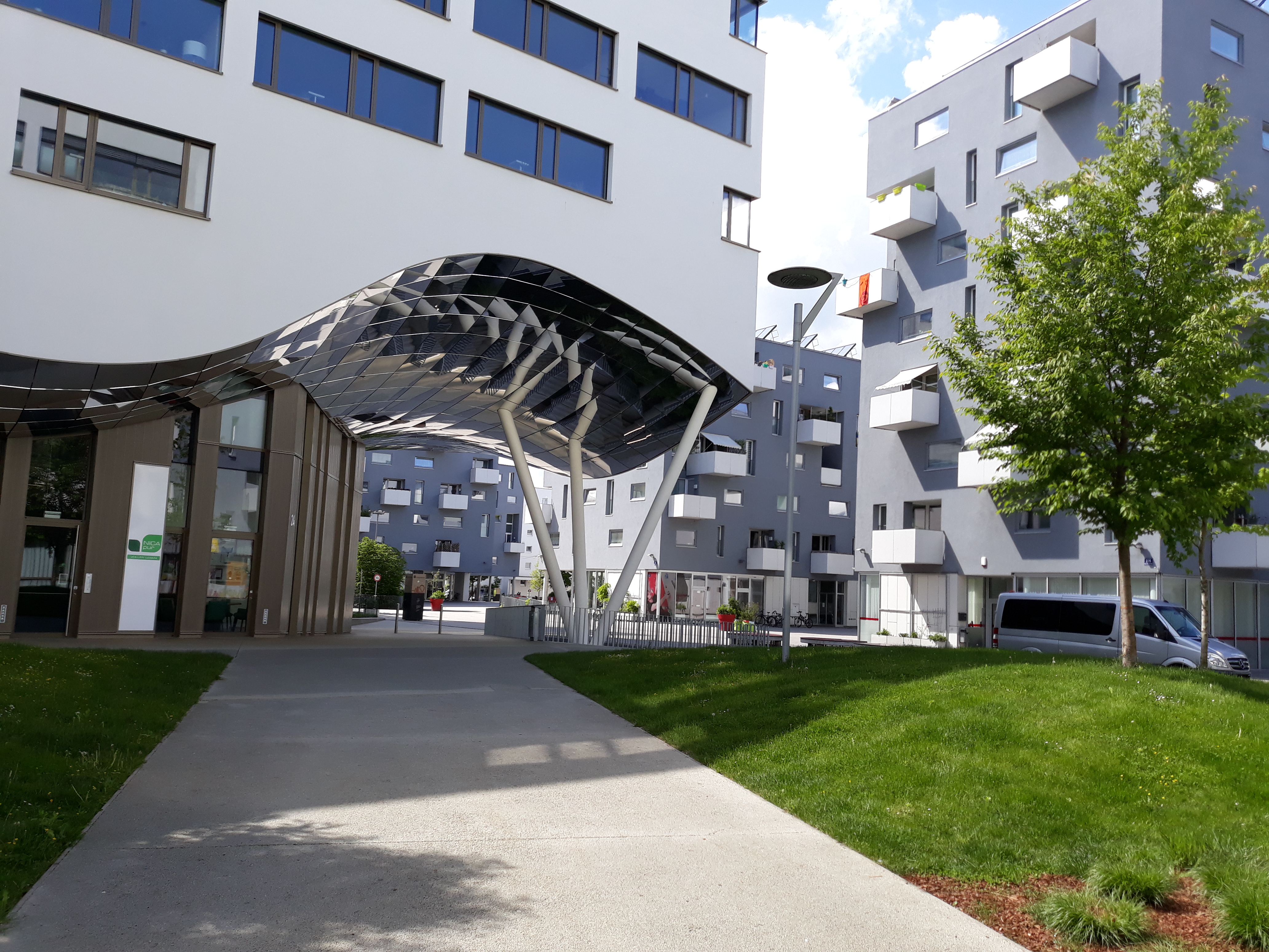 wurden im nördlichen Bereich des Projektegebietes 287 geförderte Mietwohnungen, ein Kindergarten, ein Studentenheim und im südlichen Bereich des Projektgebietes ein Nahversorger, Büros sowie Labors und andere gewerbliche Räumlichkeiten errichtet. Kernstück ist die Sockelzone entlang der öffentlichen Durchwegung, dem so genannten