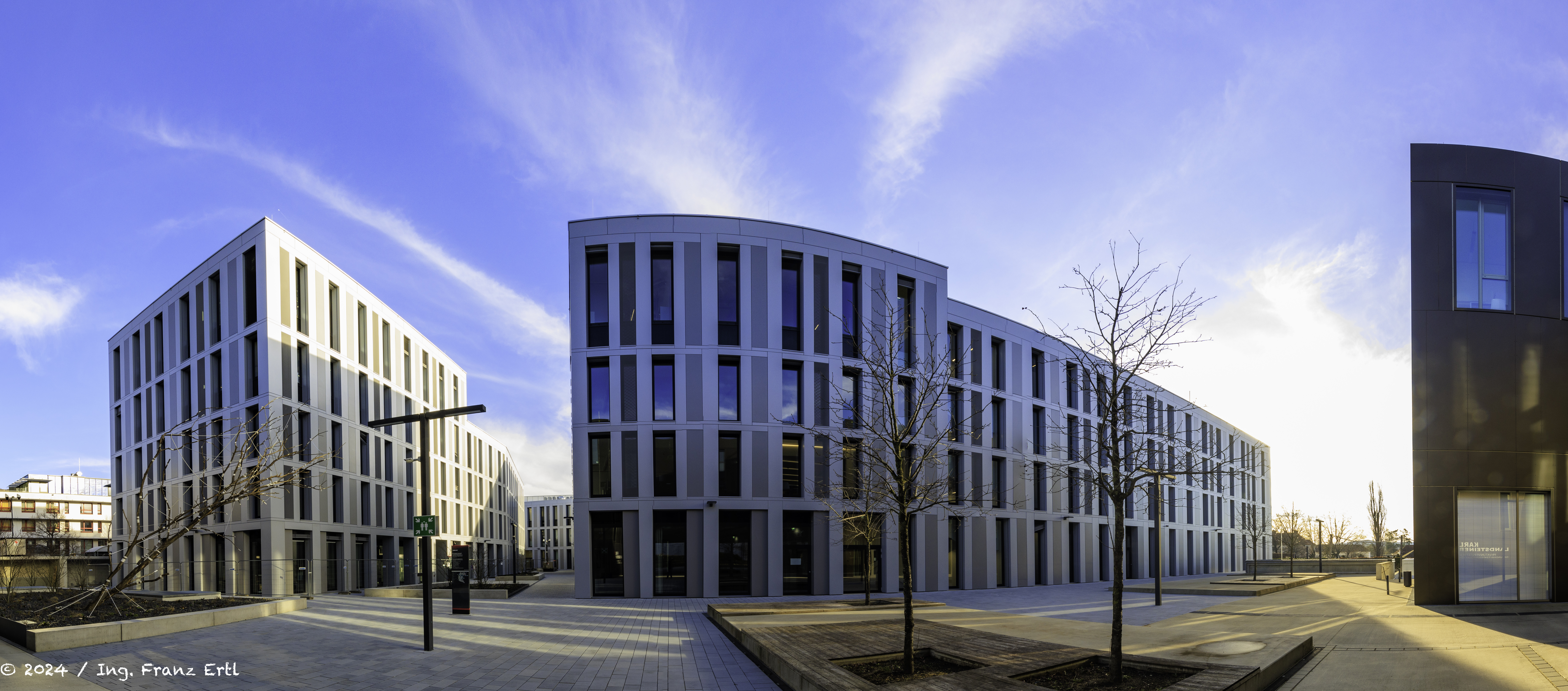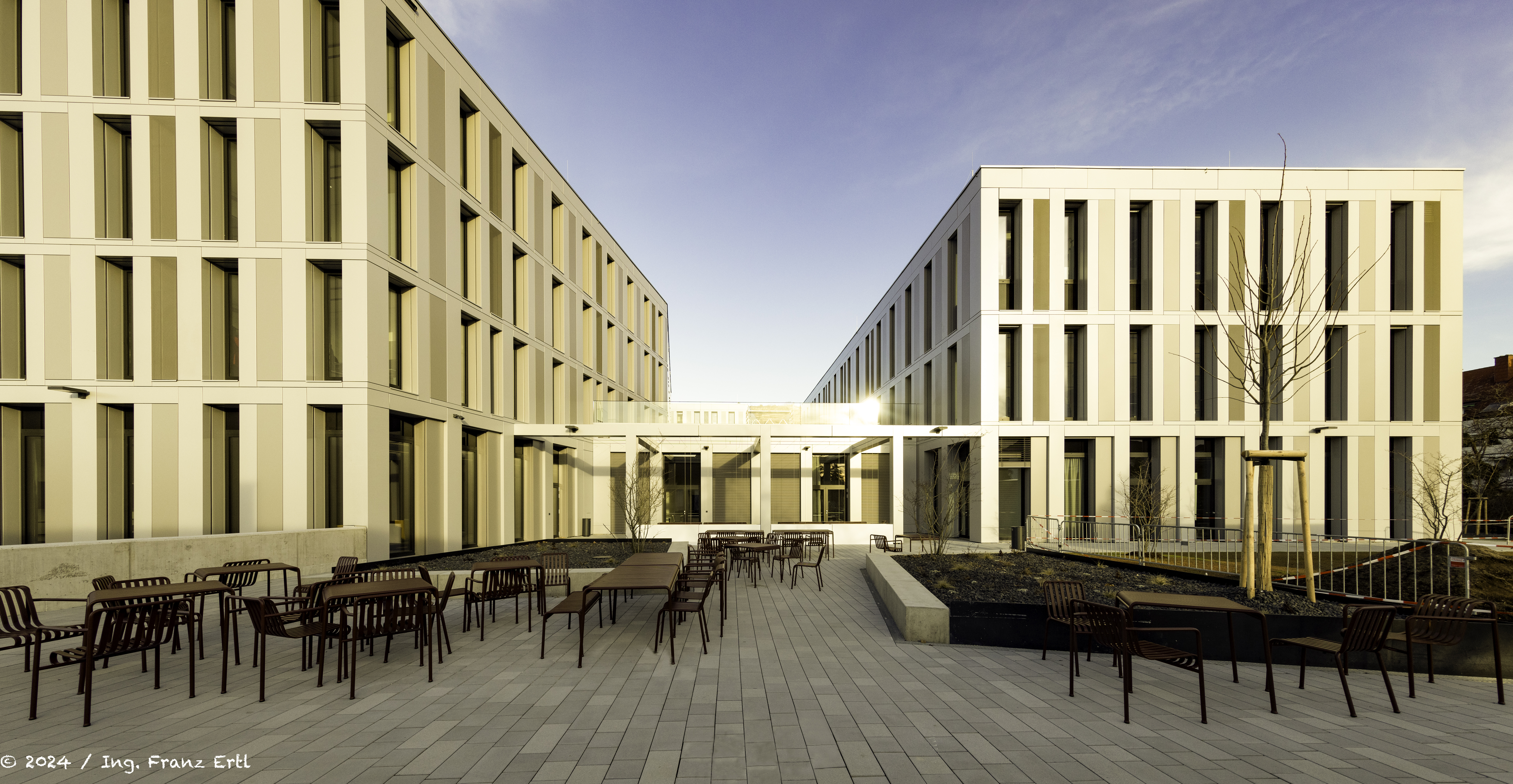 Die kompakten Baukörper richten sich in ihrer Positionierung und Höhenstaffelung nach der unmittelbaren Umgebung. Die fußläufigen Verbindungen werden vom bestehenden Campus weitergeführt und verbinden sich ganz logisch in einer neuen Campuspromenade.