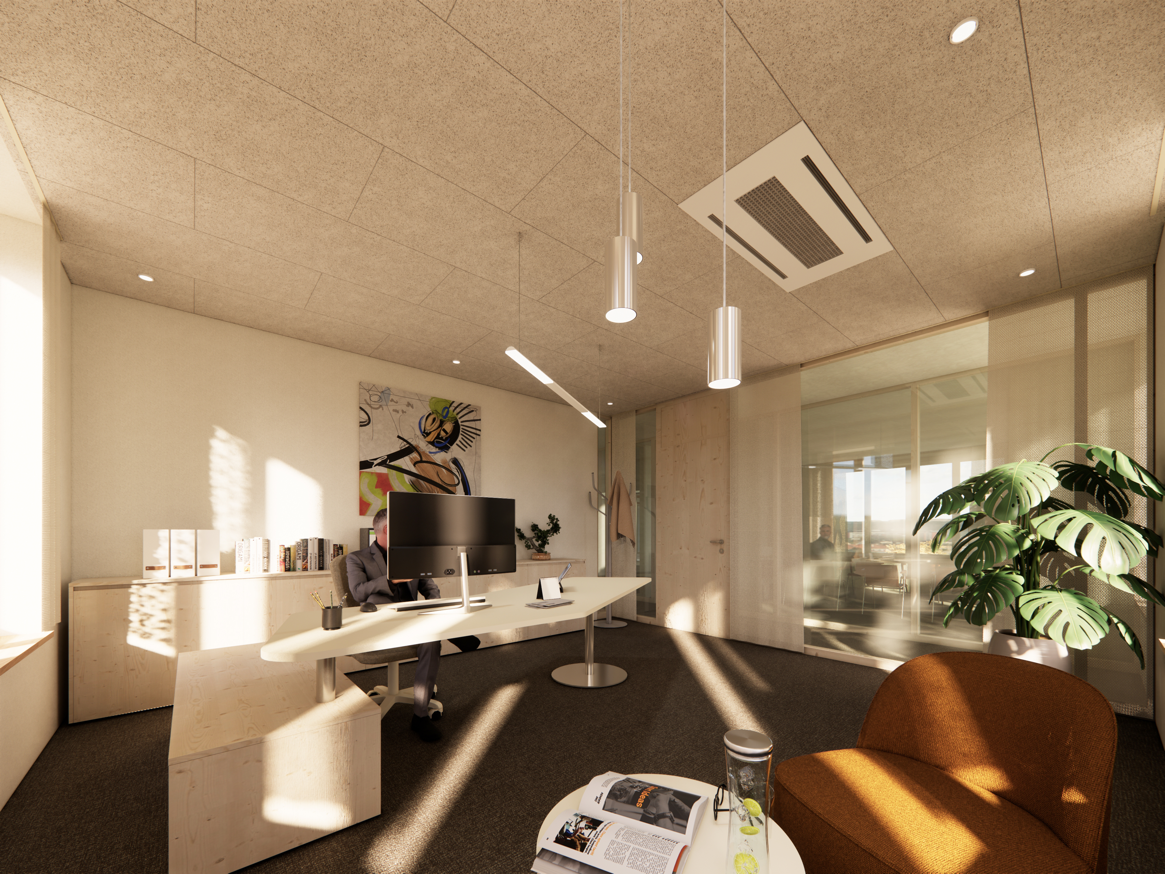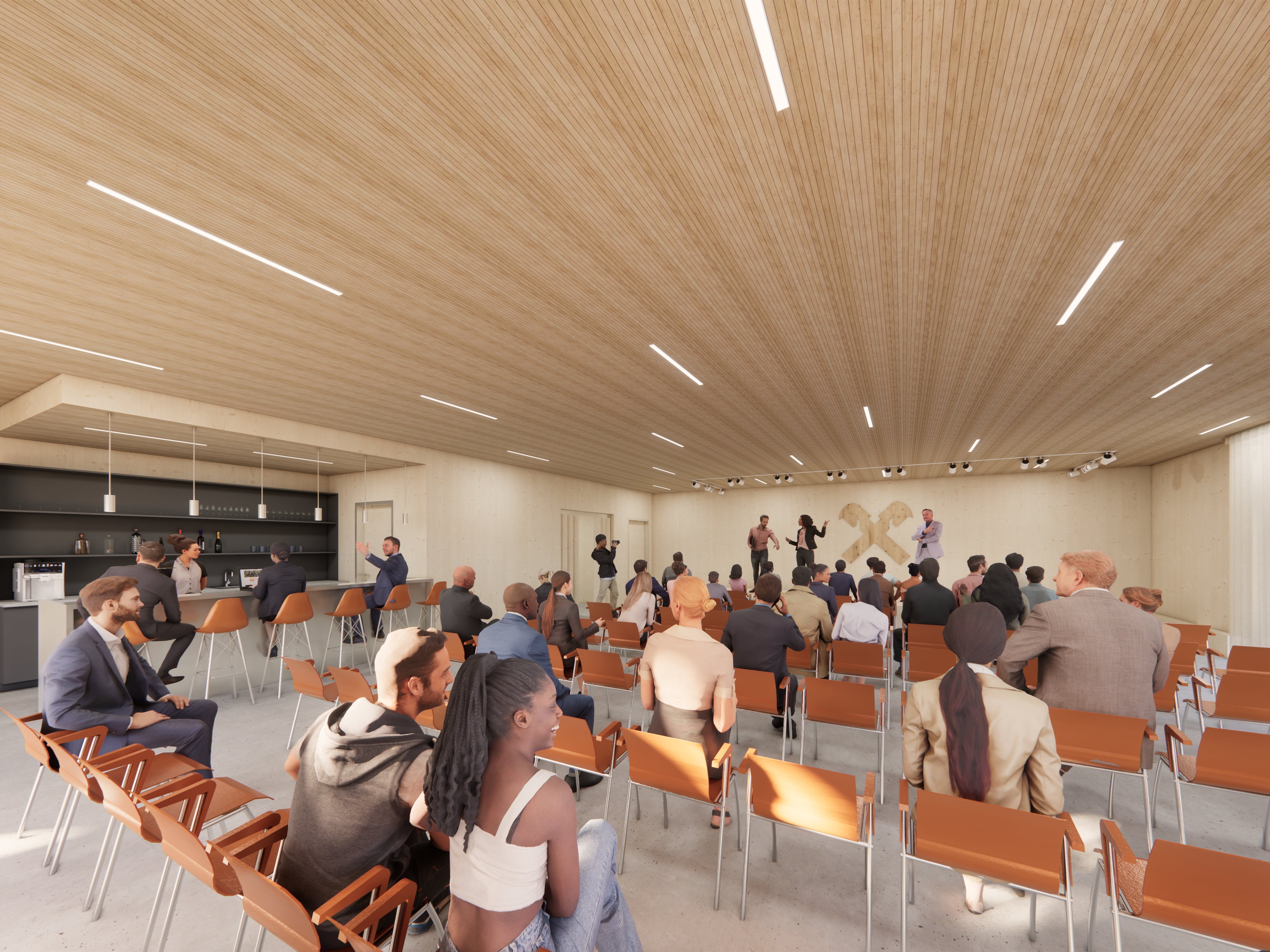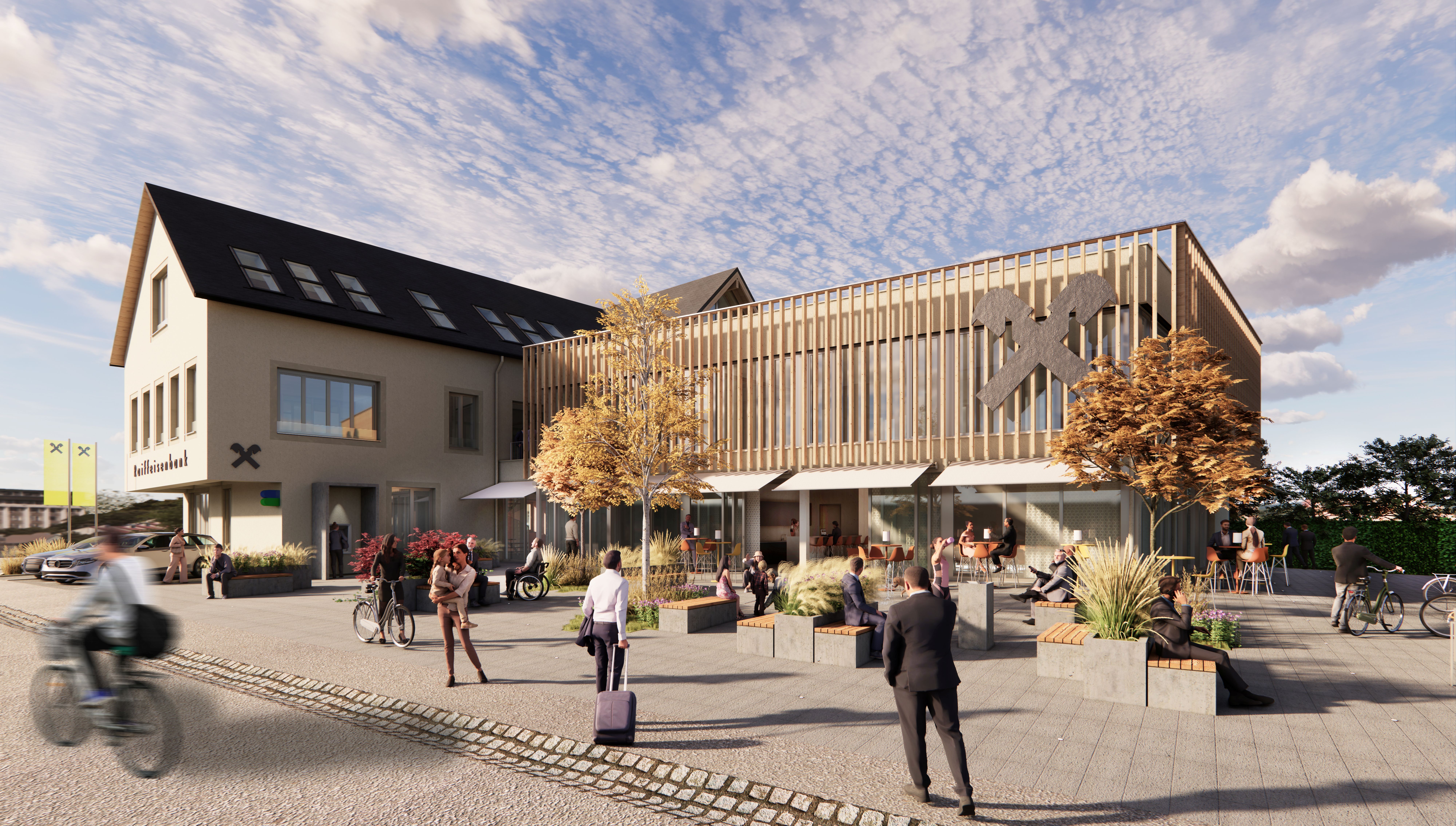 Der neue Baukörper fügt sich dank seiner Geschossigkeit sowie der zurückhaltenden Architektur aus Holz und Glas harmonisch in das Gesamtbild ein. Gemeinsam mit dem Bestandsgebäude entsteht ein Platz, der sich nach Süden und Osten öffnet und sowohl für interne Veranstaltungen der Bank als auch für die Öffentlichkeit nutzbar ist.
