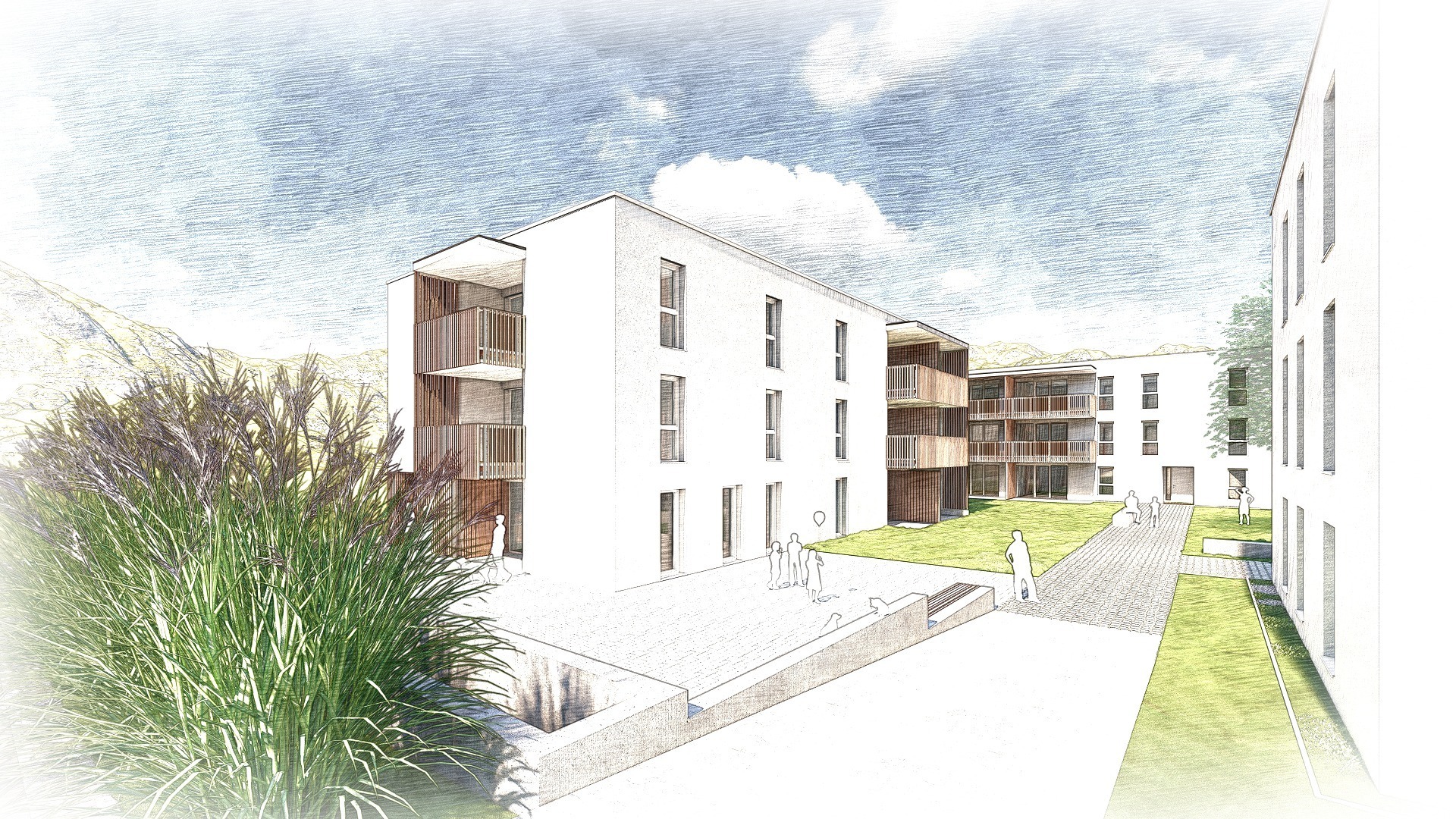 Grundgedanke des Entwurfes ist eine zeitgemäße Umsetzung einer Wohnbebauung, unter Bedachtnahme der örtlichen Gegebenheiten, der nahen Autobahn im Osten, der Hangneigung von Südwest in Richtung Nordost und der umliegenden Bebauung. Es soll eine Anlage entwickelt werden, die einen Siedlungsabschluss bildet, einladend für die Umgebung und mit hohem Wohnkomfort für die zukünftigen Bewohner:innen. In Summe werden 35 WE errichtet welchen ein Gemeinschaftsraum zur allg. Nutzung bereitgestellt wird.