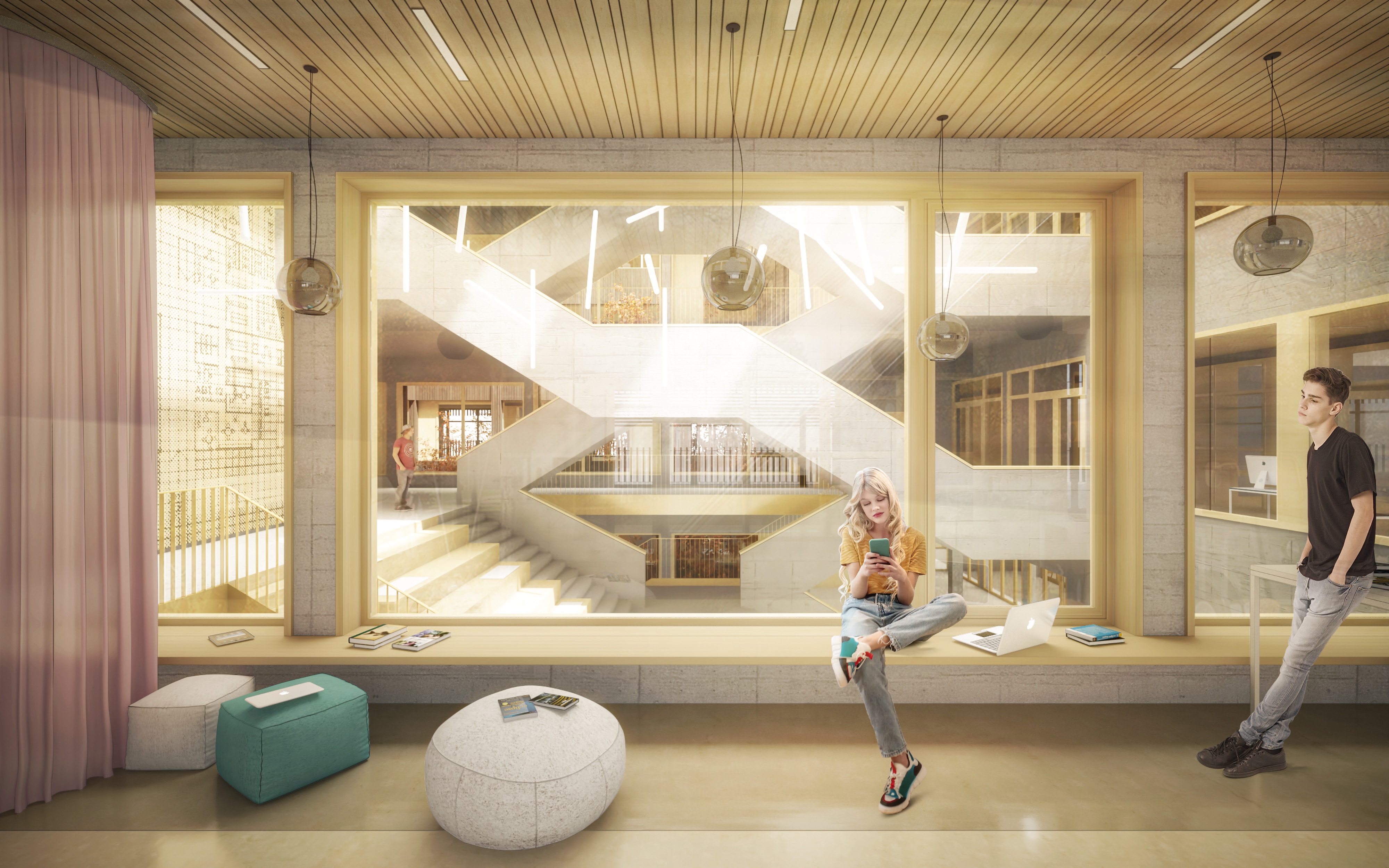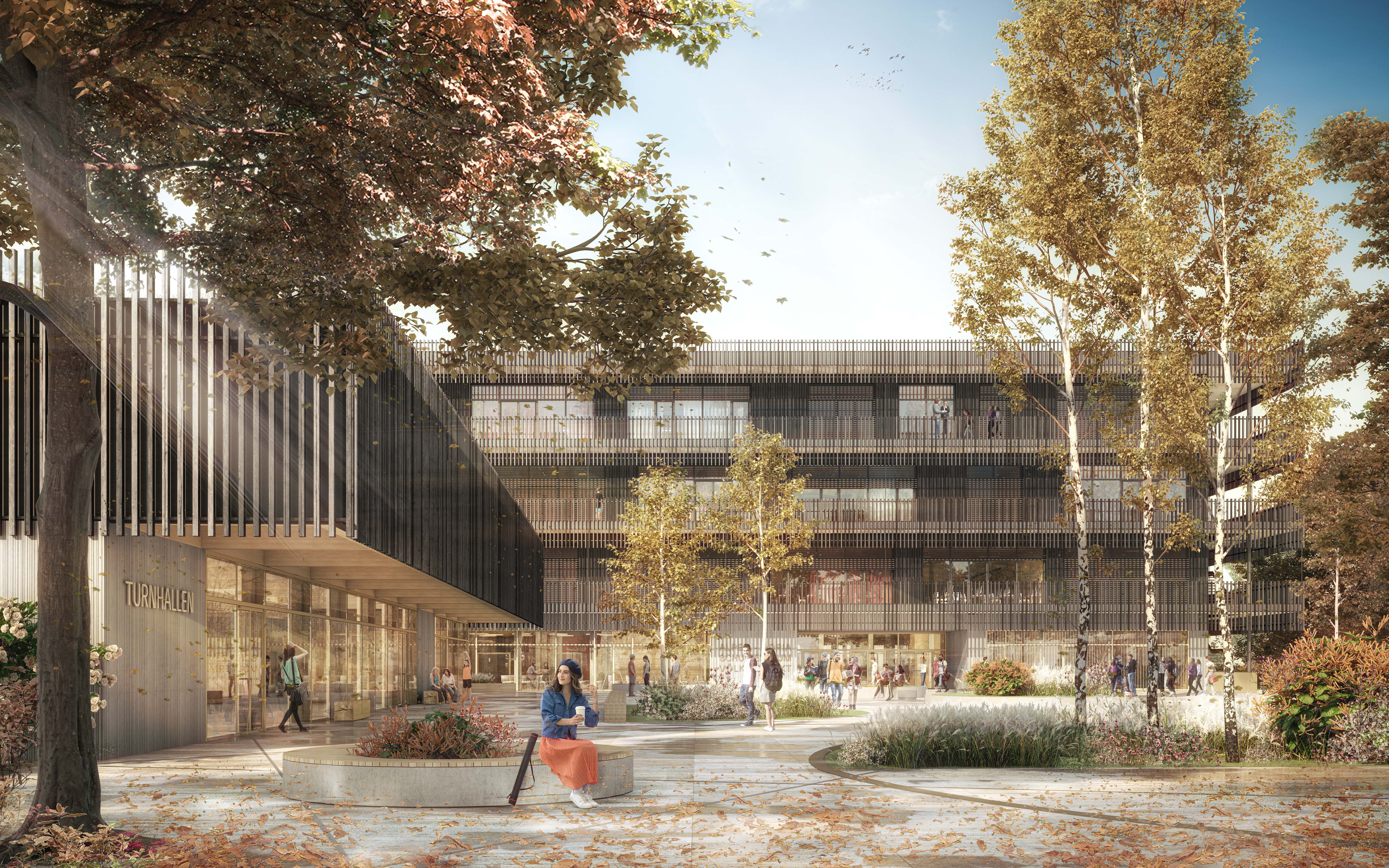 Die Lage des Planungsgebietes befindet sich in einem heterogenen Kontext, umgeben von unterschiedlichen Bildungseinrichtungen und Wohngebäuden, kommunalen und gewerblichen Einrichtungen. Insofern ist die städtebauliche und landschaftsgestalterische Einbindung des neuen Schulgebäudes von spezieller Bedeutung insbesondere als verbindendes Element der einzelnen Stadtteilstrukturen zu einem großen Ganzen. Das vorgeschlagene Konzept formuliert zwei Baukörper, in der einen Grundstücksecke den kompakten, selbstbewussten Schulbau mit 4 oberirdischen Geschossen und einem Gartengeschoss, in der gegenüberliegenden Ecke den Turnhallenbau, der 1-geschossig in Erscheinung tritt. Die Baukörper sind über das Gartengeschoss miteinander verbunden. Die Eigenständigkeit des Turnsaal-Baukörpers stellt einen Mehrwert hinsichtlich externer Nutzung dar. Die Situierung der beiden Volumina erzeugt einen großzügigen, öffentlichen Freibereich, der die Schule als „Neue Mitte“ des Campus mit dem Stadtquartier vernetzt.