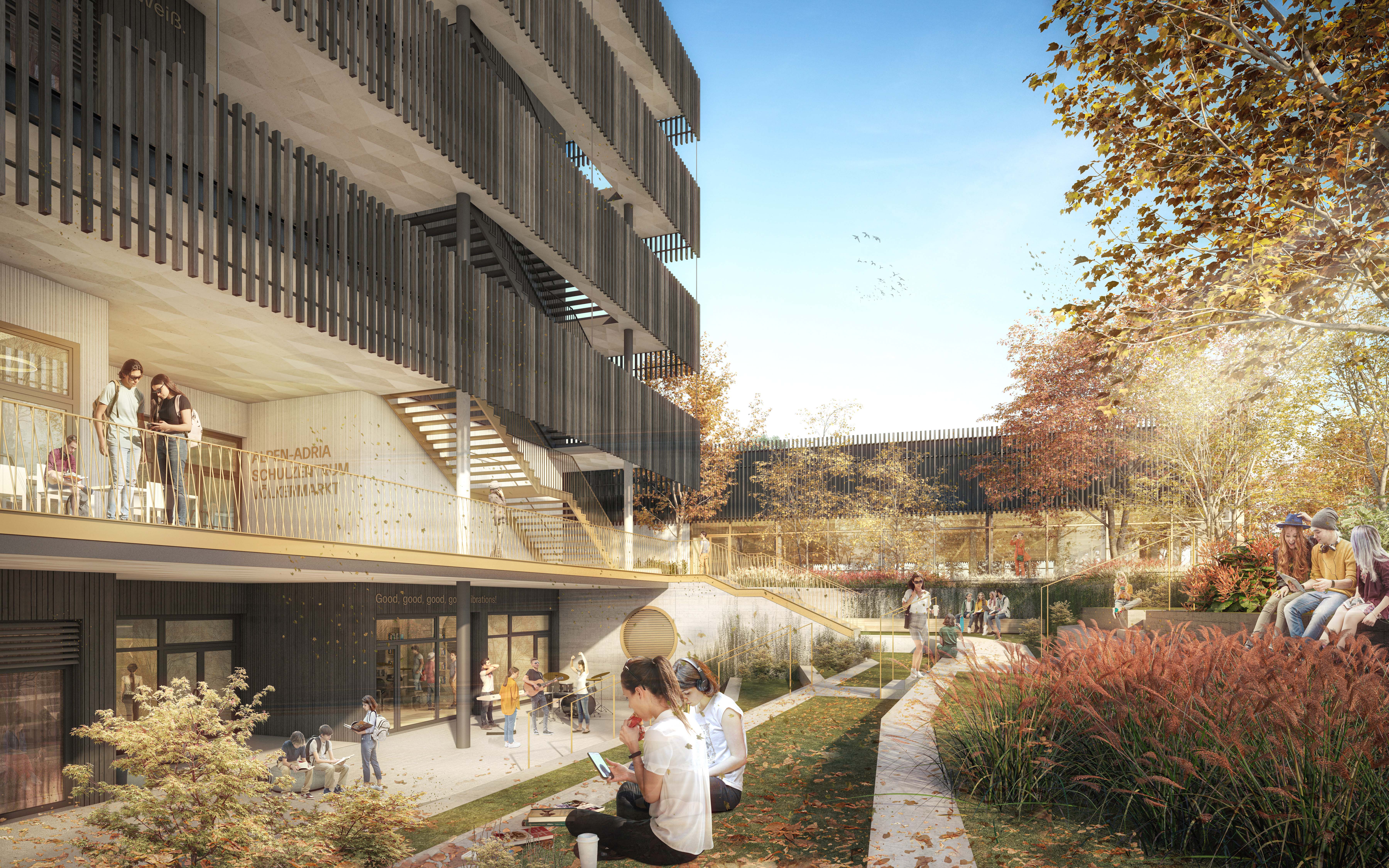 Neubau des Alpen-Adria-Schulzentrums in Völkermarkt mit 38 Klassen (BG, BRG und HAK) und einer Doppelsporthalle.