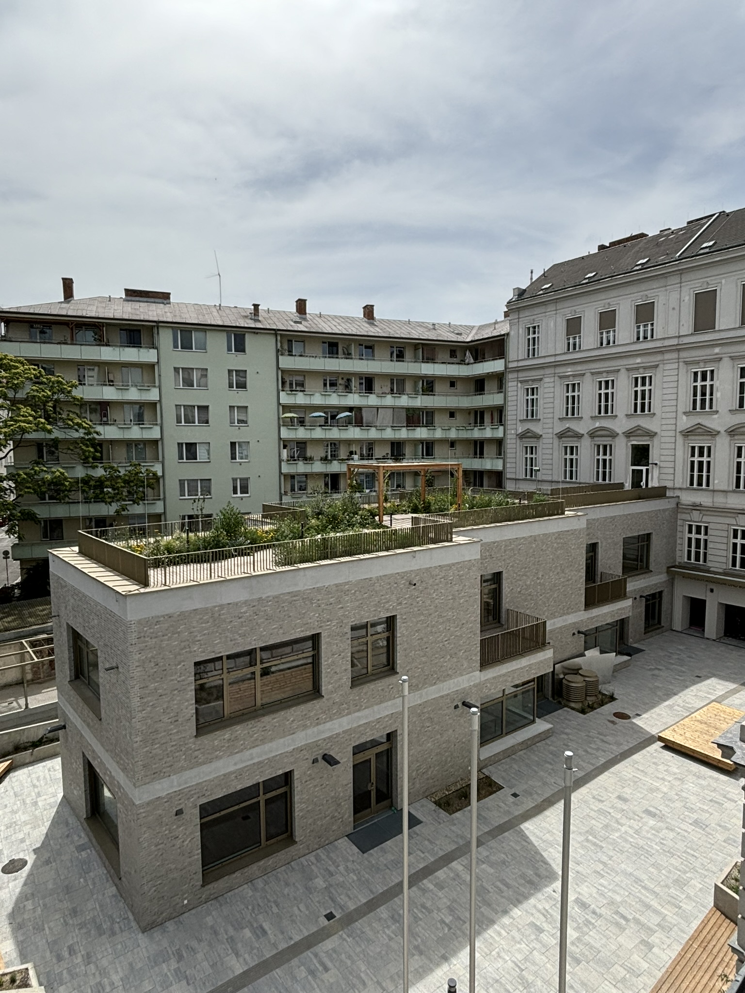 Das bestehende Atriumdach wird abgebrochen und durch ein höher liegendes Glasdach ersetzt. Dadurch entsteht ein mehrgeschoßiger Luftraum. Aus dem zuvor dunklem 1. Untergeschoß wird eine lichtdurchflutete Eingangshalle, das neue pulsierende Herz des Gebäudes. Rund um dieses Zentrum spielt sich die Erschließung des Altbestandes und des Zubaus ab. Dieses Herz wird von einem neuen Haupteingang von der Weintraubengasse aus erschlossen.