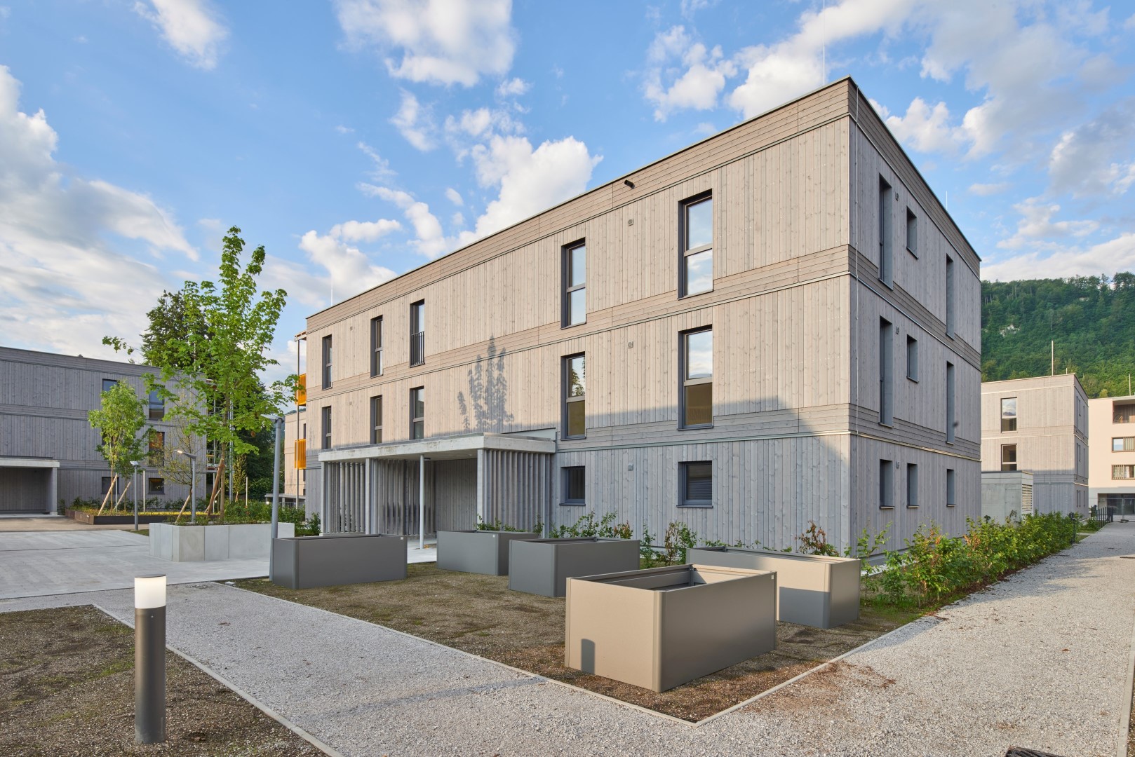 Die Architektur der Gebäude mit jeweils 3 Vollgeschoßen wurde in Holz-Hybridbauweise mit lasierter, offener Holzverschalung geplant (Stiegenhauskern Stahlbeton, Wohnungen Holzbau).