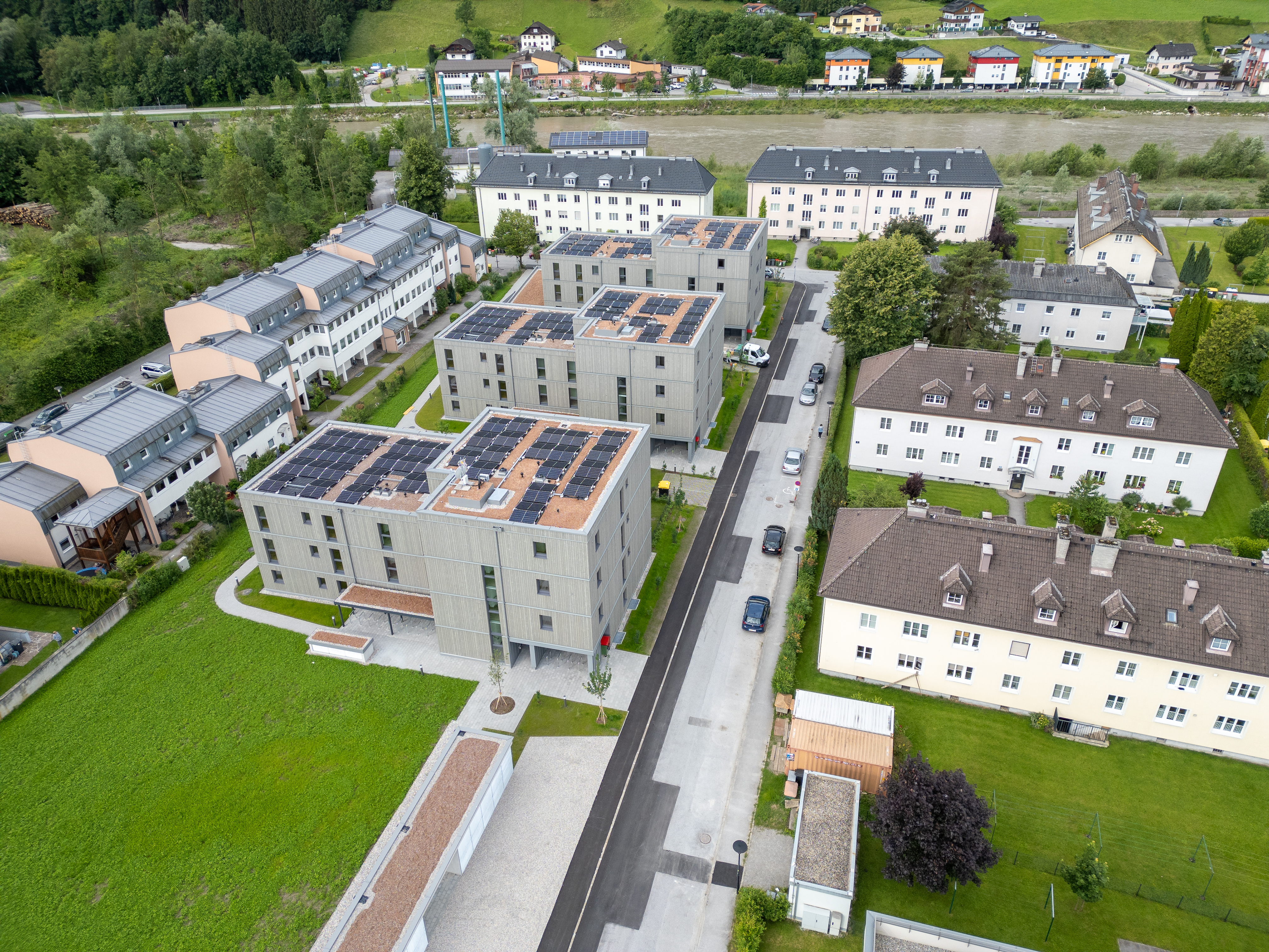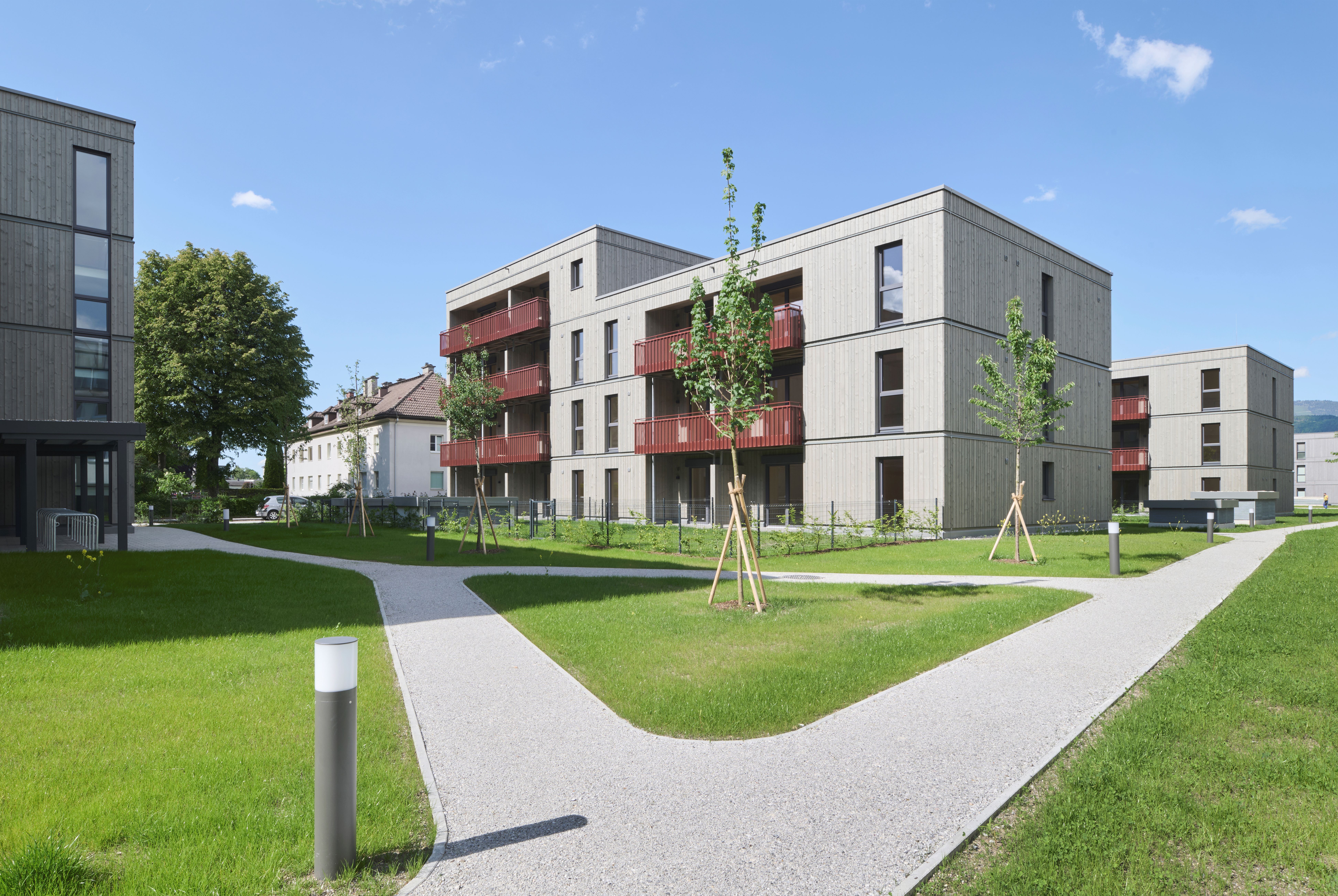 Die Architektur der Gebäude mit jeweils 4 Vollgeschoßen wurde in Holz-Hybridbauweise mit lasierter, offener Holzverschalung geplant (Stiegenhauskern Stahlbeton, Wohnungen Holzbau).