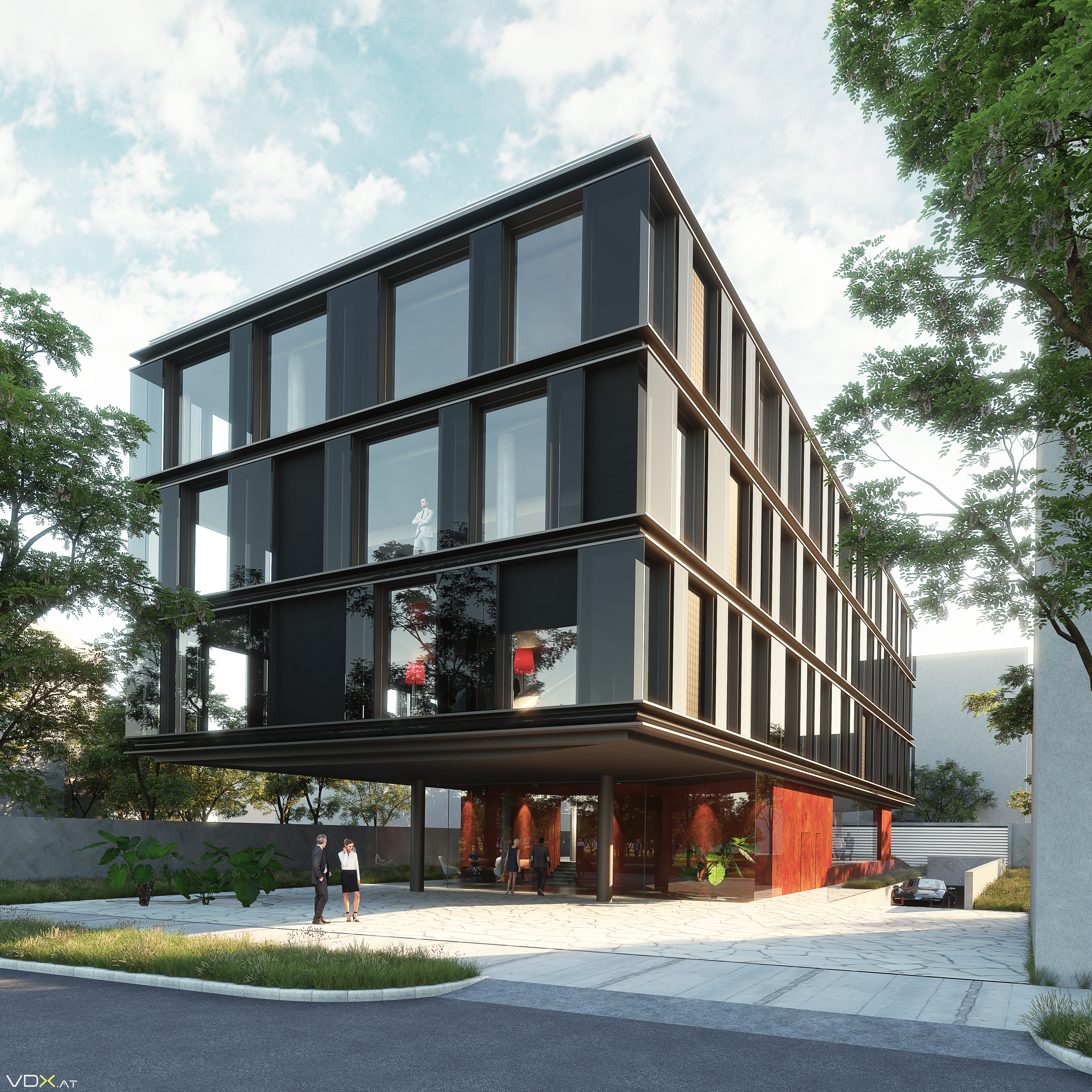 In der Nachbarschaft des neuen Sicherheitszentrums Innsbruck entsteht ein Bürogebäude. Die Berglandschaft im Hintergrund spiegelt sich in der verdunkelten Glasfassade und fügt sich somit in der Landschaft. Sein großzügiger Vorplatz zur öffentlichen Fußgängerzone dient als kommunikative Begegnungszone.