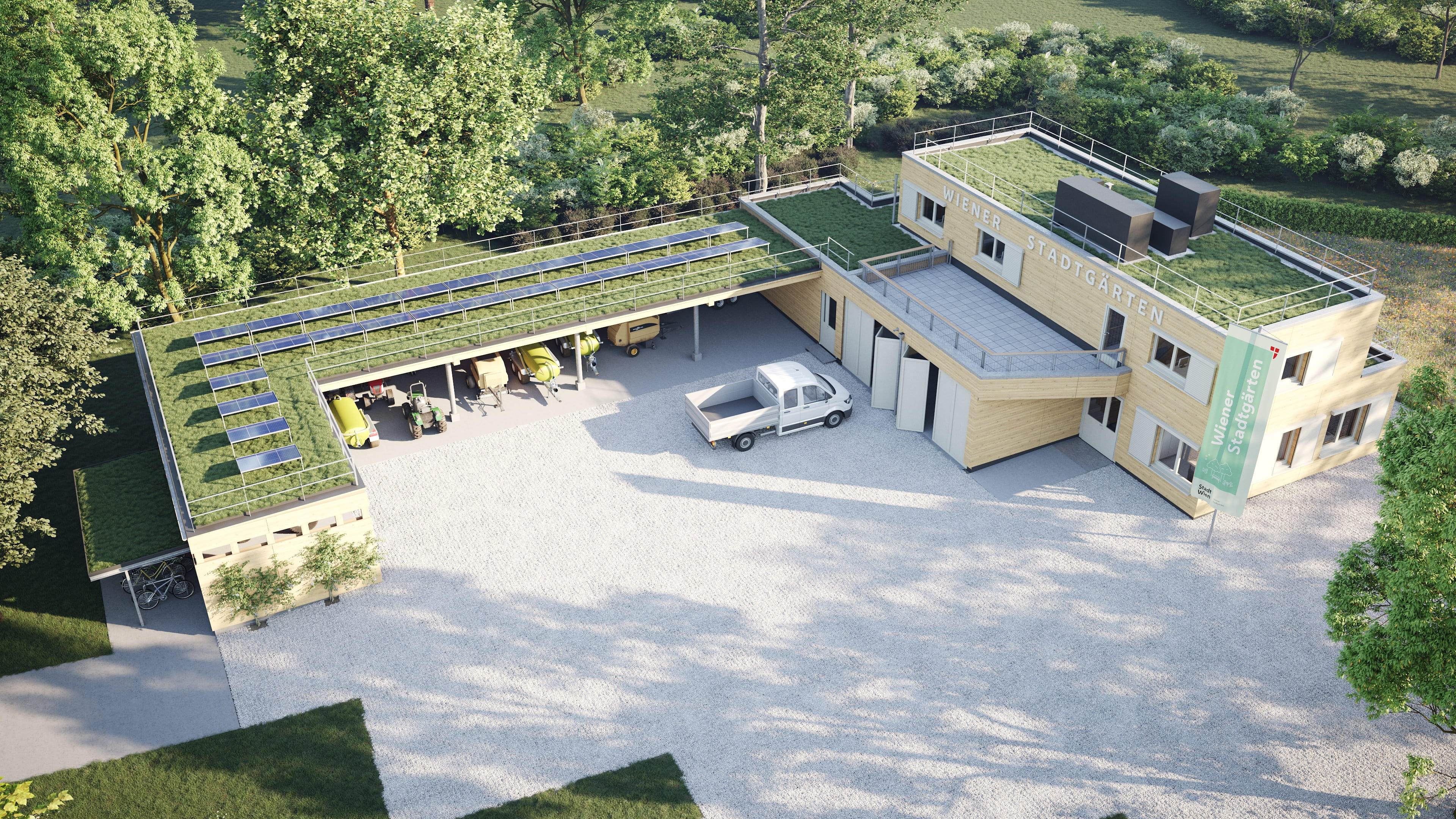 Das Grundstück befindet sich im Schweizergarten im dritten Wiener Gemeindebezirk. Gegenüber dem Baufeld ist das derzeitige Verwaltungsgebäude der Wiener Stadtgärten (MA42) situiert. Die Konzeption des Neubaus der Gärtner*innenunterkunft besteht aus drei funktional unterteilten Bereichen, welche am Rande des Bauplatzes angeordnet sind. Dieser Ansatz beruht auf dem historischen Hintergrund eines Dreikanthofes. Auf dieses Projekt abgestimmt, gliedern sich die drei Bereiche in den konditionierten Bereich des Büro- und Personalgebäudes mit angrenzender Werkstatt, dem konditionierten Maschinenunterstand und dem unkonditionierten betriebstechnischen Bereich unterhalb des Flugdachs.