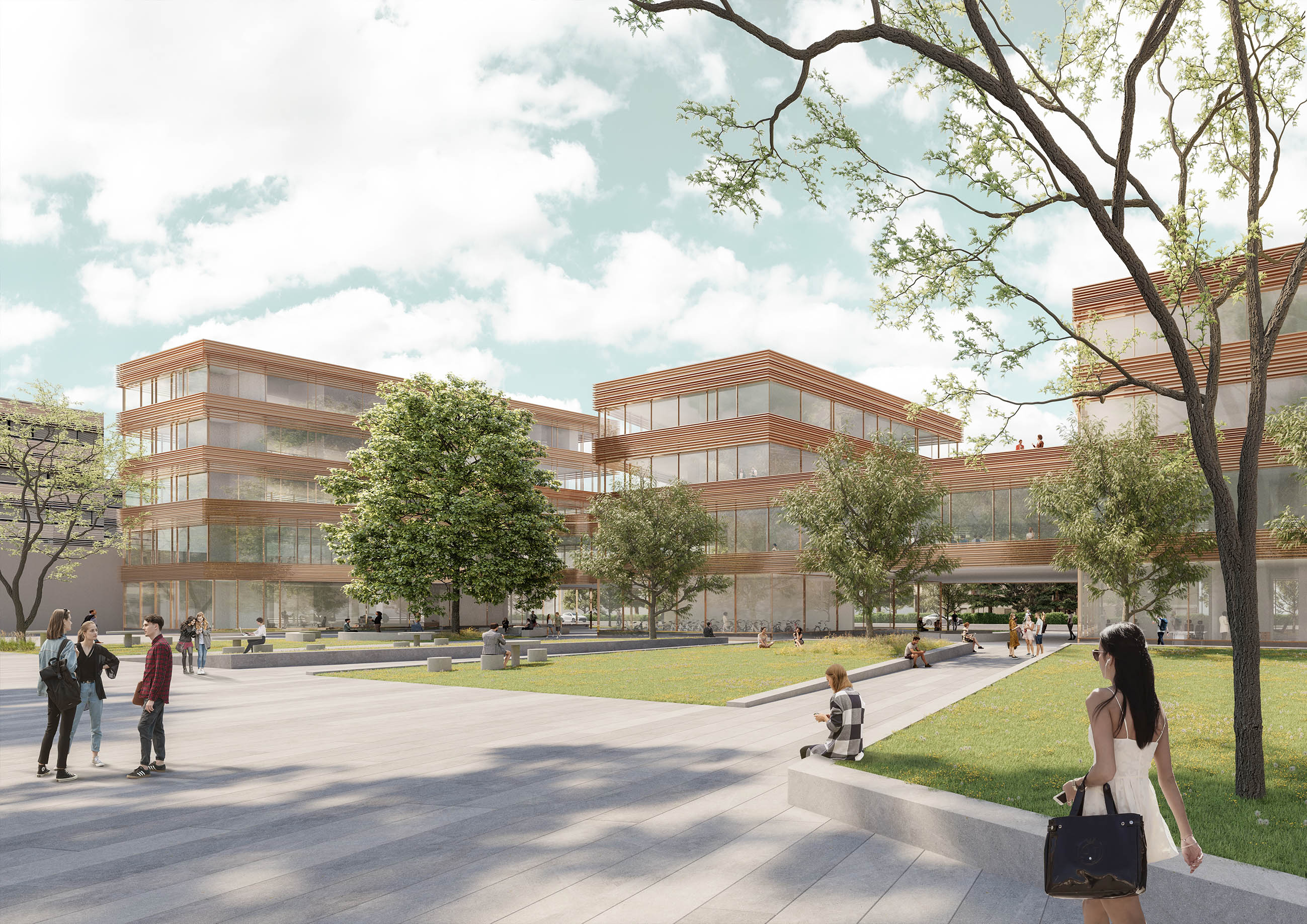 Die städtebauliche Konzeption mit drei konischen Einzelbaukörper und verbindendem ersten Obergeschoss erzeugt eine städtebauliche Schließung entlang der Sandgasse mit gleichzeitiger Offenheit zur dahinterliegenden Schule und dem Campus der TU. Der fünfgeschossige Baukörper schließt direkt an ein bestehendes Institutsgebäude an. Die weiteren Baukörper mit vier Geschoßen und kleineren Volumen reihen sich mit großzügigen Abständen entlang der Sandgasse auf. Mit den drei Baukörpern können den drei im Haus befindlichen Organisationseinheiten jeweils ein direkter Eingang zugewiesen werden. Die größere Geschosshöhe im EG wird für die Situierung von Seminarräumen, Foyers und Aufenthaltszonen genutzt. Der östliche Turm kann in allen Geschossen von den anderen Einheiten getrennt werden.