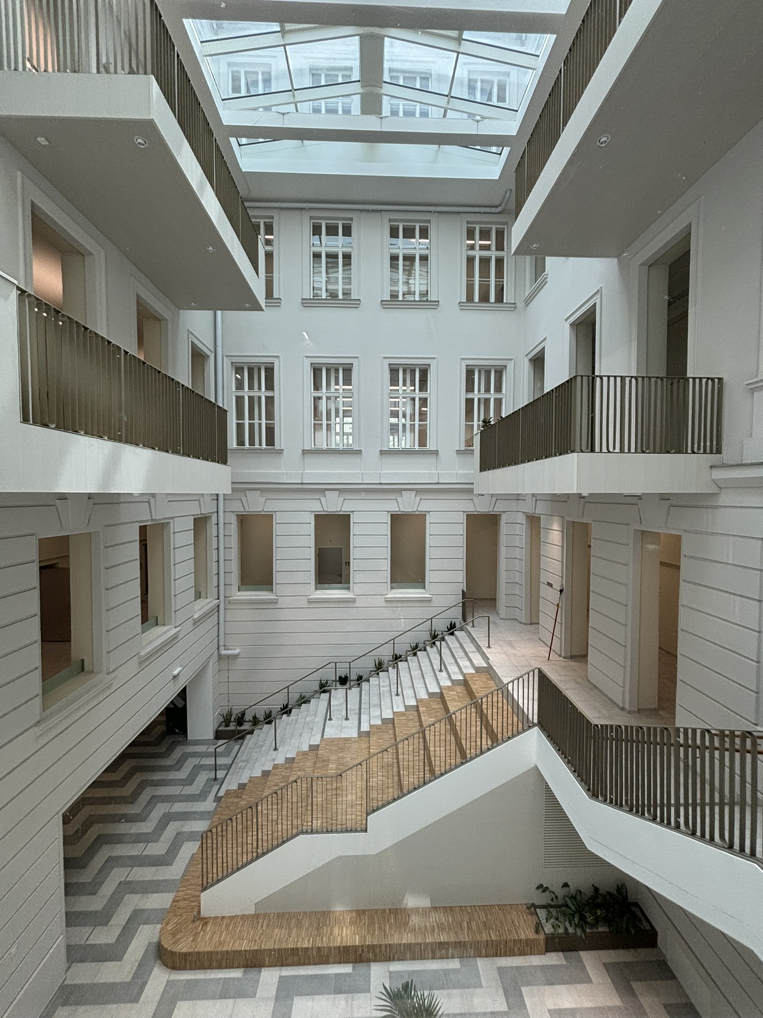 Das bestehende Atriumdach wird abgebrochen und durch ein höher liegendes Glasdach ersetzt. Dadurch entsteht ein mehrgeschoßiger Luftraum. Aus dem zuvor dunklem 1. Untergeschoß wird eine lichtdurchflutete Eingangshalle, das neue pulsierende Herz des Gebäudes. Rund um dieses Zentrum spielt sich die Erschließung des Altbestandes und des Zubaus ab. Dieses Herz wird von einem neuen Haupteingang von der Weintraubengasse aus erschlossen.