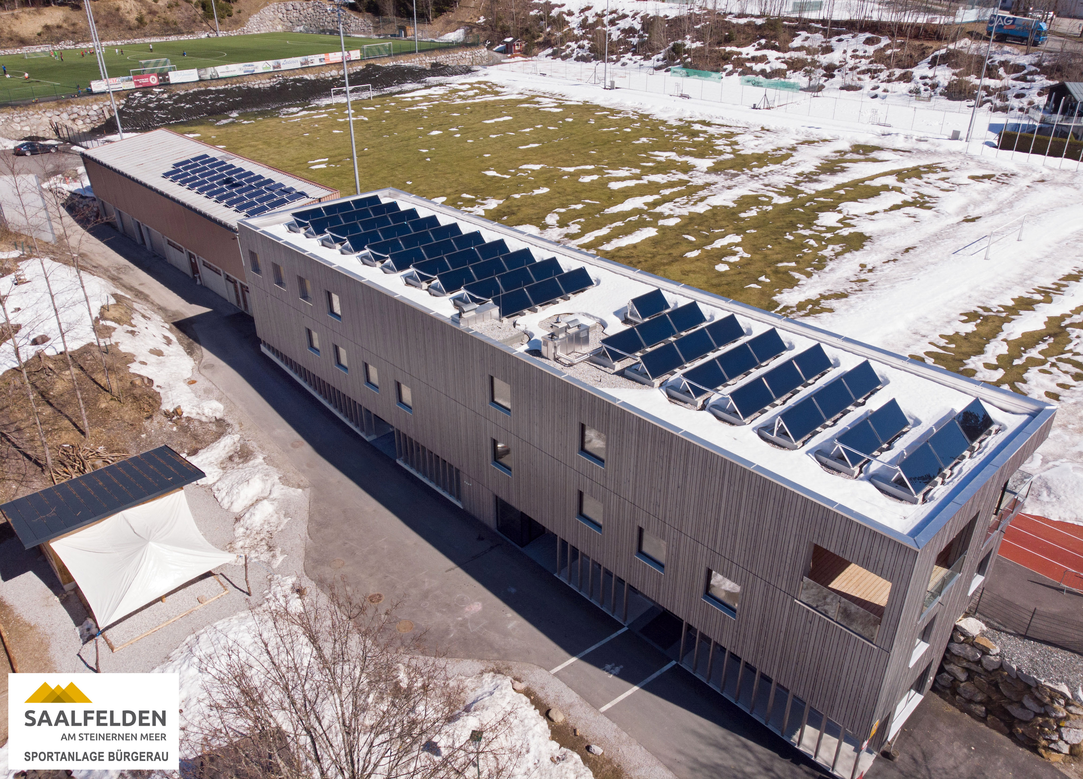 Das Sportzentrum Bürgerau in Saalfelden wurde 2018 als energieeffizientes Multifunktionsgebäude mit Bewegungsraum, Kabinentrakt, Vereinslokal, Büro und Räumlichkeiten für den Waldkindergarten neu errichtet.