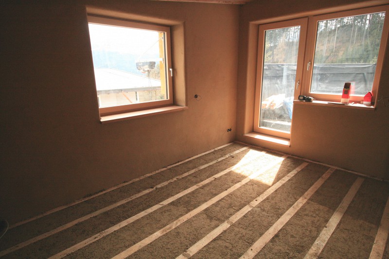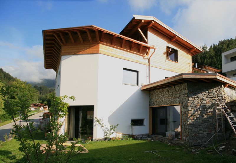 Neubau eines Einfamilienhauses in Mischbauweise (Holzriegelbau mit massiven Zwischenwänden) mit Stroh als Dämmmaterial und Lehmputz für ein gesundes Wohnklima.