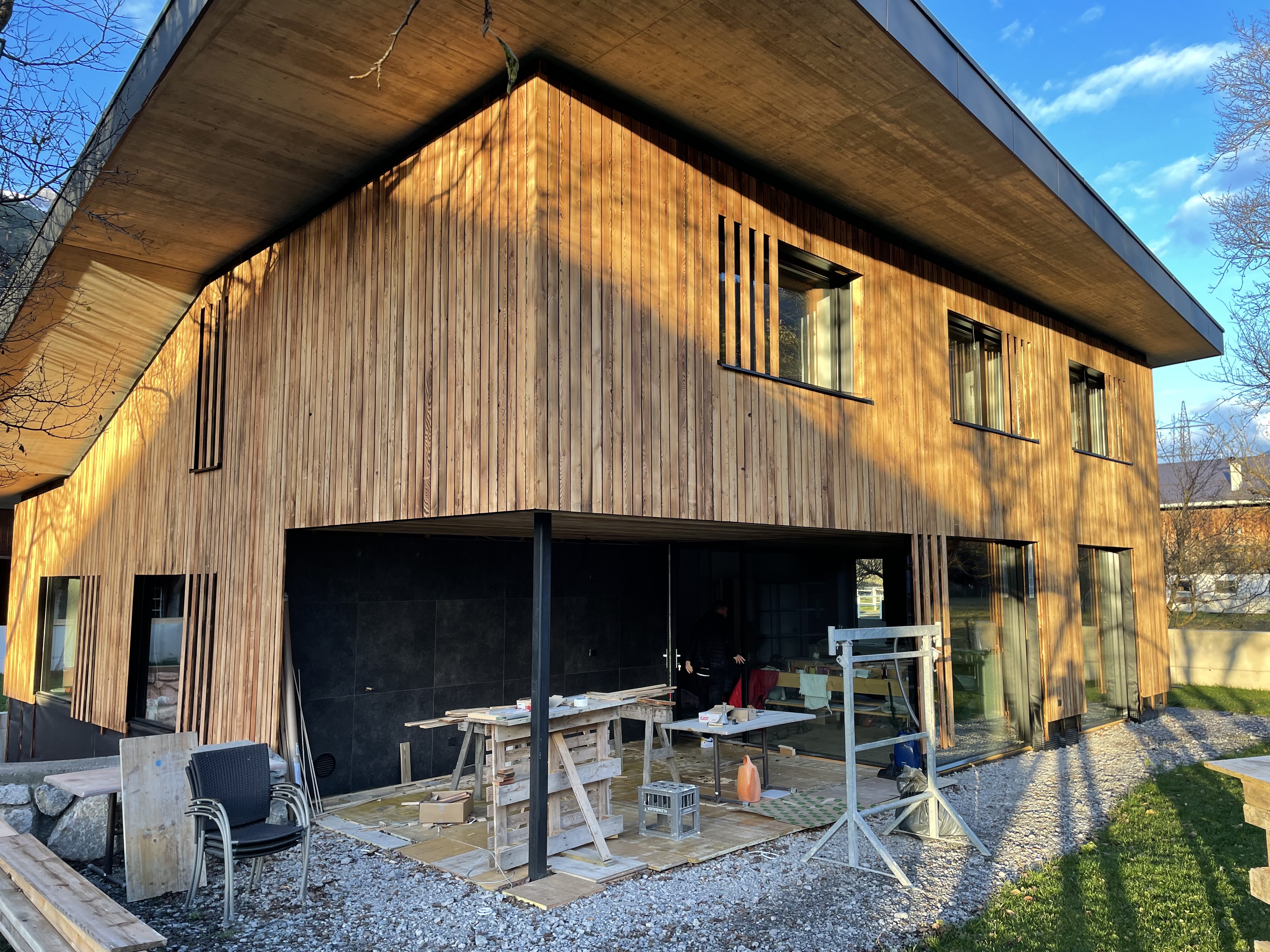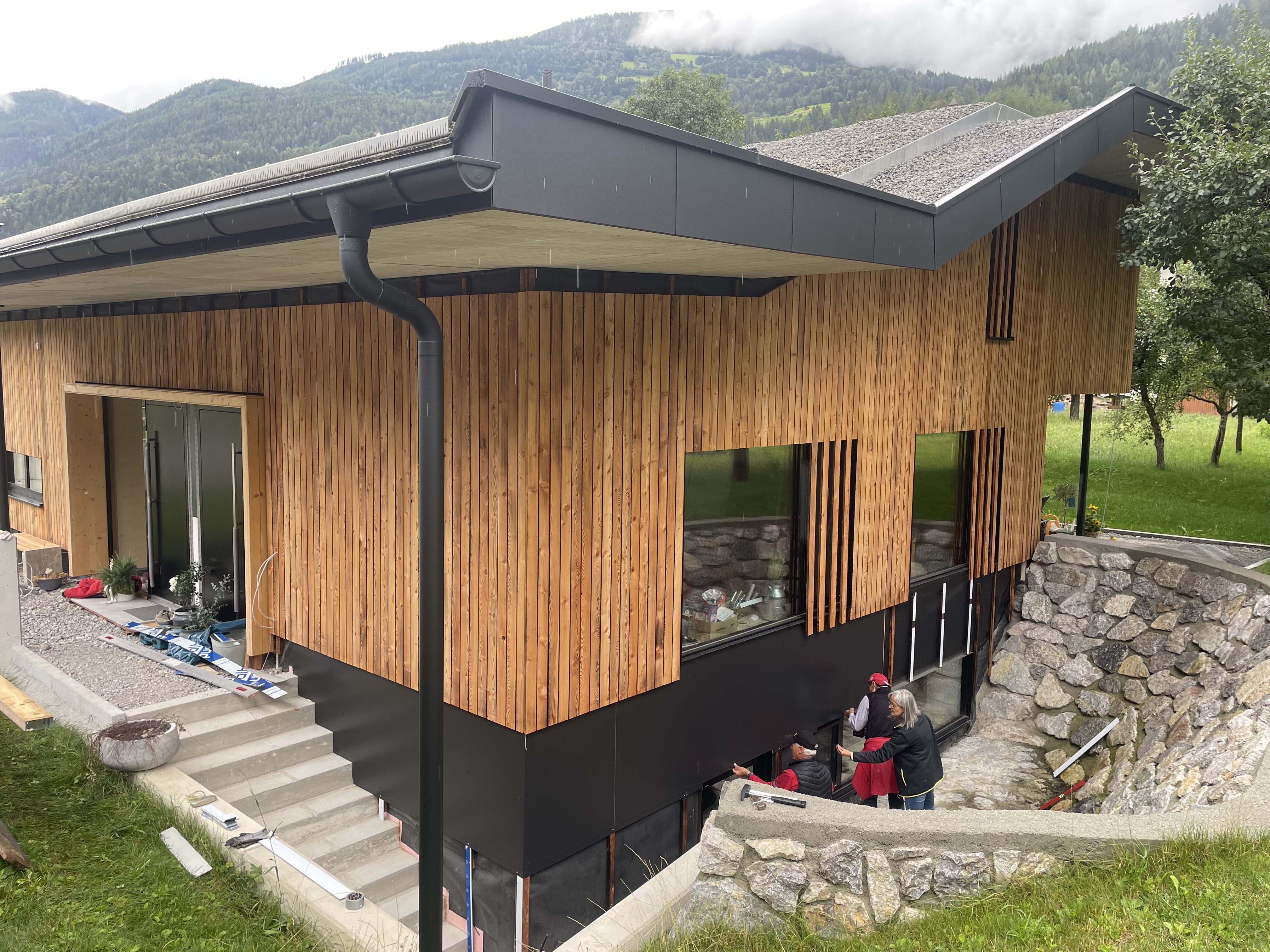 Unser Einfamilienhaus wurde zur Gänze in Betonbauweise hergestellt, eine hinterlüftete Lärchenholzfassade und große Verglasungen lassen von außen einen modernen, aber ländlichen Eindruck entstehen. Im Innenraum haben wir die Kombination aus schlichten Sichtbeton und gemütlichen Altholzverkleidungen gewählt. Die Fensterflächen und Verglasungen wurden in der Nord-Süd und Ost-West Achse so angeordnet, dass ein Durchblicken des Gebäudes in den zwei Hauptrichtungen ermöglicht wird. Die gut gedämmte Außenhülle und hohe Qualität bei den Fenstern auf der einen Seite sowie die Wärmepumpe und die kontrollierter Wohnraumlüftung auf der anderen Seite ermöglichen einen Niedrigenergiestandard.