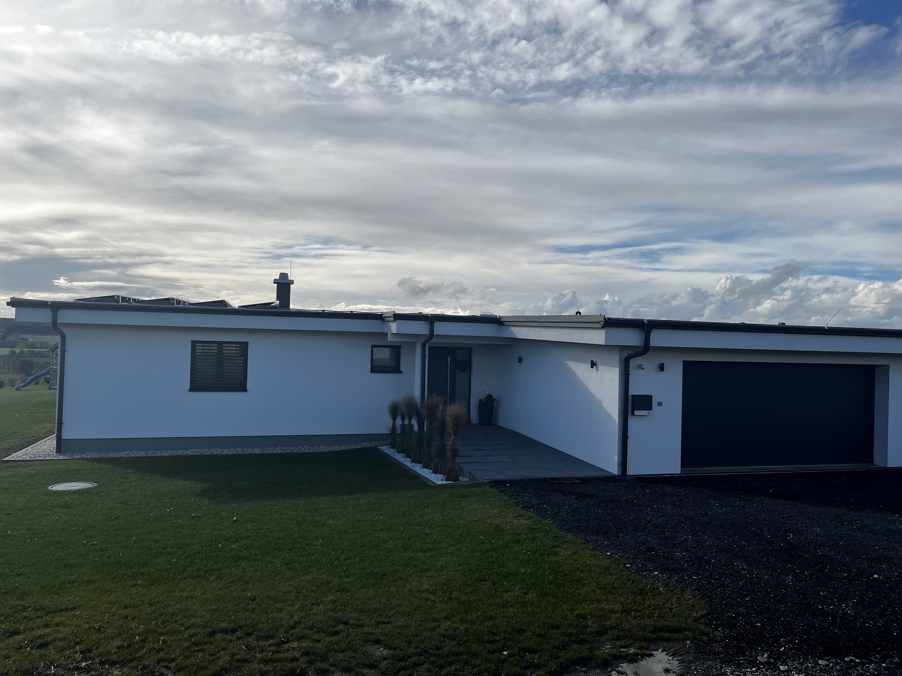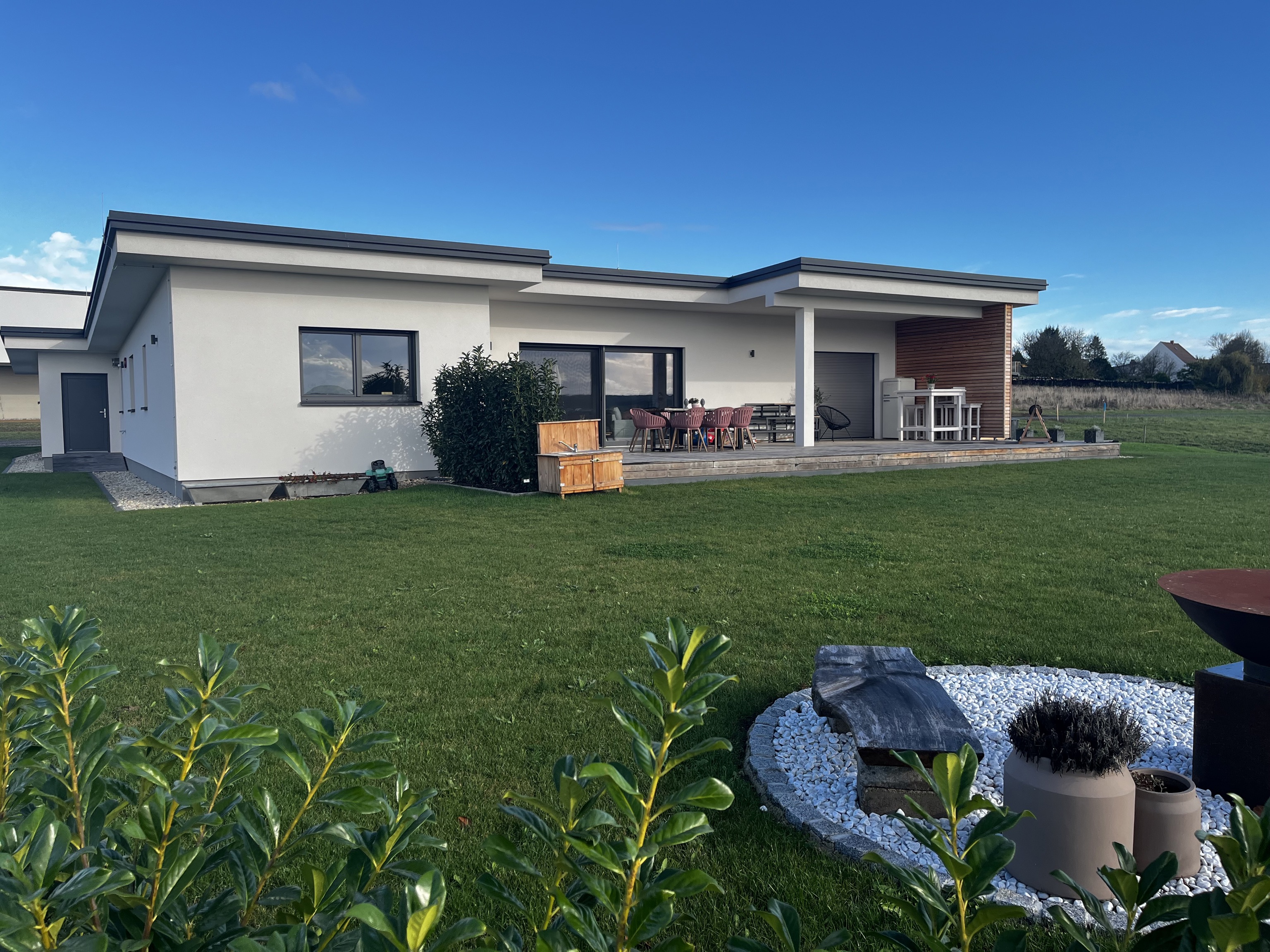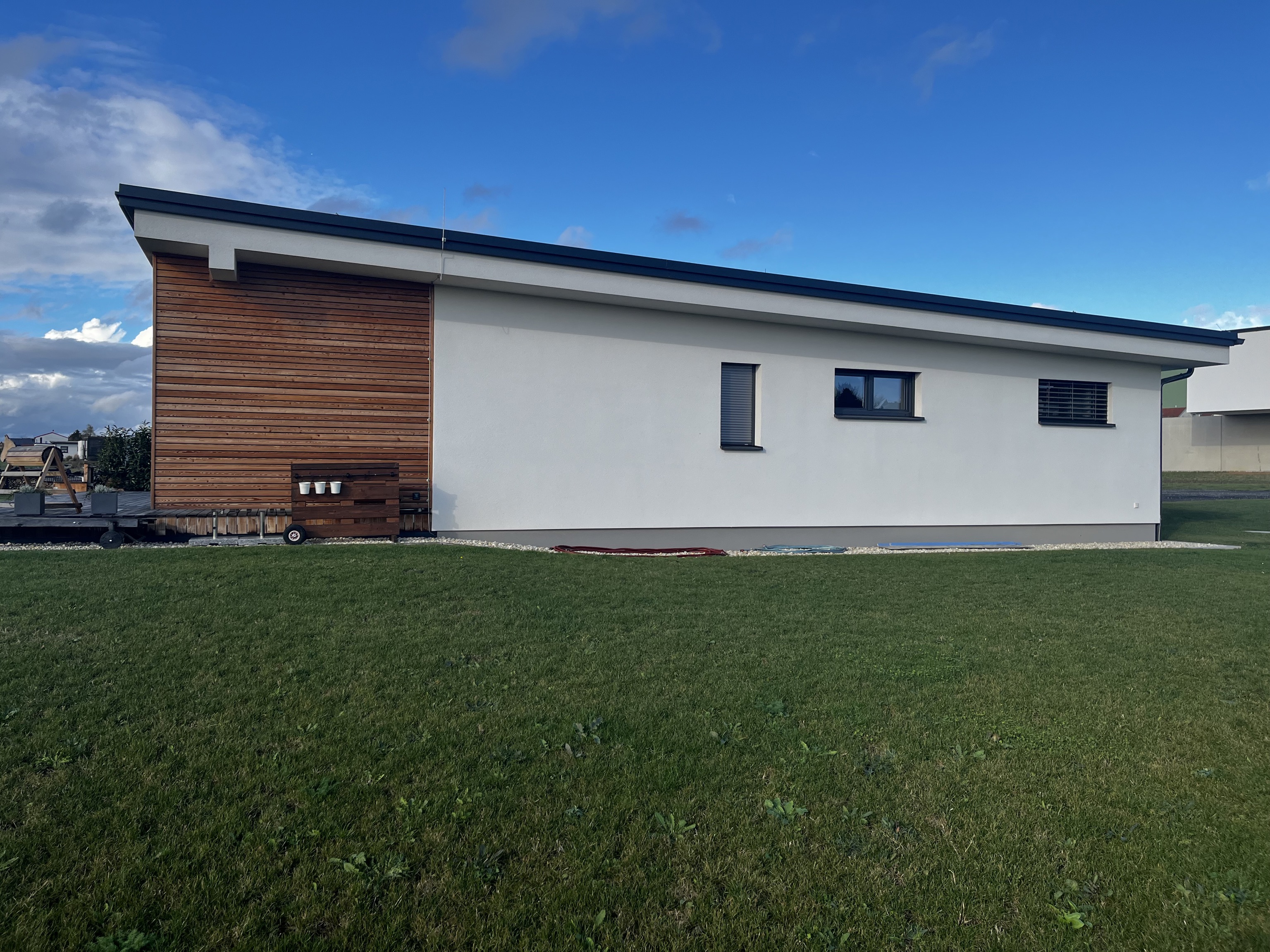 Das Einfamilienhaus in Großpetersdorf präsentiert sich als moderner, eingeschossiger Baukörper in konsequenter Holzriegelbauweise und setzt ein klares Zeichen für nachhaltige Architektur. Das charakteristische, elegant geneigte Pultdach mit einer Neigung von 2° unterstreicht die zeitgemäße Formensprache und ermöglicht zugleich eine optimale Integration der Photovoltaikanlage. Auch die Garage folgt dem konstruktiven Prinzip des Holzbaus und fügt sich harmonisch in das Gesamtbild ein. Bei der Materialwahl wurde größter Wert auf ökologische und wohngesunde Baustoffe gelegt: Neben Holzfaser- und Zellulosedämmungen kommen ressourcenschonende Funderplan Biofaserplatten zum Einsatz. So verbindet das Gebäude ein wegweisendes Energiekonzept mit hoher architektonischer Qualität und außergewöhnliche