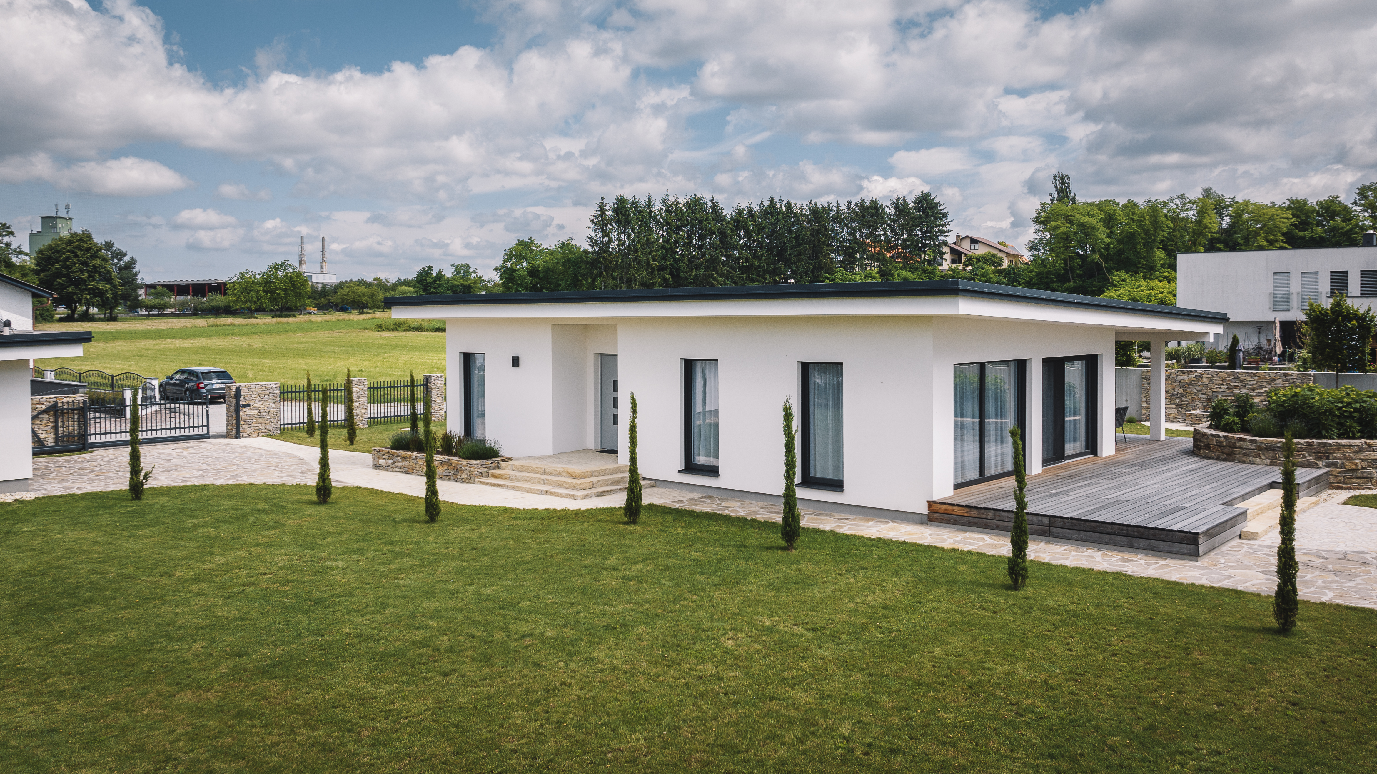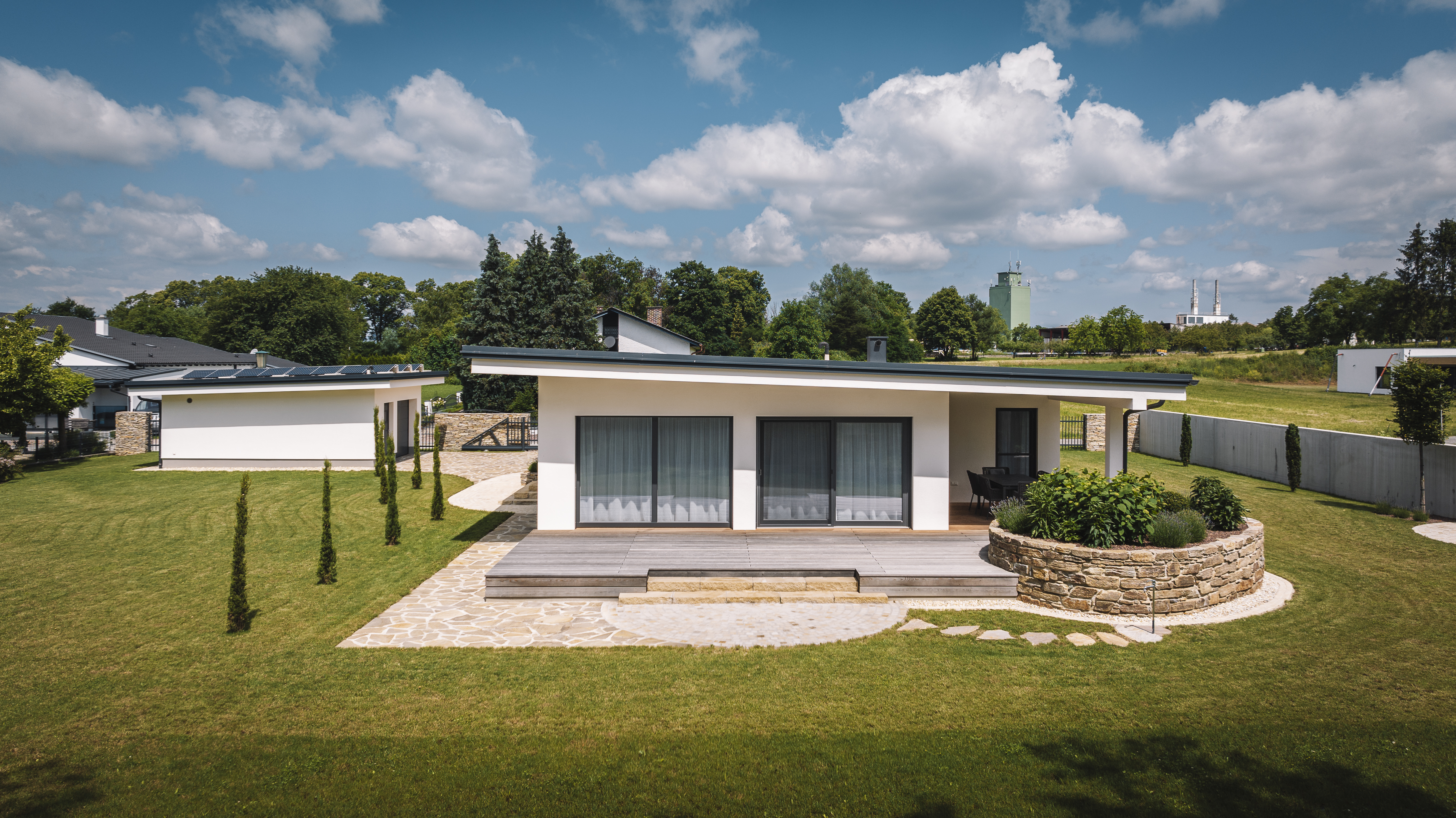 Das vorgestellte Einfamilienwohnhaus in Großpetersdorf ist ein eingeschossiges Gebäude in Holzriegelbauweise, ausgestattet mit einem innovativen Pultdach mit einer Neigung von 2°. Die zugehörige Garage, ebenfalls in Holzriegelbauweise, verfügt über das gleiche Pultdachdesign. Umweltfreundlichkeit und Nachhaltigkeit stehen bei diesem Projekt im Vordergrund. Neben der Verwendung von Holzfaser- und Zellulosedämmung wurde auch besonderer Wert auf ökologische Materialien wie Funderplan Biofaserplatten und Pullex hightec lasierende Holzteile gelegt.