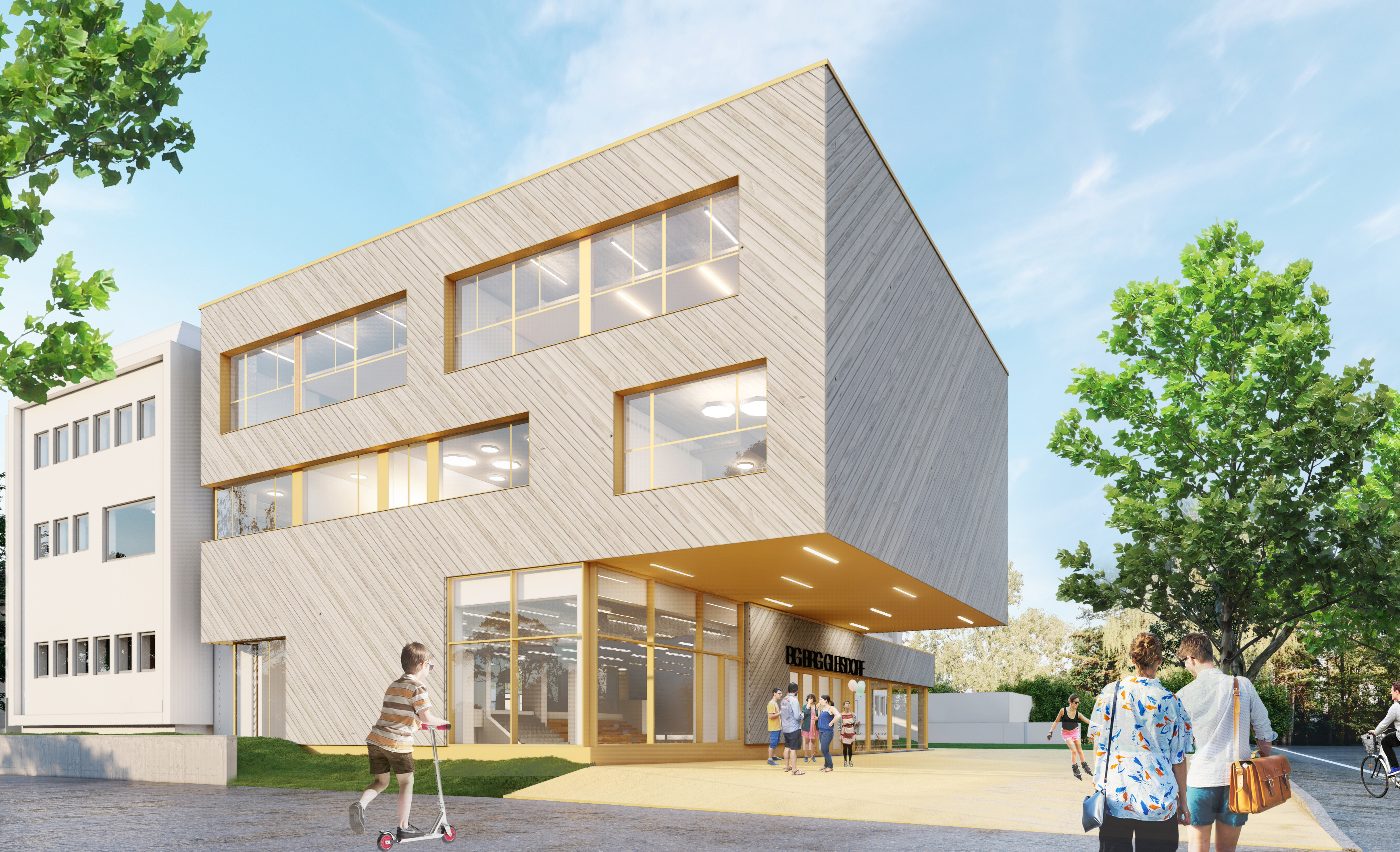 Der 3-geschossige Baukörper ist charakterisiert durch die horizontale Schichtung zweier Elemente: der längs gerichteten Aula und der 90° verschwenkten Obergeschosse. Dadurch erhält der klar gegliederte Baukörper seine Spannung und bildet eine Auskragung als markante überdachte Eingangszone ab.