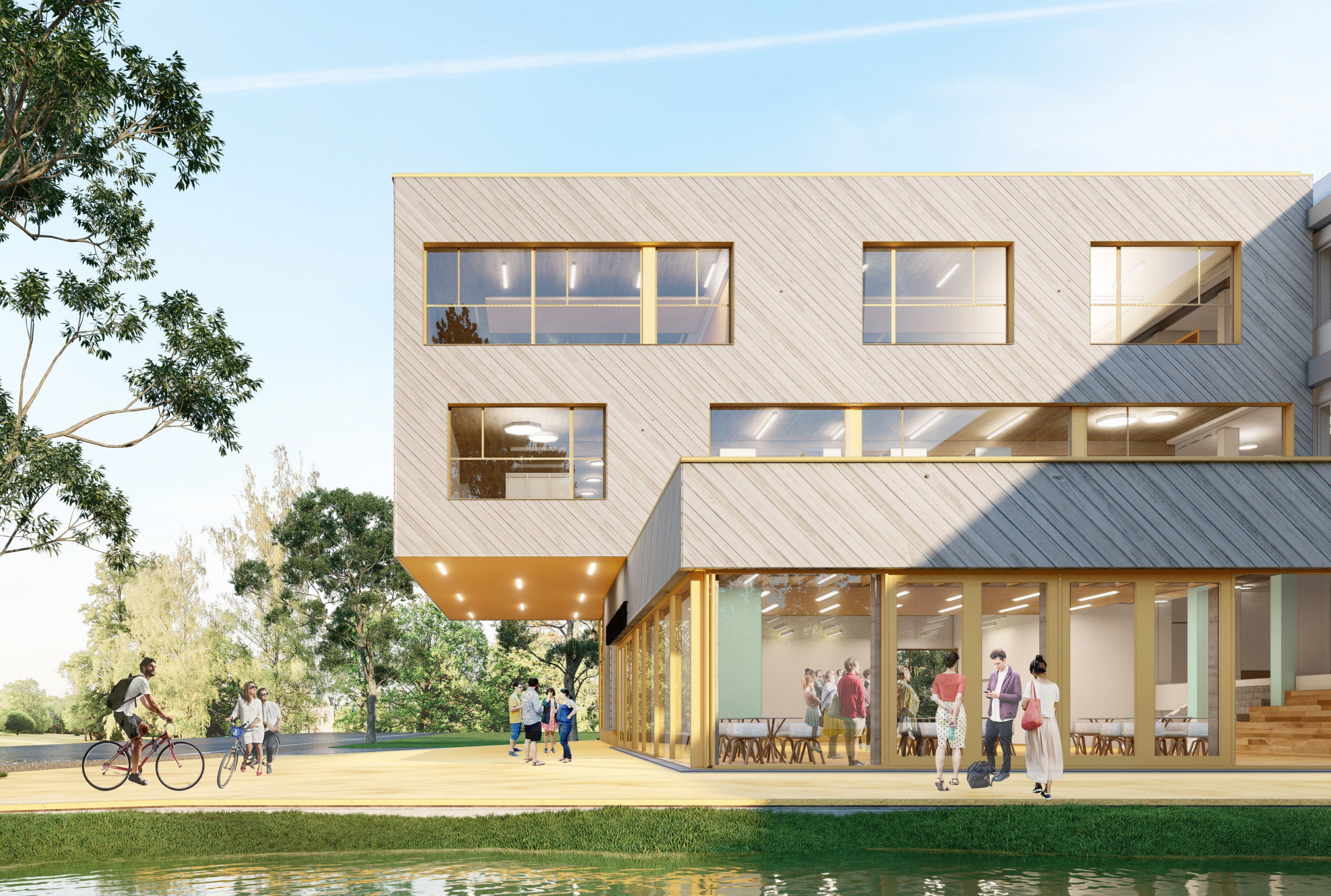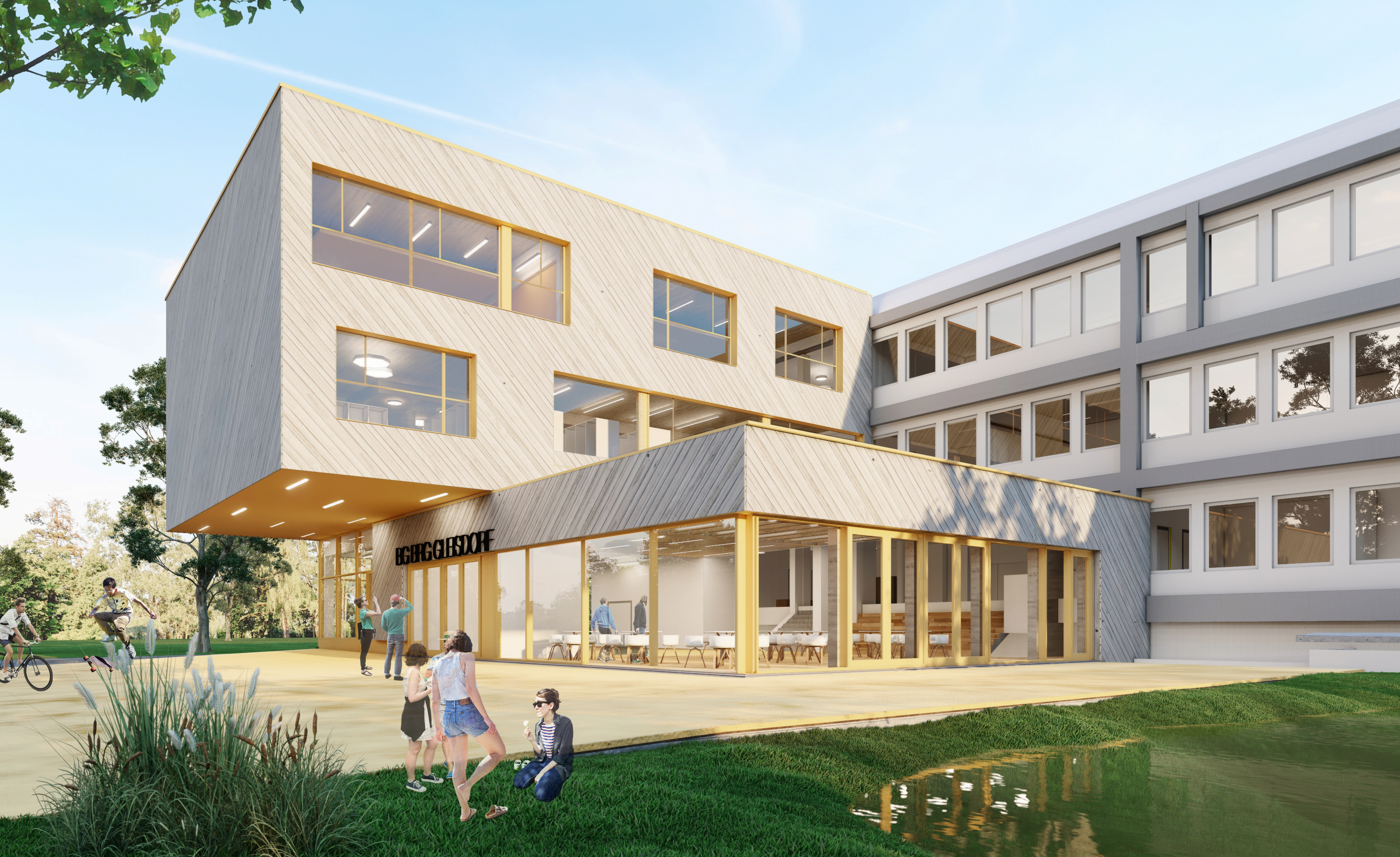 Der neue Gebäudeteil ist grundsätzlich als konstruktiver Holzbau konzipiert. Die homogene Hülle aus diagonalen Holzlamellen und großzügigen Fensterelemente gibt dem Baukörper eine urbane und abstrakte Erscheinung.
