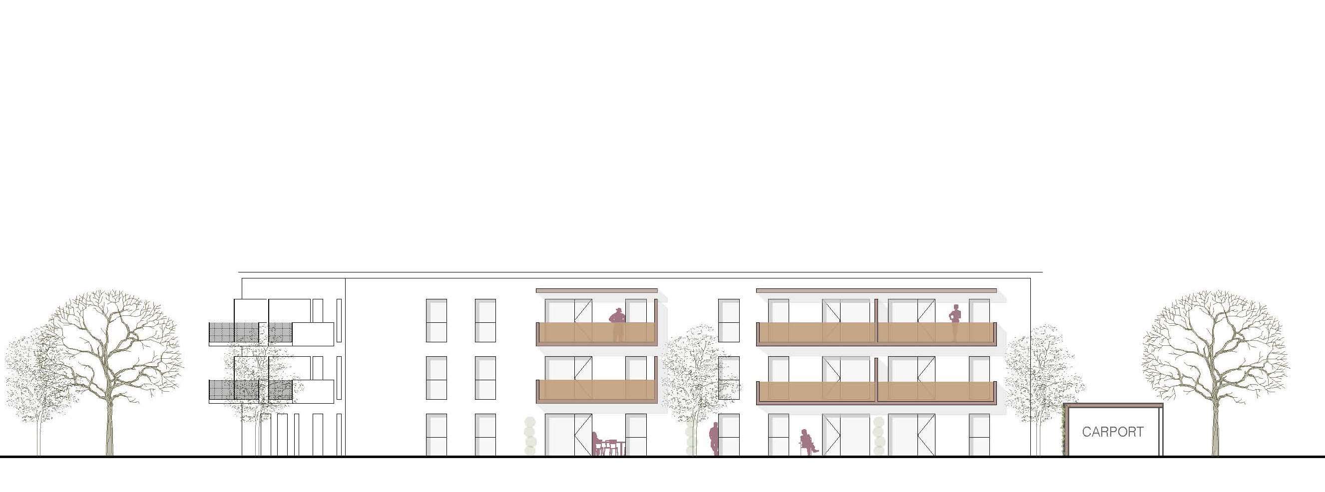 Der südliche L-förmige Baukörper B ist 3-geschoßig. Der nördliche L-förmige Baukörper A ist 4-geschoßig und wird im Westen zur vorgesehenen Einfamilienhausbebauung 3-geschoßig abgestuft errichtet.