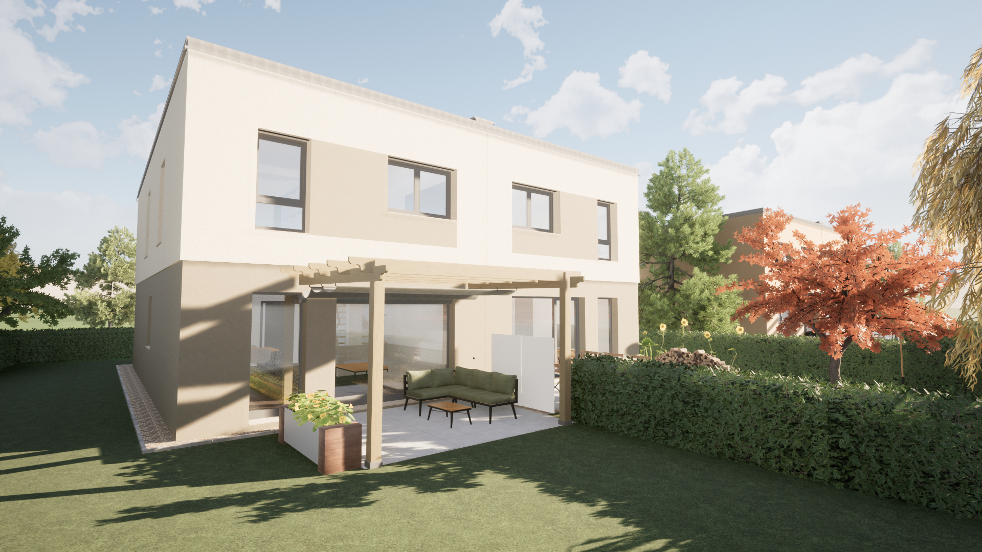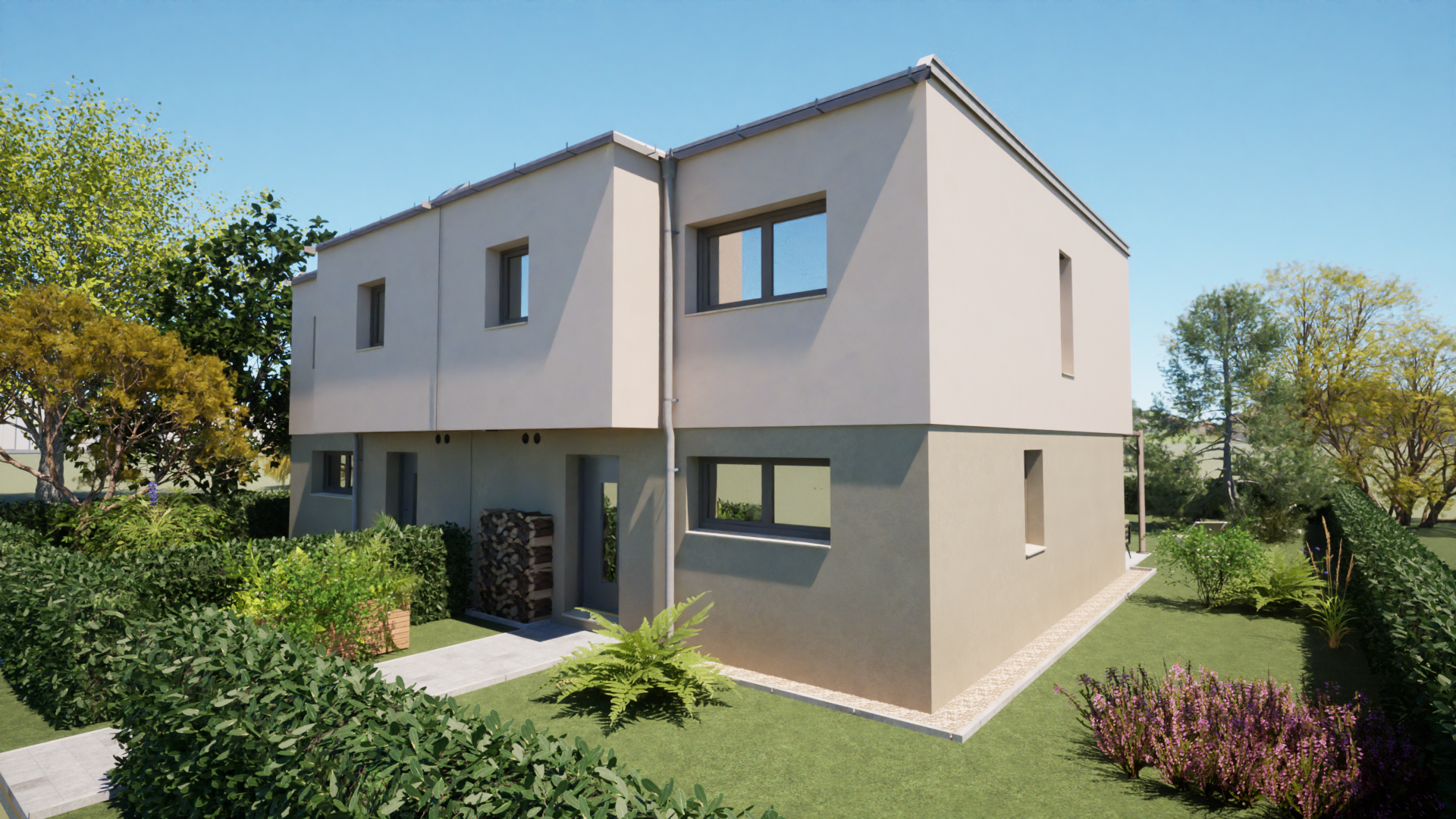 Moderne Wohnhausanlage mit 1815 m² WNF in sonniger Lage in Theresienfeld. Acht Doppelhäuser mit je 2 Einheiten bieten insgesamt 16 Wohneinheiten in Niedrigstenergiehausqualität.