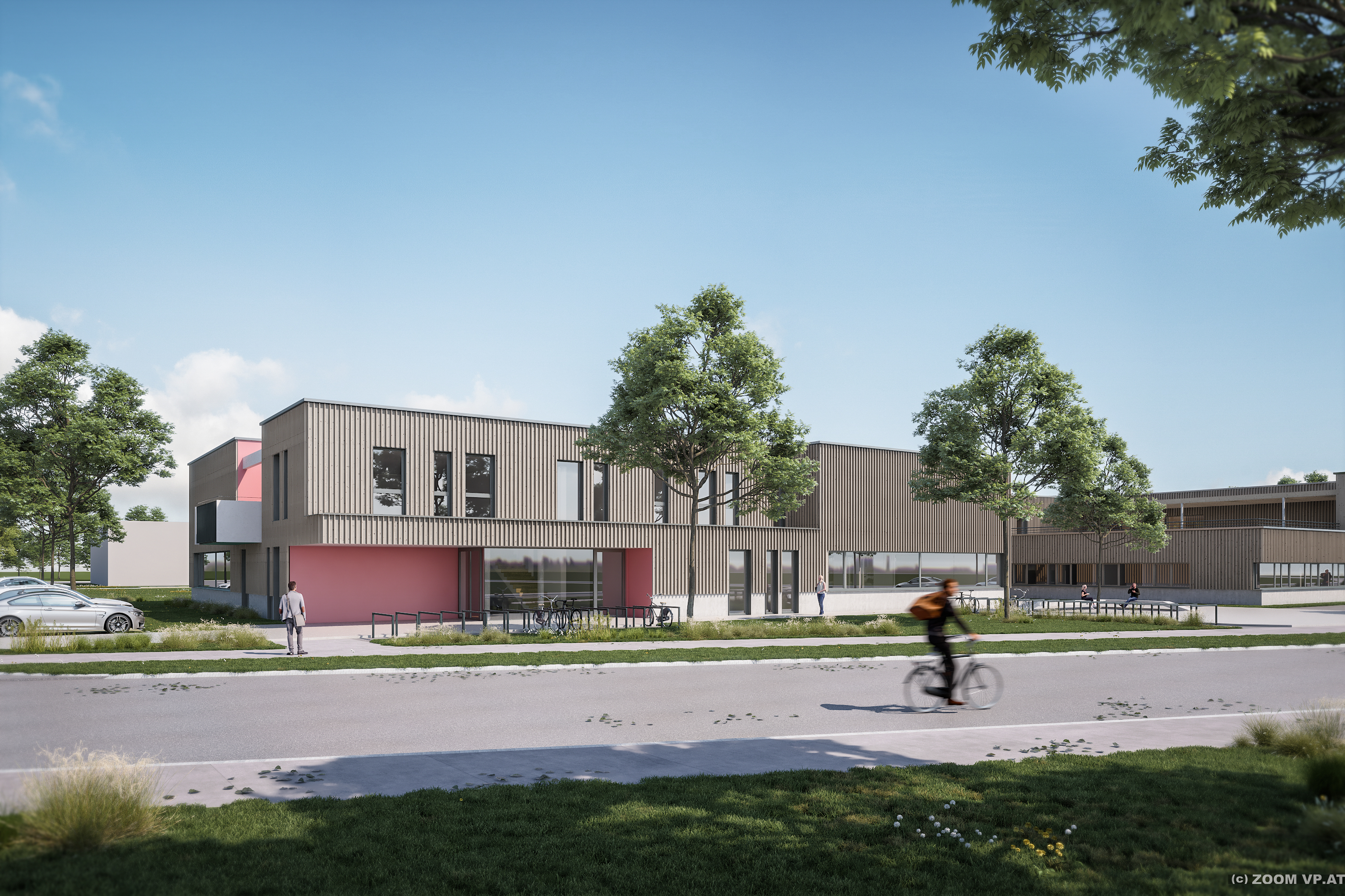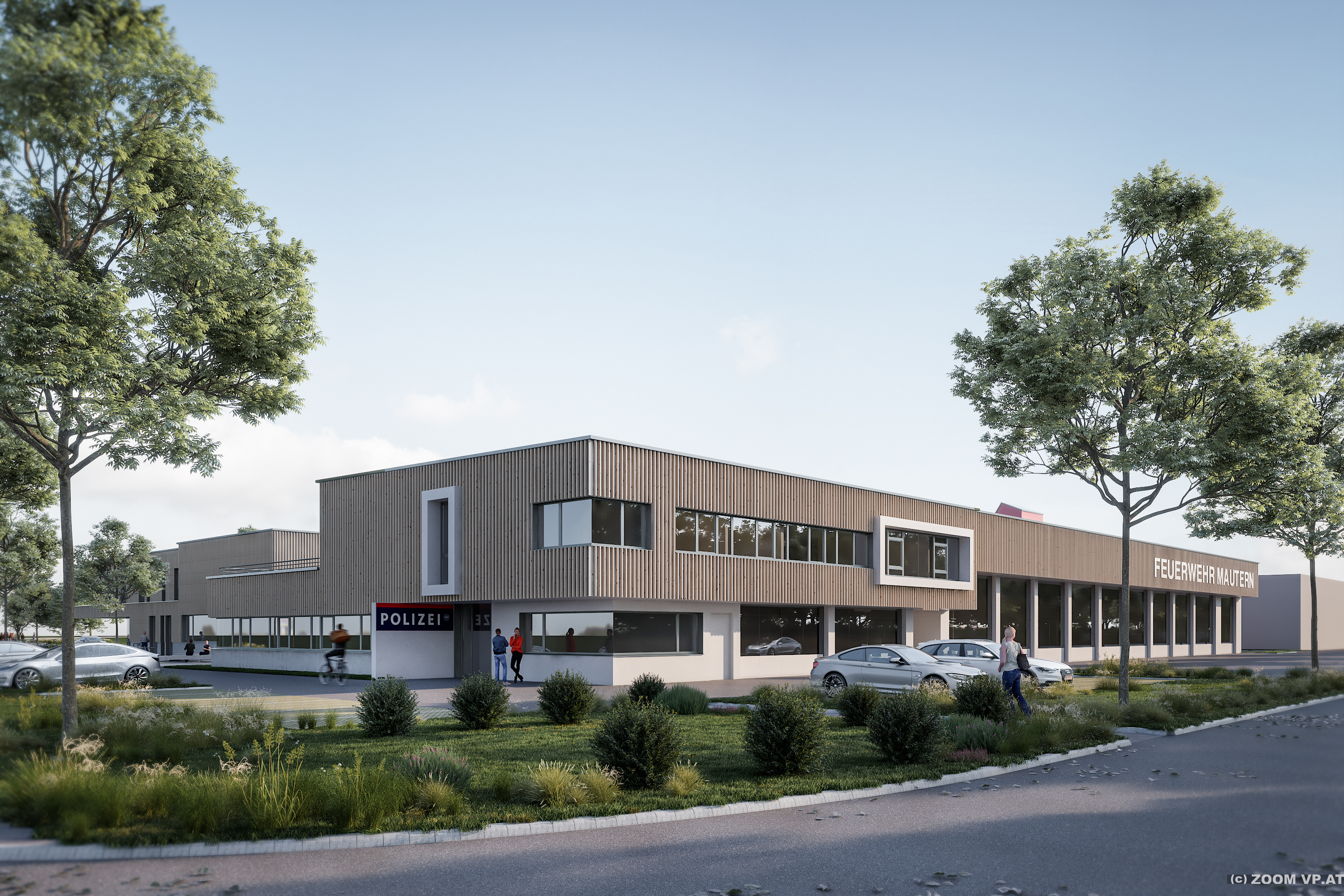 Im westlichen Baukörper ist die Polizeiinspektion und die Feuerwehr, im östlichen Gebäude der Veranstaltungsbereich und das Musikheim untergebracht. Die Abfallsammelstelle ist an der nordwestlichen Ecke des Grundstückes situiert.