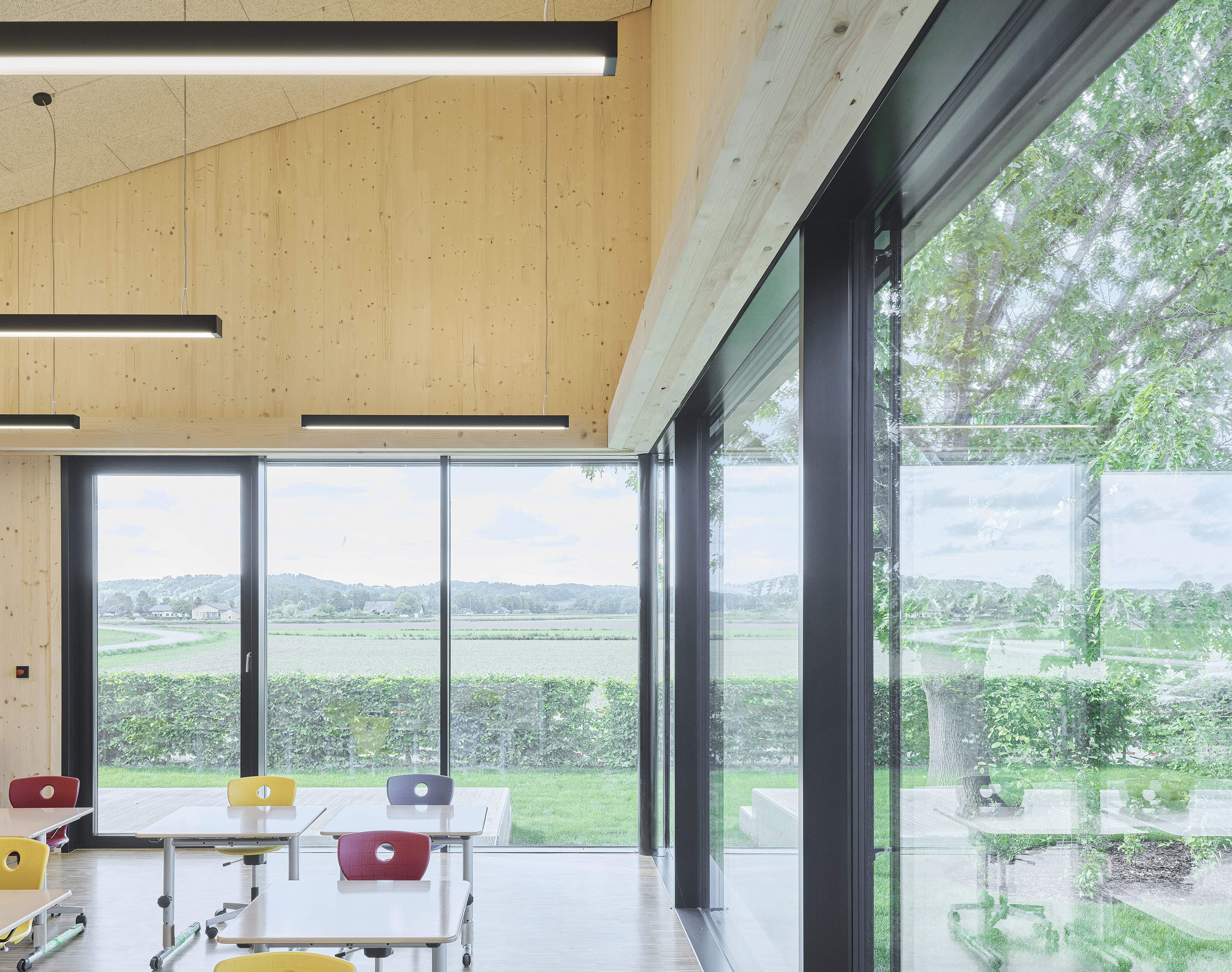 Mit dem Neubau einer Ganztagesschule (GTS) erhält die Volksschule St. Georgen an der Stiefing in der Steiermark einen hochwertigen Zubau, der sich durch ein großzügiges Raumkonzept, flexibel nutzbare Außenbereiche, nachhaltige Bauweise und Energieautarkie auszeichnet. Das Gebäude wird konstruktiv in Holz errichtet, innere Oberflächen bestehen ebenfalls aus Holz bzw. Holzwerkstoffen. Die vorgehängte Fassade hat einen sortenreinen Aufbau aus Faserzementplatten mit dahinter liegender Holzfaserdämmplatte, auch die Schrägdächer sind mit Holzfaserdämmplatte gedämmt. Die Stromversorgung erfolgt mittels PV-Modulen, die vollflächig auf den Schrägdächern verlegt sind. Heizung und Kühlung werden mittels Luftwärmepumpe und Fußbodenheizung bereitgestellt.