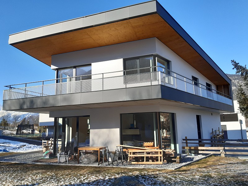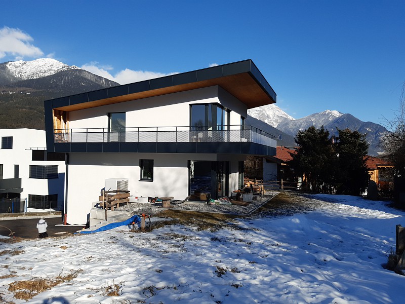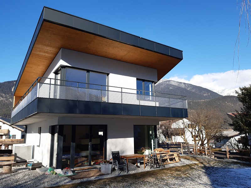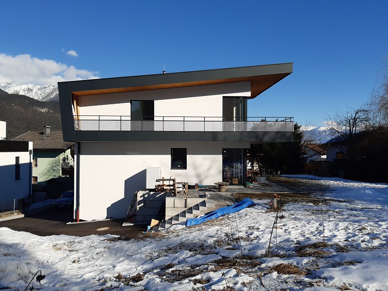 Der Bau ist in Massivbauweise ausgeführt, 25cm Ziegel + 20 cm Vollwärmeschutz. Das Dach mit einer Hinterlüftungsebene wurde aus Holz ausgeführt.