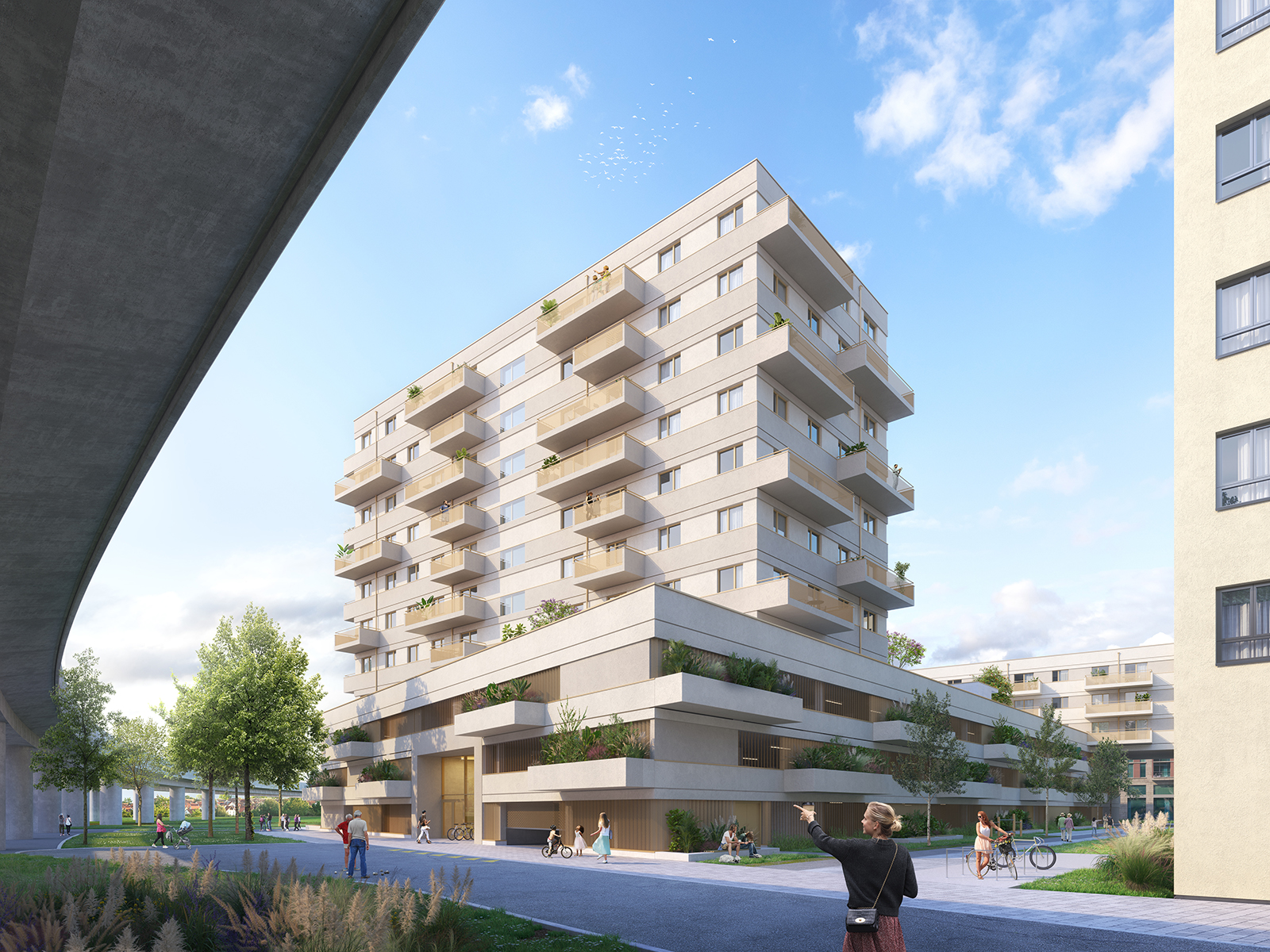 Tiefensonden und Wärmepumpen. Neben großzügigen Freiflächen, Balkonen und Dachterrassen bietet das Projekt ein Parkdeck, zahlreiche Fahrradstellplätze sowie PKW-Stellplätze für Bewohner und Besucher. Ein Kleinkinderspielplatz auf dem Dach des Parkdecks sowie ein gemeinschaftlicher Kinder- und Jugendspielplatz sorgen für familienfreundliche Aufenthaltsräume. Hier entsteht ein urbaner, grüner Lebensraum mit hoher Wohnqualität und optimaler Anbindung.