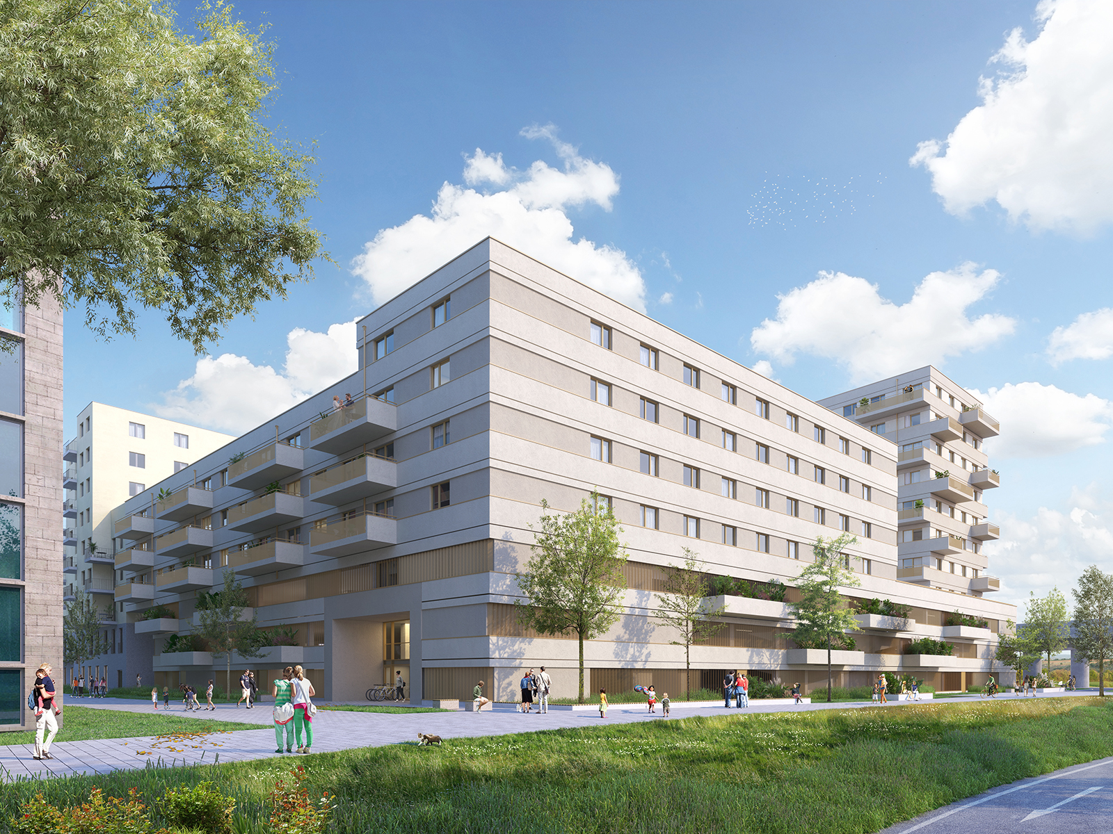 Tiefensonden und Wärmepumpen. Neben großzügigen Freiflächen, Balkonen und Dachterrassen bietet das Projekt ein Parkdeck, zahlreiche Fahrradstellplätze sowie PKW-Stellplätze für Bewohner und Besucher. Ein Kleinkinderspielplatz auf dem Dach des Parkdecks sowie ein gemeinschaftlicher Kinder- und Jugendspielplatz sorgen für familienfreundliche Aufenthaltsräume. Hier entsteht ein urbaner, grüner Lebensraum mit hoher Wohnqualität und optimaler Anbindung.